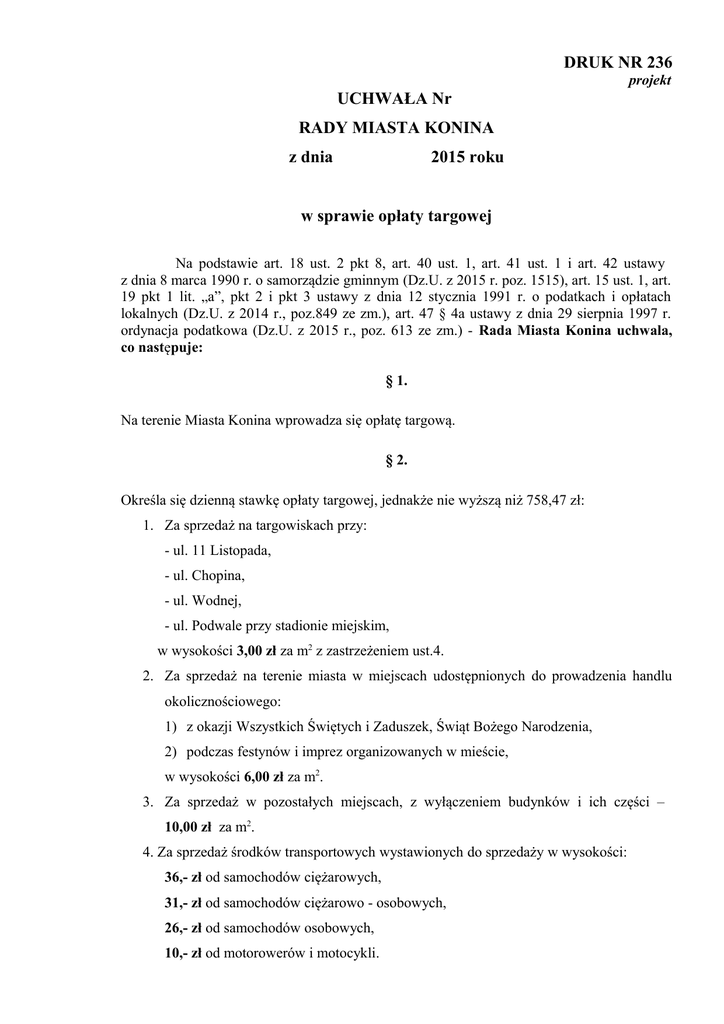 DRUK NR 236 projekt UCHWAŁA Nr RADY MIASTA KONINA z dnia 2015 roku w sprawie opłaty targowej Na podstawie art. 18 ust. 2 pkt 8, art. 40 ust. 1, art. 41 ust. 1 i art. 42 ustawy z dnia 8 marca 1990 r. o samorządzie gminnym (Dz.U. z 2015 r. poz. 1515), art. 15 ust. 1, art. 19 pkt 1 lit. „a”, pkt 2 i pkt 3 ustawy z dnia 12 stycznia 1991 r. o podatkach i opłatach lokalnych (Dz.U. z 2014 r., poz.849 ze zm.), art. 47 § 4a ustawy z dnia 29 sierpnia 1997 r. ordynacja podatkowa (Dz.U. z 2015 r., poz. 613 ze zm.) - Rada Miasta Konina uchwala, co następuje: § 1. Na terenie Miasta Konina wprowadza się opłatę targową. § 2. Określa się dzienną stawkę opłaty targowej, jednakże nie wyższą niż 758,47 zł: 1. Za sprzedaż na targowiskach przy: - ul. 11 Listopada, - ul. Chopina, - ul. Wodnej, - ul. Podwale przy stadionie miejskim, w wysokości 3,00 zł za m2 z zastrzeżeniem ust.4. 2. Za sprzedaż na terenie miasta w miejscach udostępnionych do prowadzenia handlu okolicznościowego: 1) z okazji Wszystkich Świętych i Zaduszek, Świąt Bożego Narodzenia, 2) podczas festynów i imprez organizowanych w mieście, w wysokości 6,00 zł za m2. 3. Za sprzedaż w pozostałych miejscach, z wyłączeniem budynków i ich części – 10,00 zł za m2. 4. Za sprzedaż środków transportowych wystawionych do sprzedaży w wysokości: 36,- zł od samochodów ciężarowych, 31,- zł od samochodów ciężarowo - osobowych, 26,- zł od samochodów osobowych, 10,- zł od motorowerów i motocykli. § 3. Opłata targowa wymieniona w § 2 ust. 1, 2 i 3, naliczana jest za każdy rozpoczęty m 2 powierzchni zajętej pod towar wystawiony do sprzedaży. § 4. 1. Zarządza się pobieranie opłaty targowej w drodze inkasa. 2. Inkasentami ustala się: 1) Przedsiębiorstwo Gospodarki Komunalnej i Mieszkaniowej w Koninie Sp. z o.o. - Targowisko przy ul. 11 Listopada i ul. Chopina 2) Gminną Spółdzielnię „SCh” w Koninie - Targowisko przy ul. Wodnej 3) Miejski Ośrodek Sportu i Rekreacji w Koninie - Targowisko przy stadionie miejskim 4) Urząd Miejski w Koninie - w pozostałych przypadkach. 3. Wynagrodzenie dla inkasentów określonych w ust.2 pkt 1 i 2 ustala się w wysokości 1 % pobranej opłaty targowej. 4. Termin płatności dla inkasentów ustala się na dzień następujący po ostatnim dniu dekady każdego miesiąca. § 5. Osoby dokonujące sprzedaży, zobowiązane są dokonać zapłaty, opłaty targowej, w dniu dokonywania sprzedaży: inkasentowi, w kasie lub na rachunek bankowy Urzędu Miejskiego w Koninie. § 6. Zwalnia się od opłaty targowej sprzedaż, dokonywaną na terenie Bulwaru Nadwarciańskiego, na terenie Parku im. F. Chopina oraz na terenie Placu Wolności w Koninie. § 7. Wykonanie uchwały powierza się Prezydentowi Miasta Konina. § 8. Z dniem wejścia w życie niniejszej uchwały, traci moc Uchwała Nr 246 Rady Miasta Konina z dnia 30 listopada 2011 roku w sprawie opłaty targowej oraz Uchwała Nr 384 Rady Miasta Konina z dnia 27 czerwca 2012 roku w sprawie zmiany Uchwały Nr 246 Rady Miasta Konina z dnia 30 listopada 2011 r. w sprawie opłaty targowej. § 9. Uchwała wchodzi w życie z dniem 1 stycznia 2016 r. i podlega ogłoszeniu w Dzienniku Urzędowym Województwa Wielkopolskiego. Przewodniczący Rady Miasta Konina Wiesław Steinke Opiniował radca prawny Radosław Szatkowski UZASADNIENIE do Uchwały Nr Rady Miasta Konina z dnia 2015 roku w sprawie opłaty targowej Opłata targowa na terenie miasta Konina jest pobierana za sprzedaż na targowisku przy ul. 11 Listopada, przy ul. Wodnej, Chopina oraz przy ul. Podwale (stadion miejski) oraz w innych miejscach udostępnionych do prowadzenia handlu okolicznościowego. Z uwagi na zmianę art. 15 ust. 1 ustawy z dnia 12 stycznia 1991 roku o podatkach i opłatach lokalnych (Dz. U. z 2014 r., poz. 849 ze zm.), od dnia 1 stycznia 2016 r. rada gminy może wprowadzić opłatę targową. W dotychczasowym stanie prawnym opłata targowa jest świadczeniem obligatoryjnym. W związku z tym gminy muszą pobierać opłatę targową nawet w sytuacji, gdy koszty jej poboru zdecydowanie przekraczają wpływy z tego tytułu do budżetu gminy lub gdy są na minimalnym poziomie. Ustawodawca nie zlikwidował tej opłaty, jednakże wprowadził przepis, zgodnie z którym pobieranie jej nie będzie obowiązkowe. W związku z powyższym, aby w roku 2016 taka opłata mogła być pobierana, niezbędne jest podjęcie uchwały wprowadzającej opłatę targową. Określone w niniejszym projekcie uchwały stawki opłaty targowej, pobór tych opłat w drodze inkasa oraz określenie inkasentów i wysokość wynagrodzenia za inkaso, pozostają na takim samym poziomie jak w obowiązującej do dnia 31.12.2015 r. Uchwale Nr 246 Rady Miasta Konina z dnia 30.11.2011 r. Minister Finansów w formie Obwieszczenia publikowanego w Monitorze Polskim, określa corocznie górną wysokość stawki dziennej opłaty targowej, która na rok 2016 wynosi 758,47 zł. Zastępca Prezydenta Miasta Konina /-/ Sebastian Łukaszewski