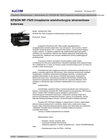 4uCOM Utworzono : 02 marzec 2017 Urządzenia Wielofunkcyjne > Atramentowe A3 > EPSON WF-7525 Urządzenie wielofunkcyjne atramentowe kolorowe EPSON WF-7525 Urządzenie wielofunkcyjne atramentowe kolorowe Model : EPSON WF-7525 EPSON WF-7525 Urządzenie wielofunkcyjne atramentowe kolorowe Producent : Epson Urządzenie WorkForce WF-7525 zostało zaprojektowane z uwzględnieniem potrzeb małych firm i biur domowych. Jest to jedna z dwóch drukarek wielofunkcyjnych A3+ w ofercie firmy Epson, a jednocześnie flagowy model w ofercie. To idealne urządzenie dla użytkowników takich jak graficy, architekci czy inżynierowie. Stanowi ono idealne połączenie atrakcyjnej ceny, niezawodności, prędkości oraz licznych dodatkowych funkcji zwiększających produktywność. W biurach o dużych wymogach zużycie papieru może zostać zmniejszone do 50% przy zastosowaniu niezwykle szybkiego druku dwustronnego A4 o prędkości do 7,7 stron na minutę w trybie monochromatycznym i 5,2 stron na minutę w trybie kolorowym4. Produktywność jest zwiększona poprzez zastosowanie podwójnej tacy na papier o wysokiej pojemności 500 arkuszy, która redukuje konieczność częstego uzupełniania i umożliwia wszechstronną obsługę nośników, a automatyczny podajnik dokumentów na 30 arkuszy umożliwia skanowanie, kopiowanie i faksowanie wielu stron. Automatyczny podajnik dokumentów umożliwia też dwustronne kopiowanie dokumentów formatu A4. Łączność Ethernet i Wi-Fi dostępna w standardzie daje możliwość współdzielenia tych korzyści przez wielu użytkowników. Umożliwiając uzyskanie tekstu o biznesowej jakości oraz intensywnych kolorów, ekonomiczna drukarka WF-7525 pozwala na zmniejszenie o 50% kosztu strony i nawet o 80% mniejsze zużycie energii2 w porównaniu z konkurencyjnymi drukarkami laserowymi. Użytkownik uzyskuje dzięki temu jeszcze korzystniejsze zmniejszenie kosztów i wpływu na środowisko. Oprócz tego jest bardziej przystępna cenowo, niż porównywalna drukarka laserowa. Drukarka WF-7525 jest dostępna z usługą Epson Connect, zapewniając jeszcze większą elastyczność i swobodę, dzięki czemu użytkownicy mogą szybko i łatwo drukować bezprzewodowo obrazy oraz dokumenty ze smartfonów i tabletów6. Ponadto można drukować z każdego miejsca na świecie, wysyłając dokumenty i obrazy e-mailem bezpośrednio do drukarki. Najważniejsze cechy: � Drukarka, skaner, kopiarka, faks � 4-kolorowa drukarka atramentowa � Oddzielne pojemniki z tuszem fotograficznym�Epson DURABrite™ Ultra � Rozdzielczość druku do 5760 x 1440 dpi kontakt : - [email protected] Strona 1 4uCOM Utworzono : 02 marzec 2017 Urządzenia Wielofunkcyjne > Atramentowe A3 > EPSON WF-7525 Urządzenie wielofunkcyjne atramentowe kolorowe EPSON WF-7525 Urządzenie wielofunkcyjne atramentowe kolorowe � Minimalna kropla atramentu 2 pl. � Szybkość druku do 34 str./min. mono i kolor � Rozdzielczość skanera 1200n x 1200�dpi � Faks 33,6 kbps � Automatyczny�duplex � Interfejs USB, host USB,�karta sieciowa�Ethernet�10/100 Base-TX i sieć bezprzewodowa � Wyświetlacz LCD 6,3 cm Dane techniczne: Drukarka Technologia druku 4-kolorowa drukarka atramentowa�C,�M,�Y,�K Technologia zmiennej wielkości kropli atramentu Kropla o minimalnej wielkości 3 pikolitra Epson Ultra Mirco Dot™ Atramenty�Epson DURABrite™ Ultra 384 dysz�czarnych i po 128 dysz na każdy kolor�C,�M,�Y Wyświetlacz LCD 6,3 cm Rozdzielczość Do 5760 x 1440�dpi Szybkość druku Do 34 str./min. mono i�kolor Obsługa papieru Formaty papieru A3+, A3, A4, Letter, Legal, 20 x 25 cm, 13 x 20 cm, 13 x 18 cm, 10 x 15 cm, 9 x 13 cm, A5, A6, B4, B5, 16:9 wide size, Envelopes: No.10, DL, C4, C6 Marginesy kontakt : - [email protected] Strona 2 4uCOM Utworzono : 02 marzec 2017 Urządzenia Wielofunkcyjne > Atramentowe A3 > EPSON WF-7525 Urządzenie wielofunkcyjne atramentowe kolorowe EPSON WF-7525 Urządzenie wielofunkcyjne atramentowe kolorowe 0�mm z każdej strony, ustawiane w sterowniku urządzenia Podajnik papieru Na 500 arkuszy Automatyczny podajnik na 30 arkuszy Automatyczny duplex Gramatura 64�g/m� - 256�g/m� Skaner Typ skanera CIS Format A3 Rozdzielczość 1200 x 1200 dpi Szybkość Mono, A4: 300dpi �- 0,9msec/line 600dpi - 1,5msec/line Kolor A4: 300dpi - 2,6msec/line 600dpi - 5,2msec/line Faks Szybkość transmisji 33,6 kbps Funkcje faksu Szybkie wybieranie, Ulubione, Faksowanie za pomocą komputera, Odbiór i zapis, Przełącznik czasowy, Auto Redial Pamięć kontakt : - [email protected] Strona 3 4uCOM Utworzono : 02 marzec 2017 Urządzenia Wielofunkcyjne > Atramentowe A3 > EPSON WF-7525 Urządzenie wielofunkcyjne atramentowe kolorowe EPSON WF-7525 Urządzenie wielofunkcyjne atramentowe kolorowe do 180 stron Interfejsy USB 2.0 Typ B Host USB Ethernet�(100 Base-TX / 10 Base-T) Obsługiwane karty pamięci Compact Flash, MicroDrive, Memory Stick, Memory Stick Duo*, MagicGate Memory Stick, MagicGate Memory Stick Duo*, Memory Stick PRO, Memory Stick PRO Duo*, Memory Stick PRO-HG Duo*, Memory Stick Micro M2*, SD, SDHC, SDXC, MiniSD*, MiniSDHC*, MicroSD*, MicroSDHC*, Multi Media Card, MMCplus, MMCmobile <RS-MMC>*, MMCmicro*, xD-Picture,xD-Picture Type-M, xD-Picture Type-M+, xD-Picture Type-H * Wymagany adapter (do nabycia osobno) Ogólne Sterowniki Windows XP / XP-x64 / Vista / 7, Windows Server 2008 R2/2008/2003, Mac OS 10.4.11 lub nowszy Napięcie zasilające AC 220 - 240V Zużycie energii ok. 20 W podczas druku ok. 4,4 W w trybie uśpienia Zgodne z normą ENERGY STAR� Poziom hałasu do 48 dB(A) Wymiary (s x d x w) 559 x 418 x 365�mm Waga 18,9 kg Gwarancja 2 lata RTB Opcja 3 lata On-site: SESHQ1687, SESHQ1690, SESHQ1689 kontakt : - [email protected] Strona 4 4uCOM Utworzono : 02 marzec 2017 Urządzenia Wielofunkcyjne > Atramentowe A3 > EPSON WF-7525 Urządzenie wielofunkcyjne atramentowe kolorowe EPSON WF-7525 Urządzenie wielofunkcyjne atramentowe kolorowe Materały eksploatacyjne Atr