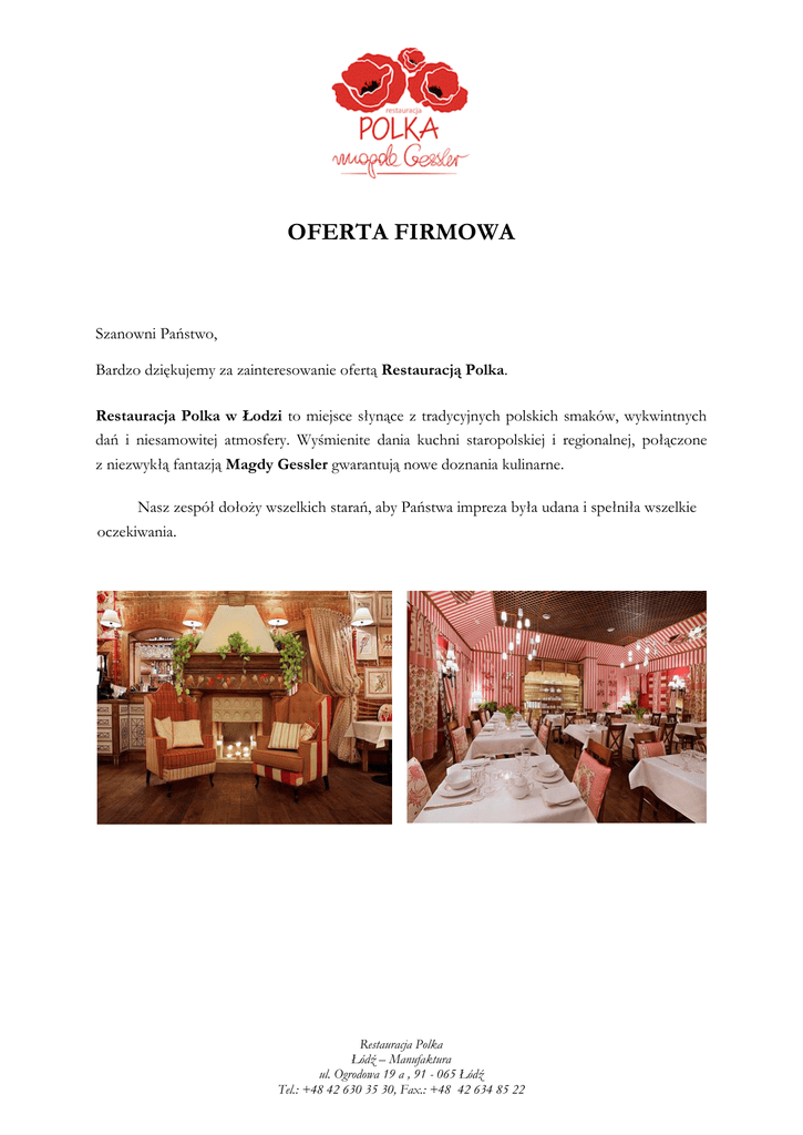 OFERTA FIRMOWA Szanowni Państwo, Bardzo dziękujemy za zainteresowanie ofertą Restauracją Polka. Restauracja Polka w Łodzi to miejsce słynące z tradycyjnych polskich smaków, wykwintnych dań i niesamowitej atmosfery. Wyśmienite dania kuchni staropolskiej i regionalnej, połączone z niezwykłą fantazją Magdy Gessler gwarantują nowe doznania kulinarne. Nasz zespół dołoży wszelkich starań, aby Państwa impreza była udana i spełniła wszelkie oczekiwania. Restauracja Polka Łódź – Manufaktura ul. Ogrodowa 19 a , 91 - 065 Łódź Tel.: +48 42 630 35 30, Fax.: +48 42 634 85 22 MENU I PRZYSTAWKI podane w stół /STARTERS Served Buffet style/ Wątróbka wiśniowa podana na prażonych jabłkach /Goose liver marinated in cherry, served with buttered apples/ Kosz pieczywa podany z pastą z makreli /Basket of bread with delicious mackerel paste/ Śledź w oleju z cebulą /Classic herring in linen oil & onions/ Domowy pasztet Polki /Polka’s homemade paté/ ZUPA /SOUP/ Pomidorowa domowa z kluseczkami /Homemade tomato soup with pasta/ Lub/or Zupa cebulowa po staropolsku / Old Polish onion soup/ Z PIECA /FROM THE OVEN/ Polędwiczka wieprzowa otulona boczkiem podana na sosie grzybowym z ziemniakami po polsku oraz warzywami skropionymi masłem ziołowym Pork tenderloin wrapped in bacon served on mushroom sauce with Polish style potatoes & vegetables Lub/or Chrupiące udko z kaczki w sosie rodzynkowym na jabłkach podawane z ziemniakami po polsku /Crispy duck on apples in raisin sauce served with Polish style potatoes / DESER /SWEET THING/ Szarlotka na gorąco podana z lodami waniliowymi /Homemade apple pie served with vanilla ice cream/ Lub/or Sernik w czekoladowej polewie /Homemade cheesecake coated in chocolate/ Cena brutto od osoby: 80,00 PLN + 10% serwisu Restauracja Polka Łódź – Manufaktura ul. Ogrodowa 19 a , 91 - 065 Łódź Tel.: +48 42 630 35 30, Fax.: +48 42 634 85 22 MENU II PRZYSTAWKI podane w stół /STARTERS Served Buffet style/ Wędzony łosoś na sosie musztardowym podany z cebulą, kaparami oraz ciemnym pieczywem /Slices of smoked salmon with mustard sauce served with onion, capers & brown bread/ Deska mięs pieczonych na styl Polski oraz pasztetu podane z marynatami /Polish style roasted meats and pate served with pickles / Łosoś gravad lax marynowany w burakach i żubrówce /Salmon gravad lax marinated in beets & bison grass vodka/ Sałata zielona z gorącym plastrem sera i kremowym sosem kozim /Green salad with a slice of hot cheese & goat cheese dressing/ Kosz pieczywa podany z pastą z makreli /Basket of bread with delicious mackerel paste/ Carpaccio z rostbefu z marynowanymi kurkami i jajem przepiórczym /Roast beef carpaccio with marinated chanterelles and quail/ ZUPY /SOUPS/ Żurek na chrzanie /Żur; sour dough soup on horseradish base/ lub/or Pomidorowa domowa z kluseczkami /Homemade tomato soup with pasta/ DANIE Główne /MAIN Course/ Schabowy z kostką, podany na ziemniakach tłuczonych z cebulą i skwarkami oraz kapustą duszoną /Warsaw’s favorite pork chop, coated in breadcrumbs served on onion mashed potatoes & steam cabbage/ lub/or Zrazy po chłopsku podane z kluskami śląskimi oraz buraczkami zasmażanymi / Traditional beef meatball served with dumplings & fried beetroot / DESER /SWEET THING/ Szarlotka na gorąco podana z lodami waniliowymi /Homemade apple pie served with vanilla ice cream/ lub/or Sernik w czekoladowej polewie /Homemade cheesecake coated in chocolate/ Cena brutto od osoby: 100,00 PLN + 10% serwisu Restauracja Polka Łódź – Manufaktura ul. Ogrodowa 19 a , 91 - 065 Łódź Tel.: +48 42 630 35 30, Fax.: +48 42 634 85 22 MENU III PRZYSTAWKI podane w stół /STARTERS Served Buffet style/ Wyborna deska serów(brie, ser pleśniowy lazur, kozi ser, ementaler, oscypek) podana w asyście włoskich orzechów i owoców /Board of cheese (brie, blue cheese, goat cheese, emmental, sheep cheese) served accompanied by walnuts and fruit/ Sałata Cezar z kurczakiem marynowanym w jogurcie i cytrynie /Classical Caesar salad with yoghurt & lemon marinated chicken/ Carpaccio z rostbefu z marynowanymi kurkami i jajem przepiórczym /Roast beef carpaccio with marinated chanterelles and quail/ Łosoś gravad lax marynowany w burakach i żubrówce /Salmon gravad lax marinated in beets & bison grass vodka/ Kosz pieczywa podany z pastą z makreli /Basket of bread with delicious mackerel pasta/ Tradycyjna sałatka jarzynowa / Tradicional vegetables salad/ Śliwka w boczku zawinięta /Dried plum wrapped in becon/ Śledź pod pierzynką /Herring under white coat/ Tatar po Polsku /Polish steak tartare/ ZUPY /SOUPS/ Domowe flaczki jak u mamy /Home tripe soup like at mother’s home/ lub/or Domowy rosół z makaronem /Clear consommé served with homemade noodles/ Z PIECA /FROM THE OVEN/ Sandacz soute w sosie koperkowym podany z ziemniakami puree i warzywami /Velvet Zander in dill souse served with puree & boiled vegetables/ lub/or Polędwiczka wieprzowa faszerowana śliwkami podana z sosem rozmarynowym, ziemniakami po polsku oraz warzywami /Pork loin filled with plums & served with rosemary sauce/ lub/or Polędwica wołowa podana z ziemniakami po polsku i warzywami grillowanymi /Beef steak served with Polish style potatoes & grilled vegetables/ DESER /SWEET THING/ Szarlotka na gorąco podana z lodami waniliowymi /Homemade apple pie served with vanilla ice cream/ lub/or Sernik w czekoladowej polewie /Homemade cheesecake coated in chocolate/ Restauracja Polka Łódź – Manufaktura ul. Ogrodowa 19 a , 91 - 065 Łódź Tel.: +48 42 630 35 30, Fax.: +48 42 634 85 22 Cena brutto od osoby: 135,00 PLN + 10% serwisu Restauracja Polka Łódź – Manufaktura ul. Ogrodowa 19 a , 91 - 065 Łódź Tel.: +48 42 630 35 30, Fax.: +48 42 634 85 22 OPEN BAR 1 Wino białe/czerwone /Red - white wine/ Piwo /Beer/ Tyskie Soki /Juices/ pomarańcz, grapefruit, jabłko, porzeczka Napoje gazowane /Fizzy soft drinks/ coca cola, fanta, sprite Woda mineralna /Mineral water/ Herb