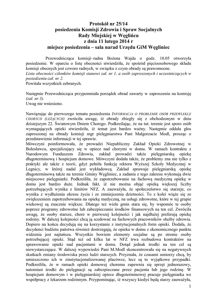 Protokół nr 25/14 posiedzenia Komisji Zdrowia i Spraw Socjalnych Rady Miejskiej w Węglińcu z dnia 11 lutego 2014 r miejsce posiedzenia – sala narad Urzędu GiM Węgliniec Przewodnicząca komisji–radna Bożena Wajda o godz. 10.05 otworzyła posiedzenie. W oparciu o listę obecności stwierdziła, że spośród pięcioosobowego składu komisji obecnych jest czworo radnych, w związku z czym obrady są prawomocne. Lista obecności członków komisji stanowi zał. nr 1, a osób zaproszonych i uczestniczących w posiedzeniu-zał. nr 2. Powitała wszystkich zebranych. Następnie Przewodnicząca przypomniała porządek obrad zawarty w zaproszeniu na komisję (zał. nr 3). Uwag nie wniesiono. Nawiązując do pierwszego tematu posiedzenia INFORMACJA O PROBLEMIE OSÓB PRZEWLEKLE CHORYCH (LEŻĄCYCH) zwróciła uwagę, iż obrady zbiegły się z obchodzonym w dniu dzisiejszym 22. Światowym Dniem Chorego. Podkreślając, że na tut. terenie jest sporo osób wymagających opieki stwierdziła, iż temat jest bardzo ważny. Następnie oddała głos zaproszonej na obrady komisji mgr pielęgniarstwa Pani Małgorzacie Modl, prosząc o przedstawienie informacji w tej sprawie. Mówczyni poinformowała, że prowadzi Niepubliczny Zakład Opieki Zdrowotnej w Bolesławcu, specjalizujący się w opiece nad chorymi w domu. W ramach kontraktu z Narodowym Funduszem Zdrowia, zakład prowadzi także pielęgniarską opiekę długoterminową i hospicjum domowe. Mówczyni dodała także, że problemy zna nie tylko z praktyki ale także z teorii, gdyż pełniła funkcję rektora Wyższej Szkoły Medycznej w Legnicy, w której nadal jest wykładowcą. Zakład sprawuje pielęgniarską opiekę długoterminową także na terenie Gminy Węgliniec, a zadania z tego zakresu wykonują dwie miejscowe pielęgniarki. Podkreśliła, że zapotrzebowanie na fachową medyczną opiekę w domu jest bardzo duże. Jednak fakt, iż nie można objąć opieką większej liczby potrzebujących wynika z limitów NFZ. A zauważyła, że społeczeństwo się starzeje, co wynika z wydłużenia okresu życia i ze zmniejszenia dzietności. To z kolei wiąże się ze zwiększeniem zapotrzebowania na opiekę medyczną, na usługi zdrowotne, które w tej grupie wiekowej są znacznie większe. Dlatego też wiele gmin stara się, by wspomóc te osoby poprzez programy zdrowotne lub zabezpieczanie środków finansowych na ten cel. Zwróciła uwagę, że osoby starsze, chore w pierwszej kolejności i jak najdłużej preferują opiekę rodziny. W dalszej kolejności chcą ją scedować na fachowych pracowników służby zdrowia. Dopiero na końcu decydują się na korzystanie z instytucjonalnych form opieki. Dodała, że decydenci budżetu państwa również dostrzegają, że opieka w domu z ekonomicznego punktu widzenia jest najtańsza. Wszystkie bowiem elementy socjalne są po stronie osoby potrzebującej opieki. Stąd też od kilku lat w NFZ trwa rozbudowa kontraktów na sprawowanie opieki nad pacjentami w domu. Dotąd jednak środki na ten cel są niewystarczające. W dalszej wypowiedzi Pani M.Modl skoncentrowała się na negatywnych skutkach zmiany środowiska przez ludzi starszych. Przyznała, że czasami seniorzy chcą, by umieszczono ich w zinstytucjonalizowanej placówce, lecz są to wyjątkowe przypadki. Podkreśliła, że w ramach opieki domowej choremu zapewnia się sprzęt jednorazowy, natomiast środki do pielęgnacji są zabezpieczane przez pacjenta lub jego rodzinę. W hospicjum domowym i w pielęgniarskiej opiece długoterminowej pracuje pielęgniarka we współpracy z lekarzem rodzinnym. Przypominając, iż wszyscy kiedyś będą starzy zauważyła, 1 że wypracowanie pełnych form opieki będzie skutkowało w przyszłości. A z czasem formy te będą tylko doskonalone. Odpowiadając na pytania wyjaśniła także, że podstawą objęcia pacjenta opieką długoterminową jest skierowanie. Skierowanie takie wystawia lekarz rodzinny bądź oddział szpitalny. Oprócz skierowania niezbędna jest także ocena sprawności chorego określana w skali Barthel. Pacjenci, którzy uzyskali 40 i mniej punktów kierowani są do objęcia omawianą opieką. Zwróciła przy tym uwagę na trudność sytuacji związanych z odmowami objęcia opieką potrzebującego, wynikającymi z niefinansowaniem przez NFZ nadwykonań. Dodała, że chodzi więc o uzmysławianie, że każda pomoc i środki na ten cel dla osób potrzebujących są wybawieniem z ich trudnej sytuacji. Wyjaśniła również, że za pielęgniarską opiekę długoterminową pacjenci nie płacą chyba, że sprawa dotyczy prywatnego zlecenia. Natomiast w ramach NFZ opieką objętych jest tylu pacjentów za ilu płaci Fundusz. Wyjaśniła także, że zakład, który reprezentuje obejmuje działalnością pielęgniarskiej opieki cały teren powiatu zgorzeleckiego. Natomiast hospicjum domowe ma nieokreślony zasięg. Odpowiadając dalej na pytania, przedstawiła stawki NFZ za każdy dzień objęcia pacjenta opieką (28 zł, w tym: pobyt pielęgniarki u chorego minimum 4 x w tygodniu, a w razie gdy stan pacjenta tego wymaga-7 x w tygodniu). W przypadku zlecenia usług specjalistycznych przez jeden z MOPS-ów jest to stawka na poziomie 15-18 zł. Z kolei w przypadku hospicjum domowego jest to 47 zł (obecność lekarza minimum 2 x w miesiącu, pielęgniarka minimum 2 x w tygodniu, rehabilitant zgodnie ze zleceniem lekarza, psycholog wg uznania rodziny). Burmistrz Gminy i Miasta – Andrzej Kutrowski zwrócił się z pytaniem do Kierownika Miejsko-Gminnego Ośrodka Pomocy Społecznej o to, ile osób z tut. terenu nie korzysta z żadnej z omawianych form opieki, a wskazane byłoby objęcie ich taką opieką. Kierownik Grażyna Sroka stwierdziła, że sprawa wymaga zdiagnozowania. A zwracając się do gościa Kierownik pytała, czy reprezentowana przez Panią Modl jednostka świadczy także usługi nad pacjentami z chorobami psychicznymi. Po uzyskaniu potwierdzenia, zwróciła uwagę, że w przypadk