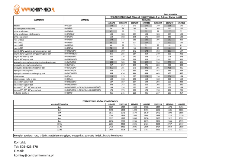 Ceny pln netto WKŁADY KOMINOWE OWALNE NIKO STS OVAL B gr. 0,6mm, Blacha 1.4404 ELEMENTY SYMBOL daszek kołnierz przeciwdeczowy płyta przelotowa płyta przelotowa z kołnierzem płyta z wpustem rura L=1000 rura L=500 rura L=333 rura L=250 trójnik 90° z wyjściem okrągłym szerszy bok trójnik 90° z wyjściem okrągłym węższy bok trójnik 45° szerszy bok trójnik 45° węższy bok wyczystka szerszy bok z zatyczką i odskraplaczem wyczystka szerszy bok z zatyczką wyczystka z drzwiczkami szerszy bok wyczystka węższy bok wyczystka z drzwiczkami węższy bok odskraplacz odskraplacz z rurka w bok kolano 90° szerszy bok kolano 90° węższy bok kolano 15°, 30°, 45° szerszy bok kolano 15°, 30°, 45° węższy bok redukcja owal / śr H-OD/śr H-OKP/śr H-OPKP/śr H-OPKPK/śr H-OPW/śr H-OR1/śr H-OR5/śr H-OR33/śr H-OR25/śr H-OT90/SB/śr H-0T90(WB)/śr H-OT45/SB/śr H-OT45/WB/śr H-OWO/SB/śr H-OW/SB/śr H-OWD/SB/śr H-OW/WB/śr H-OWD/WB/śr H-OO/śr H-OOR/śr H-OK90/SB/śr H-OK90/WB/śr H-OK15/SB/śr,H-OK30/SB/śr,H-OK45/SB/śr H-OK15/SB/śr;H-OK30/SB/śr;H-OK45/SB/śr H-OZR/śr 110x170 142 94 65 103 168 173 99 66 50 160 255 226 294 309 257 355 324 434 115 138 187 243 134 173 216 110X190 142 94 65 103 168 173 99 66 50 160 255 226 294 309 257 355 324 434 115 138 187 243 134 173 216 120X200 170 94 72 103 175 185 107 71 53 172 264 243 316 322 271 371 333 444 125 150 194 250 137 178 226 ROZMIAR 100X210 170 94 72 103 175 185 107 71 53 172 264 243 316 322 271 371 333 444 125 150 194 250 137 178 226 120X220 180 103 77 103 180 196 113 75 56 182 279 257 334 334 283 386 347 463 134 160 204 266 146 190 237 120X240 196 111 77 103 180 212 122 81 61 197 301 278 361 351 300 406 369 490 134 160 223 290 159 206 257 105X250 196 111 77 103 180 212 122 81 61 197 301 278 361 351 300 406 369 490 134 160 223 290 159 206 257 110X190 1225 1398 1571 1744 1917 2090 2263 2435 2608 120x200 1308 1493 1679 1864 2050 2235 2421 2606 2791 100X210 1308 1493 1679 1864 2050 2235 2421 2606 2791 120X220 1379 1576 1772 1969 2165 2361 2558 2754 2951 120X240 1474 1686 1898 2110 2322 2535 2747 2959 3171 105X250 1474 1686 1898 2110 2322 2535 2747 2959 3171 ZESTAWY WKŁADÓW KOMINOWYCH wysokość/średnica 4m 5m 6m 7m 8m 9m 10 m 11 m 12 m 110x170 1225 1398 1571 1744 1917 2090 2263 2435 2608 Komplet zawiera: rura, trójnik z wejściem okrągłym, wyczystka z zatyczką i odsk., blacha kominowa Kontakt: Tel: 502-423-370 E-mail: [email protected]