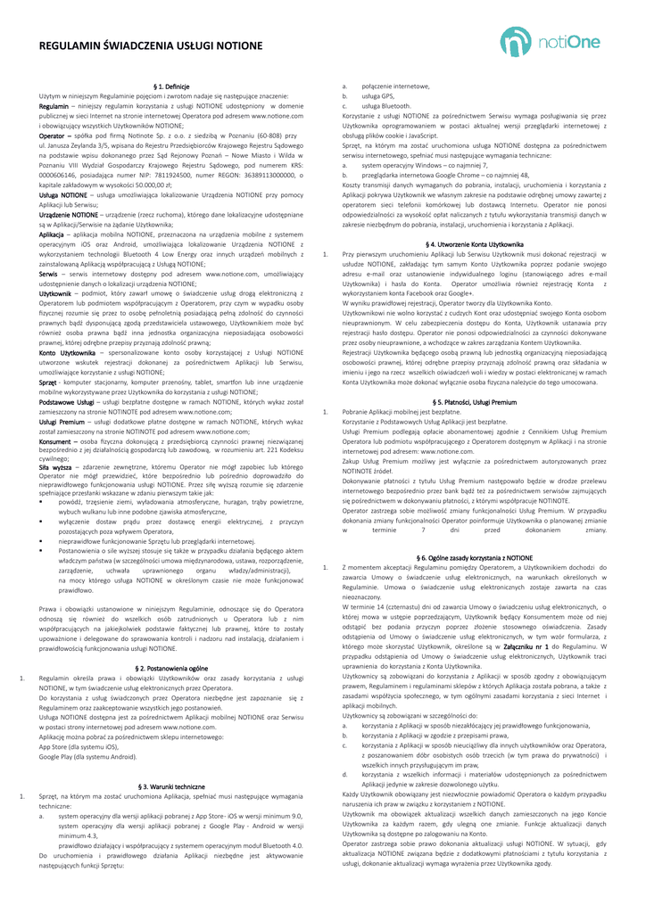 REGULAMIN ŚWIADCZENIA USŁUGI NOTIONE § 1. Definicje Użytym w niniejszym Regulaminie pojęciom i zwrotom nadaje się następujące znaczenie: Regulamin – niniejszy regulamin korzystania z usługi NOTIONE udostępniony w domenie publicznej w sieci Internet na stronie internetowej Operatora pod adresem www.notione.com i obowiązujący wszystkich Użytkowników NOTIONE; Operator – spółka pod firmą Notinote Sp. z o.o. z siedzibą w Poznaniu (60-808) przy ul. Janusza Zeylanda 3/5, wpisana do Rejestru Przedsiębiorców Krajowego Rejestru Sądowego na podstawie wpisu dokonanego przez Sąd Rejonowy Poznań – Nowe Miasto i Wilda w Poznaniu VIII Wydział Gospodarczy Krajowego Rejestru Sądowego, pod numerem KRS: 0000606146, posiadająca numer NIP: 7811924500, numer REGON: 36389113000000, o kapitale zakładowym w wysokości 50.000,00 zł; Usługa NOTIONE – usługa umożliwiająca lokalizowanie Urządzenia NOTIONE przy pomocy Aplikacji lub Serwisu; Urządzenie NOTIONE – urządzenie (rzecz ruchoma), którego dane lokalizacyjne udostępniane są w Aplikacji/Serwisie na żądanie Użytkownika; Aplikacja – aplikacja mobilna NOTIONE, przeznaczona na urządzenia mobilne z systemem operacyjnym iOS oraz Android, umożliwiająca lokalizowanie Urządzenia NOTIONE z wykorzystaniem technologii Bluetooth 4 Low Energy oraz innych urządzeń mobilnych z zainstalowaną Aplikacją współpracującą z Usługą NOTIONE; Serwis – serwis internetowy dostępny pod adresem www.notione.com, umożliwiający udostępnienie danych o lokalizacji urządzenia NOTIONE; Użytkownik – podmiot, który zawarł umowę o świadczenie usług drogą elektroniczną z Operatorem lub podmiotem współpracującym z Operatorem, przy czym w wypadku osoby fizycznej rozumie się przez to osobę pełnoletnią posiadającą pełną zdolność do czynności prawnych bądź dysponującą zgodą przedstawiciela ustawowego, Użytkownikiem może być również osoba prawna bądź inna jednostka organizacyjna nieposiadająca osobowości prawnej, której odrębne przepisy przyznają zdolność prawną; Konto Użytkownika – spersonalizowane konto osoby korzystającej z Usługi NOTIONE utworzone wskutek rejestracji dokonanej za pośrednictwem Aplikacji lub Serwisu, umożliwiające korzystanie z usługi NOTIONE; Sprzęt - komputer stacjonarny, komputer przenośny, tablet, smartfon lub inne urządzenie mobilne wykorzystywane przez Użytkownika do korzystania z usługi NOTIONE; Podstawowe Usługi – usługi bezpłatne dostępne w ramach NOTIONE, których wykaz został zamieszczony na stronie NOTINOTE pod adresem www.notione.com; Usługi Premium – usługi dodatkowe płatne dostępne w ramach NOTIONE, których wykaz został zamieszczony na stronie NOTINOTE pod adresem www.notione.com; Konsument – osoba fizyczna dokonującą z przedsiębiorcą czynności prawnej niezwiązanej bezpośrednio z jej działalnością gospodarczą lub zawodową, w rozumieniu art. 221 Kodeksu cywilnego; Siła wyższa – zdarzenie zewnętrzne, któremu Operator nie mógł zapobiec lub którego Operator nie mógł przewidzieć, które bezpośrednio lub pośrednio doprowadziło do nieprawidłowego funkcjonowania usługi NOTIONE. Przez siłę wyższą rozumie się zdarzenie spełniające przesłanki wskazane w zdaniu pierwszym takie jak: powódź, trzęsienie ziemi, wyładowania atmosferyczne, huragan, trąby powietrzne, wybuch wulkanu lub inne podobne zjawiska atmosferyczne, wyłączenie dostaw prądu przez dostawcę energii elektrycznej, z przyczyn pozostających poza wpływem Operatora, nieprawidłowe funkcjonowanie Sprzętu lub przeglądarki internetowej. Postanowienia o sile wyższej stosuje się także w przypadku działania będącego aktem władczym państwa (w szczególności umowa międzynarodowa, ustawa, rozporządzenie, zarządzenie, uchwała uprawnionego organu władzy/administracji), na mocy którego usługa NOTIONE w określonym czasie nie może funkcjonować prawidłowo. Prawa i obowiązki ustanowione w niniejszym Regulaminie, odnoszące się do Operatora odnoszą się również do wszelkich osób zatrudnionych u Operatora lub z nim współpracujących na jakiejkolwiek podstawie faktycznej lub prawnej, które to zostały upoważnione i delegowane do sprawowania kontroli i nadzoru nad instalacją, działaniem i prawidłowością funkcjonowania usługi NOTIONE. 1. 1. § 2. Postanowienia ogólne Regulamin określa prawa i obowiązki Użytkowników oraz zasady korzystania z usługi NOTIONE, w tym świadczenie usług elektronicznych przez Operatora. Do korzystania z usług świadczonych przez Operatora niezbędne jest zapoznanie się z Regulaminem oraz zaakceptowanie wszystkich jego postanowień. Usługa NOTIONE dostępna jest za pośrednictwem Aplikacji mobilnej NOTIONE oraz Serwisu w postaci strony internetowej pod adresem www.notione.com. Aplikację można pobrać za pośrednictwem sklepu internetowego: App Store (dla systemu iOS), Google Play (dla systemu Android). § 3. Warunki techniczne Sprzęt, na którym ma zostać uruchomiona Aplikacja, spełniać musi następujące wymagania techniczne: a. system operacyjny dla wersji aplikacji pobranej z App Store - iOS w wersji minimum 9.0, system operacyjny dla wersji aplikacji pobranej z Google Play - Android w wersji minimum 4.3, prawidłowo działający i współpracujący z systemem operacyjnym moduł Bluetooth 4.0. Do uruchomienia i prawidłowego działania Aplikacji niezbędne jest aktywowanie następujących funkcji Sprzętu: a. połączenie internetowe, b. usługa GPS, c. usługa Bluetooth. Korzystanie z usługi NOTIONE za pośrednictwem Serwisu wymaga posługiwania się przez Użytkownika oprogramowaniem w postaci aktualnej wersji przeglądarki internetowej z obsługą plików cookie i JavaScript. Sprzęt, na którym ma zostać uruchomiona usługa NOTIONE dostępna za pośrednictwem serwisu internetowego, spełniać musi następujące wymagania techniczne: a. system operacyjny Windows – co 