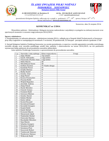 ŚLĄSKI ZWIĄZEK PIŁKI NOŻNEJ PODOKRĘG SOSNOWIEC Kolegium Sędziów Piłki Nożnej 41-200 SOSNOWIEC ul. Rzeźnicza 12 www.podokregsosnowiec.pl tel./fax. 032-266-58-45 tel.032-363-42-65 e-mail [email protected] (posiedzenia Kolegium Sędziów odbywają się w piątki w godzinach 17 00 - 1900 , sprawy bieżące 1630- 1700) Strona internetowa: WWW.KS-SOSNOWIEC.PL Sosnowiec, dnia 26 sierpnia 2014r KOMUNIKAT nr 2/2014. Wszystkim sędziom – Koleżankom i Kolegom życzymy zadowolenia i satysfakcji z występów na zielonej murawie oraz sportowych awansów w sezonie rozgrywkowym 2014/2015. Sprawy szkoleniowe: 1. Przypominamy, że zebrania plenarno - szkoleniowe jesienią 2014 r. odbędą się w Zespole Szkół Technicznych w Sosnowcu przy ulicy Legionów w następujących terminach: 5 wrzesień, 18 październik, 22 listopad - początek zebrań o godzinie 17.00 2. Zarząd Kolegium Sędziów Podokręg Sosnowiec na swoim posiedzeniu, w oparciu o wyniki egzaminów szczebla centralnego, szczebla okręgu oraz szczebla podokręgu ustalił listy sędziów i obserwatorów na sezon 2014/2015, na ich podstawie wyznaczani będą sędziowie do prowadzenia zawodów piłkarskich. Lista sędziów Podokręgu Sosnowiec z uprawnieniami do prowadzenia zawodów. L.p. 1 2 3 4 5 6 7 8 9 10 11 12 13 14 15 16 17 18 19 20 21 22 23 24 25 26 27 28 29 30 31 32 33 34 35 36 37 38 39 40 41 Nazwisko i imię sędziego Zając Michał Guzek Aleksandra Fliszewska (Pyrtek) Anna Miśta Marcin Mirzabekyan Karen Grabara Szymon Kamiński Paweł Grząba Mariusz Budny Kamil Grzelec Artur Jurga Paweł Kozera Przemysław Przystaś Rafał Wójcik Bogusław Zawiślak Andrzej Żmija Patryk Dyrek Mirosław Faracik Tomasz Formicki Rafał Gorczyca Mariusz Grzelec Dawid Kałuża Michał Kania Adrian Kostoń Ryszard Kowalczyk Kacper Kowalski Grzegorz Krążek Rafał Kurek Michał Kwiecień Marcin Morawiecki Jakub Niedzielski Michał Ostrowski Mariusz Roczkalski Mirosław Soja Marcin Szlachta Grzegorz Szreniawa Michał Szreniawa Piotr Szycowski Robert Teodorczuk Mateusz Wachowicz Mariusz Witkowski Rafał Klasa rozgrywkowa Top amator I liga kobiet I liga kobiet III III IV/ Kadra okręgu IV IV V V V V V V V V A A A A A A A A A A A A A A A A A A A A A A A A A Uwagi 42 43 44 45 46 47 48 49 50 51 52 53 54 55 56 57 58 59 60 61 62 63 64 65 66 67 68 69 70 71 72 73 74 75 76 77 78 79 80 81 82 83 84 85 86 87 88 89 90 91 92 93 94 95 96 97 98 99 100 101 102 103 104 105 106 107 Zalesiak Marek Żelazny Andrzej Żelazny Piotr Żmuda Sebastian Adamczyk Adam Chudy Zbigniew Czechowski Wojciech Czekajski Marcin Gałązka Rafał Hajdukiewicz Michał Helewski Tomasz Jakubowski Paweł Kmiecik Artur Kubacki Mariusz Kula Jarosław Maj Mateusz Malborski Kacper Molenda Zbigniew Opatrzyk Dariusz Parol Grzegorz Przybysz Grzegorz Rumiński Patryk Sęk Tomasz Skowroński Marek Skrobisz Andrzej Skuza Paweł Stolpa Kamil Szczygieł Damian Walczak Adam Włochowicz Krystian Wrona Dariusz Barański Józef Bąbik Krzysztof Dziura Przemysław Ficiński Maciej Frańczak Łukasz Gajek Rafał Grabowski Damian Grudziński Marcin Grzyszka Piotr Jędruch Damian Kijak Paweł Kopeć Janusz Kosiór Andrzej Kowalski Bronisław Kozakowski Rafał Kozicki Adrian Kulasa Krzysztof Kurek Henryk Kusak Mariusz Madej Jędrzej Malec Aleksander Motak Jonatan Niedajchleb Tadeusz Nowak Rafael Oberski Grzegorz Obrzut Marek Pańtak Robert Pardej Mieczysław Pietrzyk Adrian Pirański Jarosław Przecherski Krzysztof Rak Jan Rzepliński Dawid Skoczek Bogdan Smalcerz Marian A A A A B B B B B B B B B B B B B B B B B B B B B B B B B B B Asystent Asystent Asystent Asystent Asystent Asystent Asystent Asystent Asystent Asystent Asystent Asystent Asystent Asystent Asystent Asystent Asystent Asystent Asystent Asystent Asystent Asystent Asystent Asystent Asystent Asystent Asystent Asystent Asystent Asystent Asystent Asystent Asystent Asystent Asystent Po zaliczeniu egzaminu sprawnościowego Po zaliczeniu egzaminu sprawnościowego Po zaliczeniu egzaminu sprawnościowego Po zaliczeniu egzaminu sprawnościowego Po zaliczeniu egzaminu sprawnościowego Po zaliczeniu egzaminu sprawnościowego Po zaliczeniu egzaminu: teoria, sprawnościowy Po zaliczeniu egzaminu: teoria, sprawnościowy Po zaliczeniu egzaminu: teoria, sprawnościowy Po zaliczeniu egzaminu: teoria, sprawnościowy Po zaliczeniu egzaminu: teoria, sprawnościowy Po zaliczeniu egzaminu: teoria, sprawnościowy Po zaliczeniu egzaminu: teoria, sprawnościowy Po zaliczeniu egzaminu: teoria, sprawnościowy Po zaliczeniu egzaminu sprawnościowego Po zaliczeniu egzaminu: teoria, sprawnościowy Po zaliczeniu egzaminu: teoria, sprawnościowy Po zaliczeniu egzaminu: teoria, sprawnościowy Po zaliczeniu egzaminu: teoria, sprawnościowy Po zaliczeniu egzaminu sprawnościowego Po zaliczeniu egzaminu: teoria, sprawnościowy Po zaliczeniu egzaminu sprawnościowego Po zaliczeniu egzaminu: teoria, sprawnościowy Po zaliczeniu egzaminu: teoria, sprawnościowy Po zaliczeniu egzaminu: teoria, sprawnościowy Po zaliczeniu egzaminu: teoria, sprawnościowy Po zaliczeniu egzaminu sprawnościowego Po zaliczeniu egzaminu: teoria, sprawnościowy Po zaliczeniu egzaminu teoretycznego Po zaliczeniu egzaminu: teoria, sprawnościowy Po zaliczeniu egzaminu: teoria, sprawnościowy 108 109 110 111 112 113 114 115 116 117 118 119 120 121 122 123 124 125 126 127 128 129 130 131 132 133 134 135 136 137 138 139 140 141 142 143 144 Szaleniec Bartosz Szczotka Paweł Szewczyk Kamil Wandzel Przemysław Wiatrowski Stanisław Zarychta Marek Zięba Sebastian Żmuda Radosław Bachowski Kamil Czapla Grzegorz Gębka Monika Golonka Igor Jamróz Rafał Kozień Kacper Latkowski Piotr Miodek Kamil Musialik Marcin Opoka Damian Opoka Kamil Wójcik Magdalena Chlebowski Cezary Ficiński Michał Gędłek Arkadiusz Gojdź Dorian Jakubczyk Michał Jastrząb Nikita Kmiecik Jakub Krzesak Piotr Majewski Kamil Roczkalski Damian Różyński Karol Słomkowski Dawid Trzcionka Janusz Tyszkiewicz Tomasz Wójcik Bartosz Wybraniec Kr
