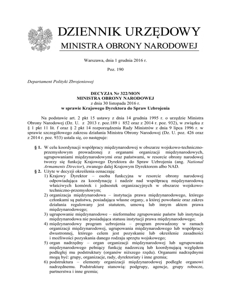 Warszawa, dnia 1 grudnia 2016 r. Poz. 190 Departament Polityki Zbrojeniowej DECYZJA Nr 322/MON MINISTRA OBRONY NARODOWEJ z dnia 30 listopada 2016 r. w sprawie Krajowego Dyrektora do Spraw Uzbrojenia Na podstawie art. 2 pkt 15 ustawy z dnia 14 grudnia 1995 r. o urzędzie Ministra Obrony Narodowej (Dz. U. z 2013 r. poz.189 i 852 oraz z 2014 r. poz. 932), w związku z § 1 pkt 11 lit. f oraz § 2 pkt 14 rozporządzenia Rady Ministrów z dnia 9 lipca 1996 r. w sprawie szczegółowego zakresu działania Ministra Obrony Narodowej (Dz. U. poz. 426 oraz z 2014 r. poz. 933) ustala się, co następuje: § 1. W celu koordynacji współpracy międzynarodowej w obszarze wojskowo-technicznoprzemysłowym prowadzonej z organami organizacji międzynarodowych, ugrupowaniami międzynarodowymi oraz państwami, w resorcie obrony narodowej tworzy się funkcję Krajowego Dyrektora do Spraw Uzbrojenia (ang. National Armaments Director), zwanego dalej Krajowym Dyrektorem albo NAD. § 2. Użyte w decyzji określenia oznaczają: 1) Krajowy Dyrektor – osoba funkcyjna w resorcie obrony narodowej odpowiadająca za koordynację i nadzór nad współpracą międzynarodową właściwych komórek i jednostek organizacyjnych w obszarze wojskowotechniczno-przemysłowym; 2) organizacja międzynarodowa – instytucja prawa międzynarodowego, którego członkami są państwa, posiadająca własne organy, a której powołanie oraz zakres działania regulowany jest statutem, umową lub innym aktem prawa międzynarodowego; 3) ugrupowanie międzynarodowe – nieformalne zgrupowanie państw lub instytucja międzynarodowa nie posiadająca statusu instytucji prawa międzynarodowego; 4) międzynarodowy program uzbrojenia – program prowadzony w ramach organizacji międzynarodowej, ugrupowania międzynarodowego lub współpracy dwustronnej, którego celem jest pozyskanie lub określenie zasadności i możliwości pozyskania danego rodzaju sprzętu wojskowego; 5) organ nadrzędny – organ organizacji międzynarodowej lub ugrupowania międzynarodowego pełniący funkcję nadzorczą lub koordynującą względem podległej mu podstruktury (organów niższego rzędu). Organami nadrzędnymi mogą być: grupy, organizacje, rady, dyrektoriaty i inne gremia; 6) podstruktura – elementy organizacji międzynarodowej podległe organowi nadrzędnemu. Podstrukturę stanowią: podgrupy, agencje, grupy robocze, partnerstwa i inne gremia; 7) struktura organizacyjna – zbiorcza nazwa dla organów organizacji międzynarodowych, ugrupowań międzynarodowych, organów nadrzędnych oraz podstruktury. § 3. 1. Wytyczne do działań Krajowego Dyrektora i jego Zastępców oparte są na celach i zadaniach w obszarze polityki bezpieczeństwa międzynarodowego, formułowanych przez Ministra Obrony Narodowej na podstawie: 1) posiedzeń Rady Północnoatlantyckiej NATO oraz Rady Sterującej Europejskiej Agencji Obrony (European Defence Agency), zwanej dalej „EDA”, w formule Ministrów Obrony; 2) spotkań w ramach innych organizacji oraz rozmów dwu- i wielostronnych; 3) dokumentów rządowych i resortowych z zakresu polityki zbrojeniowej. 2. Za przygotowanie i wypracowanie propozycji stanowiska (decyzji) Ministra Obrony Narodowej, w sprawach rozpatrywanych przez powyższe gremia organizowane w formule Ministrów Obrony, odpowiada Dyrektor Departamentu Polityki Bezpieczeństwa Międzynarodowego. 3. Dyrektorzy komórek Ministerstwa Obrony Narodowej oraz dowódcy (szefowie, komendanci) jednostek organizacyjnych resortu obrony narodowej są zobowiązani do przekazywania informacji oraz stosownych rekomendacji, niezbędnych do wypracowania propozycji stanowiska Ministra Obrony Narodowej, w sprawach rozpatrywanych przez: 1) Radę Północnoatlantycką w formule Ministrów Obrony; 2) Radę Sterującą EDA w formule Ministrów Obrony. § 4. 1. Funkcję Krajowego Dyrektora powierza się Dyrektorowi Departamentu Polityki Zbrojeniowej Ministerstwa Obrony Narodowej. 2. Tworzy się funkcję I Zastępcy Krajowego Dyrektora do Spraw Uzbrojenia, zwanego dalej „I Zastępcą Krajowego Dyrektora”. Funkcję tą pełni Zastępca Dyrektora Departamentu Polityki Zbrojeniowej Ministerstwa Obrony Narodowej właściwy do spraw współpracy międzynarodowej. 3. Do zadań Krajowego Dyrektora należy: 1) koordynacja i nadzór nad współpracą międzynarodową w obszarze wojskowotechniczno-przemysłowym; 2) reprezentowanie resortu obrony narodowej na forum Konferencji Krajowych Dyrektorów do Spraw Uzbrojenia NATO (Conference of National Armaments Directors), zwanej dalej CNAD, i Rady Sterującej EDA, w formule Krajowych Dyrektorów do Spraw Uzbrojenia oraz na forach organów nadrzędnych innych organizacji i ugrupowań międzynarodowych w formule NAD; 3) realizacja wytycznych Ministra Obrony Narodowej w ramach współpracy międzynarodowej z państwami, organami NATO i UE oraz innymi organizacjami i ugrupowaniami międzynarodowymi w obszarze sprzętu wojskowego oraz przemysłu i rynku obronnego; 4) prowadzenie i aktualizacja wykazu polskich przedstawicieli realizujących współpracę z organami NATO, Unii Europejskiej oraz innych podmiotów międzynarodowych w obszarze regulacji niniejszej decyzji. „Wykaz osób funkcyjnych wskazujących i wyznaczających przedstawicieli do realizacji współpracy zagranicznej w obszarze kompetencji Krajowego Dyrektora ds. Uzbrojenia”, zwany jest dalej „Wykazem”. Tekst jednolity Wykazu umieszczany jest na stronie Departamentu Polityki Zbrojeniowej Ministerstwa Obrony Narodowej, w portalu MILNET-Z. § 5. Oficjalne stanowisko resortu obrony narodowej prezentowane na forum organów organizacji międzynarodowych, ugrupowań międzynarodowych oraz w ramach współpracy bilateralnej w formule NAD wymaga każdorazowego zatwierdzenia przez Sekretarza Stanu w Ministerstwie Obrony Narodowej. § 6. 1. Tworzy się funkcję Zastępcy Krajowego Dyrektora do Spraw Uzbrojenia w obszarze Badań Naukowych i Technologii Obronnych, zwanego dalej „Zastęp