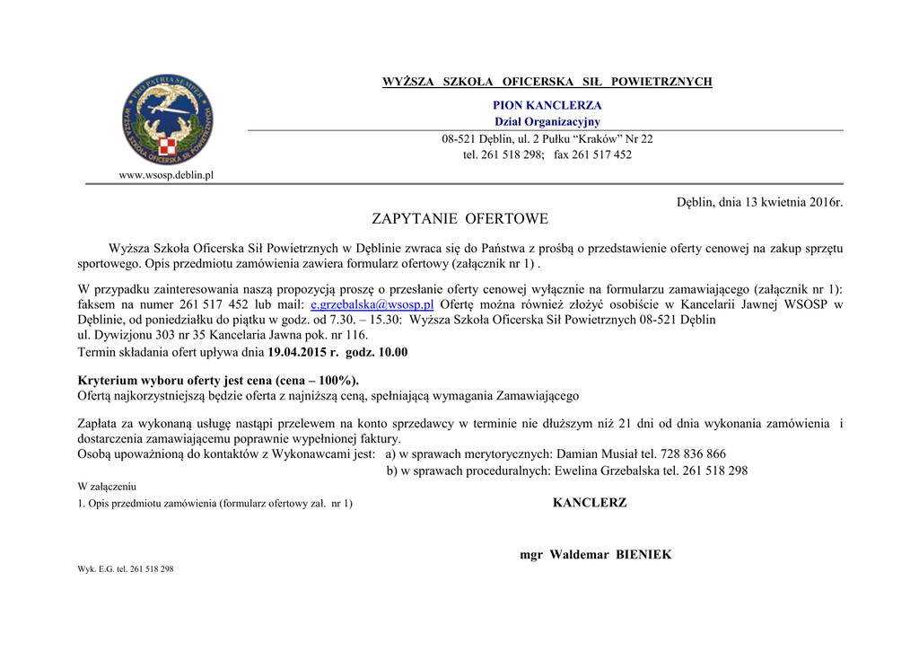 WYŻSZA SZKOŁA OFICERSKA SIŁ POWIETRZNYCH PION KANCLERZA Dział Organizacyjny 08-521 Dęblin, ul. 2 Pułku “Kraków” Nr 22 tel. 261 518 298; fax 261 517 452 www.wsosp.deblin.pl Dęblin, dnia 13 kwietnia 2016r. ZAPYTANIE OFERTOWE Wyższa Szkoła Oficerska Sił Powietrznych w Dęblinie zwraca się do Państwa z prośbą o przedstawienie oferty cenowej na zakup sprzętu sportowego. Opis przedmiotu zamówienia zawiera formularz ofertowy (załącznik nr 1) . W przypadku zainteresowania naszą propozycją proszę o przesłanie oferty cenowej wyłącznie na formularzu zamawiającego (załącznik nr 1): faksem na numer 261 517 452 lub mail: [email protected] Ofertę można również złożyć osobiście w Kancelarii Jawnej WSOSP w Dęblinie, od poniedziałku do piątku w godz. od 7.30. – 15.30: Wyższa Szkoła Oficerska Sił Powietrznych 08-521 Dęblin ul. Dywizjonu 303 nr 35 Kancelaria Jawna pok. nr 116. Termin składania ofert upływa dnia 19.04.2015 r. godz. 10.00 Kryterium wyboru oferty jest cena (cena – 100%). Ofertą najkorzystniejszą będzie oferta z najniższą ceną, spełniającą wymagania Zamawiającego Zapłata za wykonaną usługę nastąpi przelewem na konto sprzedawcy w terminie nie dłuższym niż 21 dni od dnia wykonania zamówienia i dostarczenia zamawiającemu poprawnie wypełnionej faktury. Osobą upoważnioną do kontaktów z Wykonawcami jest: a) w sprawach merytorycznych: Damian Musiał tel. 728 836 866 b) w sprawach proceduralnych: Ewelina Grzebalska tel. 261 518 298 W załączeniu 1. Opis przedmiotu zamówienia (formularz ofertowy zał. nr 1) KANCLERZ mgr Waldemar BIENIEK Wyk. E.G. tel. 261 518 298 Załącznik nr 1 OPIS PRZEDMIOTU ZAMÓWIENIA / FORMULARZ OFERTOWY ZADANIE I Lp Nazwa przedmiotu Obuwie Asics Snapdown Black 1 2 Rozmiar: 41,5 - 1 szt., 42,5 - 1 szt. Opis: oczkowany materiał zapewnia doskonałą wentylację i komfort stop, Zintegrowany system sznurówek, jednoczęściowa, trwała i elastyczna gumowa podeszwa, Znakomita przyczepność i stabilizacja, niska waga Rękawice Masters RBT Thai 2 Rozmiar: 12 OZ - 1 szt. Opis: Rękawice bokserskie wykonane ze skóry. Idealnie zamknięta pięść, przyszyty bardzo dobrze wyprofilowany kciuk. Specjalnie wyprofilowana przednia część rękawicy zasłaniająca kciuk przeciw kontuzjom. Szeroki rzep wokół nadgarstka, zaokrąglony kształt zakończenia rzepów zapobiega przypadkowym kontuzjom przy ześlizgnięciu się ciosu. Wartość netto ogółem zamówienia VAT % Wartość brutto ogółem zamówienia 3 Ochraniacze piszczeli i stóp Masters NS-3 GEL Rozmiar: L - 1 szt. Opis: Ochraniacz na goleń i stopę KING to wykonany ze skóry naturalnej produkt do zabezpieczenia kości piszczelowej i śródstopia w czasie treningu, sparingów i innych dyscyplinach. Potrójna warstwa pianki, chroni w czasie wykonywania kopnięć. Ochraniacz posiada dodatkową warstwę pianki z żelem w kształcie odwrócenej litey "Y" ułożoną wzdłuż, która wzmacnia ochronę. Śródstopie i pięta posiadają ściągacze elastyczne z wszytymi z metalowymi sprzączkami zapięcia na rzepy. SUMA Termin realizacji zamówienia: 7 dni od dnia złożenia zamówienia Gwarancja jaką przedstawił producent Dostawa jednorazowa do magazynu WSOSP wysyłka kurierem Dane dotyczące Wykonawcy: Nazwa Firmy…....................................................................................................................... Siedziba…...................................................................................................................... Nr telefonu:….................................. ……………………………….…… Miejscowość , data NIP:…................................................... REGON…………………………..…………… …………………………….. podpis/pieczęć Wykonawcy Załącznik nr 1 OPIS PRZEDMIOTU ZAMÓWIENIA / FORMULARZ OFERTOWY ZADANIE II Lp 1 2 3 Nazwa przedmiotu Piłka gimnastyczna, fitness, do ćwiczeń 65cm + pompka Spokey - 3 szt. średnica: 65 cm; wielkość po napompowaniu: ok. 60-70 cm maksymalna waga użytkownika: 300 kg, materiał: PVC system Anti-Burst - w przypadku przebicia piłki następuje powolne uwolnienie powietrza; elastyczny materiał wysokiej jakości zapewnia długą żywotność piłki; pompka w zestawie; przykładowe ćwiczenia i instrukcja użytkowania, kolor: czarny; Gwarancja: 12 miesięcy Dysk do ćwiczeń, do masażu, pompowany 32cm Meteor - 6szt. materiał: PCV, średnica: ok. 32 cm, grubość: ok. 5 cm, wykonany z PVC, dysk jest pompowany (bez pompki) wygodny, kolor: czarny, Mata gimnastyczna FLEXMAT III Spokey - 2 szt. wymiary: 180 x 60 x 0,6 cm waga: ok. 1100 g Wartość netto ogółem zamówienia VAT % Wartość brutto ogółem zamówienia materiał: neopren brzegi wykończone lamówką z taśmy właściwości antypoślizgowe nie wchłania wilgoci odporna na odkształcenia i przetarcia troki do spięcia zwiniętej maty uchwyt do przenoszenia kolor: czarno-szary 4 5 Pompka do piłek aluminiowa Meteor - 2 szt. Pompka przeznaczona do pompowania piłek, materacy itp. materiał w pompce to aluminium, dzięki któremu jest bardzo wytrzymała i odporna na uszkodzenia mechaniczne. W zestawie wężyk. Pompka jest tak wykonana, aby podczas pompowania powietrze nie cofało się z pompowanego przedmiotu, możliwość wkręcenia igły bezpośrednio w wylot powietrza pompki. Zegarek sportowy, pulsometr, monitor pracy serca IRONMAN, Timex - 1 szt. Nowoczesny, funkcjonalny zegarek Ironman® Cyfrowy monitor pracy serca umożliwia precyzyjny pomiar poziomu tętna bez zakłóceń. Duża ilość funkcji pozwala na dokładne zaplanowanie treningu, dostosowanie go do indywidualnych możliwości i stałą kontrolę mierzonych parametrów. Funkcja podświetlenia tarczy Night-Mode umożliwia wygodne korzystanie z zegarka podczas treningów po zmierzchu. SUMA ZAD II Termin realizacji zamówienia: 7 dni od dnia złożenia zamówienia Gwarancja jaką przedstawił produ