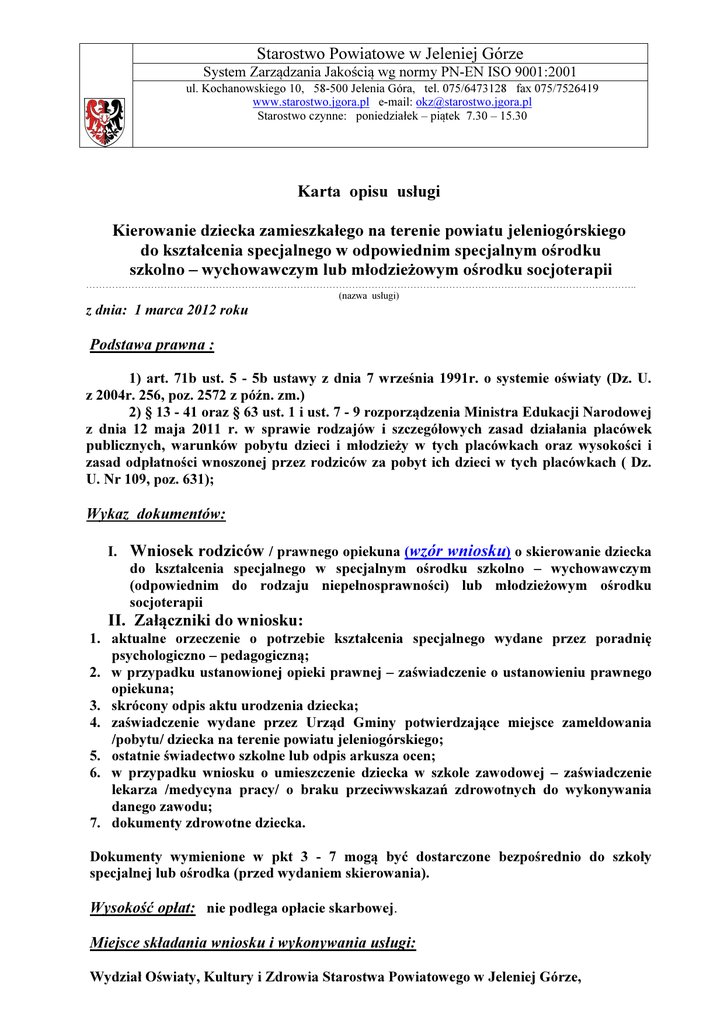 Starostwo Powiatowe w Jeleniej Górze System Zarządzania Jakością wg normy PN-EN ISO 9001:2001 ul. Kochanowskiego 10, 58-500 Jelenia Góra, tel. 075/6473128 fax 075/7526419 www.starostwo.jgora.pl e-mail: [email protected] Starostwo czynne: poniedziałek – piątek 7.30 – 15.30 Karta opisu usługi Kierowanie dziecka zamieszkałego na terenie powiatu jeleniogórskiego do kształcenia specjalnego w odpowiednim specjalnym ośrodku szkolno – wychowawczym lub młodzieżowym ośrodku socjoterapii …………………………………………………………………………………………………………………………………………………….. (nazwa usługi) z dnia: 1 marca 2012 roku Podstawa prawna : 1) art. 71b ust. 5 - 5b ustawy z dnia 7 września 1991r. o systemie oświaty (Dz. U. z 2004r. 256, poz. 2572 z późn. zm.) 2) § 13 - 41 oraz § 63 ust. 1 i ust. 7 - 9 rozporządzenia Ministra Edukacji Narodowej z dnia 12 maja 2011 r. w sprawie rodzajów i szczegółowych zasad działania placówek publicznych, warunków pobytu dzieci i młodzieży w tych placówkach oraz wysokości i zasad odpłatności wnoszonej przez rodziców za pobyt ich dzieci w tych placówkach ( Dz. U. Nr 109, poz. 631); Wykaz dokumentów: I. Wniosek rodziców / prawnego opiekuna (wzór wniosku) o skierowanie dziecka do kształcenia specjalnego w specjalnym ośrodku szkolno – wychowawczym (odpowiednim do rodzaju niepełnosprawności) lub młodzieżowym ośrodku socjoterapii II. Załączniki do wniosku: 1. aktualne orzeczenie o potrzebie kształcenia specjalnego wydane przez poradnię psychologiczno – pedagogiczną; 2. w przypadku ustanowionej opieki prawnej – zaświadczenie o ustanowieniu prawnego opiekuna; 3. skrócony odpis aktu urodzenia dziecka; 4. zaświadczenie wydane przez Urząd Gminy potwierdzające miejsce zameldowania /pobytu/ dziecka na terenie powiatu jeleniogórskiego; 5. ostatnie świadectwo szkolne lub odpis arkusza ocen; 6. w przypadku wniosku o umieszczenie dziecka w szkole zawodowej – zaświadczenie lekarza /medycyna pracy/ o braku przeciwwskazań zdrowotnych do wykonywania danego zawodu; 7. dokumenty zdrowotne dziecka. Dokumenty wymienione w pkt 3 - 7 mogą być dostarczone bezpośrednio do szkoły specjalnej lub ośrodka (przed wydaniem skierowania). Wysokość opłat: nie podlega opłacie skarbowej. Miejsce składania wniosku i wykonywania usługi: Wydział Oświaty, Kultury i Zdrowia Starostwa Powiatowego w Jeleniej Górze, Starostwo Powiatowe w Jeleniej Górze System Zarządzania Jakością wg normy PN-EN ISO 9001:2001 ul. Kochanowskiego 10, 58-500 Jelenia Góra, tel. 075/6473128 fax 075/7526419 www.starostwo.jgora.pl e-mail: [email protected] Starostwo czynne: poniedziałek – piątek 7.30 – 15.30 ul. Kochanowskiego 10, 58-500 Jelenia Góra. I piętro, pokój nr 12, tel. (075) 6473-128 ; e-mail: [email protected] Sposób załatwienia usługi : 1) skierowanie do specjalnego ośrodka szkolno–wychowawczego: wystąpienie do innego Powiatu, który prowadzi odpowiednią do rodzaju niepełnosprawności dziecka szkołę specjalną w ośrodku wskazanym przez rodziców lub najbliższy miejsca zamieszkania dziecka; 2) skierowanie do młodzieżowego ośrodka socjoterapii: przekazanie wniosku do dalszego załatwienia przez Dyrektora Zespołu Placówek Resocjalizacyjno-Wychowawczych w Szklarskiej Porębie (upoważnienie nr 12/12 Starosty Jeleniogórskiego z dnia 22 lutego 2012r.) Czas realizacji usługi: do pięciu dni roboczych od dnia dostarczenia przez wnioskodawcę dokumentów niezbędnych do wystąpienia do innego powiatu lub przekazania wniosku. Wykonujący usługę nie ma wpływu na termin wystawienia skierowania (uzyskania miejsca oraz czasu przyjęcia dziecka) do szkoły specjalnej w odpowiednim ośrodku. Informacja o trybie odwoławczym :nie jest przewidziany tryb odwoławczy. Sposób odbioru dokumentów : wysłane za pośrednictwem poczty lub odebrane osobiście przez składającego wniosek. Uwagi : Powiat Jeleniogórski nie prowadzi szkół specjalnych ani ośrodków dla dzieci i młodzieży : 1. niesłyszących i słabosłyszących, 2. niewidomych i słabowidzących, 3. z niepełnosprawnością ruchową, 4. z autyzmem, ze sprzężonymi niepełnosprawnościami, 5. z upośledzeniem umysłowym w stopniu lekkim, umiarkowanym lub znacznym /z wyjątkiem szkół w Domu Pomocy Społecznej w Miłkowie/, stąd wykonujący usługę nie ma wpływu na termin uzyskania miejsca oraz czas przyjęcia dziecka do szkoły specjalnej lub odpowiedniego ośrodka.