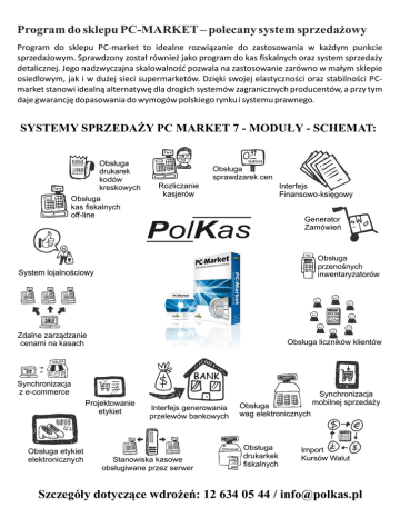 Program do sklepu PC-MARKET – polecany system sprzedażowy Program do sklepu PC-market to idealne rozwiązanie do zastosowania w każdym punkcie sprzedażowym. Sprawdzony został również jako program do kas fiskalnych oraz system sprzedaży detalicznej. Jego nadzwyczajna skalowalność pozwala na zastosowanie zarówno w małym sklepie osiedlowym, jak i w dużej sieci supermarketów. Dzięki swojej elastyczności oraz stabilności PCmarket stanowi idealną alternatywę dla drogich systemów zagranicznych producentów, a przy tym daje gwarancję dopasowania do wymogów polskiego rynku i systemu prawnego. SYSTEMY SPRZEDAŻY PC MARKET 7 - MODUŁY - SCHEMAT: Obsługa drukarek kodów kreskowych 5 863424343 5 259624972 Obsługa kas fiskalnych off-line Obsługa sprawdzarek cen Rozliczanie kasjerów Interfejs Finansowo-księgowy Generator Zamówień Obsługa przenośnych inwentaryzatorów System lojalnościowy Zdalne zarządzanie cenami na kasach Obsługa liczników klientów SKLEP Synchronizacja z e-commerce Projektowanie etykiet Obsługa etykiet elektronicznych Interfejs generowania przelewów bankowych Stanowiska kasowe obsługiwane przez serwer Obsługa wag elektronicznych Obsługa drukarkek fiskalnych Synchronizacja mobilnej sprzedaży Import Kursów Walut Szczegóły dotyczące wdrożeń: 12 634 05 44 / [email protected]