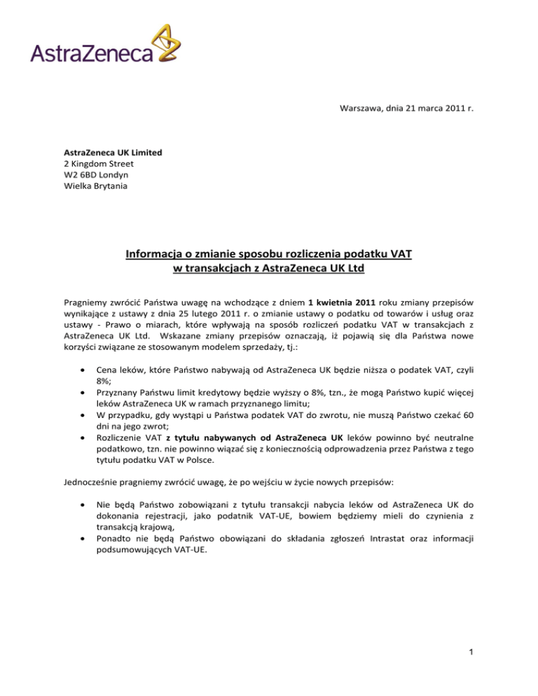 Warszawa, dnia 21 marca 2011 r. AstraZeneca UK Limited 2 Kingdom Street W2 6BD Londyn Wielka Brytania Informacja o zmianie sposobu rozliczenia podatku VAT w transakcjach z AstraZeneca UK Ltd Pragniemy zwrócić Państwa uwagę na wchodzące z dniem 1 kwietnia 2011 roku zmiany przepisów wynikające z ustawy z dnia 25 lutego 2011 r. o zmianie ustawy o podatku od towarów i usług oraz ustawy - Prawo o miarach, które wpływają na sposób rozliczeń podatku VAT w transakcjach z AstraZeneca UK Ltd. Wskazane zmiany przepisów oznaczają, iż pojawią się dla Państwa nowe korzyści związane ze stosowanym modelem sprzedaży, tj.: • • • • Cena leków, które Państwo nabywają od AstraZeneca UK będzie niższa o podatek VAT, czyli 8%; Przyznany Państwu limit kredytowy będzie wyższy o 8%, tzn., że mogą Państwo kupić więcej leków AstraZeneca UK w ramach przyznanego limitu; W przypadku, gdy wystąpi u Państwa podatek VAT do zwrotu, nie muszą Państwo czekać 60 dni na jego zwrot; Rozliczenie VAT z tytułu nabywanych od AstraZeneca UK leków powinno być neutralne podatkowo, tzn. nie powinno wiązać się z koniecznością odprowadzenia przez Państwa z tego tytułu podatku VAT w Polsce. Jednocześnie pragniemy zwrócić uwagę, że po wejściu w życie nowych przepisów: • • Nie będą Państwo zobowiązani z tytułu transakcji nabycia leków od AstraZeneca UK do dokonania rejestracji, jako podatnik VAT-UE, bowiem będziemy mieli do czynienia z transakcją krajową, Ponadto nie będą Państwo obowiązani do składania zgłoszeń Intrastat oraz informacji podsumowujących VAT-UE. 1 Poniżej przedstawiamy zestawienie praktycznych informacji pozwalających Państwu na płynne wdrożenie nowego sposobu rozliczania transakcji z AstraZeneca UK. Dodatkowo przygotowaliśmy dla Państwa szczegółowe zestawienie podstawowych zasad rozliczania dostaw towarów przez AstraZeneca UK uwzględniające wchodzące w życie przepisy. Znajdziecie je Państwo w Załączniku nr 1. ZAKRES ZMIAN Obecnie, transakcje sprzedaży dokumentowane są przez AstraZeneca UK fakturami VAT zawierającymi polski podatek VAT ze stawką 8% VAT, zgodnie ze Schematem 1 poniżej. Schemat 1: Obecny sposób rozliczenia Po wejściu w życie wspomnianej powyżej nowelizacji, podatek VAT należny z tytułu nabycia towarów od AstraZeneca UK będzie rozliczany przez Państwa. Tym samym, Państwo, jako nabywający leki od AstraZeneca UK będą zobligowani do rozliczenia podatku VAT na zasadach tzw. „samonaliczenia” VAT tj. jednocześnie naliczą podatek VAT należny i odliczą podatek VAT naliczony w tej samej kwocie zgodnie ze Schematem 2. Schemat 2: Nowy sposób rozliczenia 2 SAMONALICZENIE PODATKU VAT W PRAKTYCE Nowe przepisy oznaczają konieczność wprowadzenia przez Państwa dwóch zmian. Zmiana 1: Raz w miesiącu mają obowiązek wystawić Państwo zbiorczą fakturę wewnętrzną zawierającą sumę wartości netto towarów nabytych od AstraZeneca UK w danym miesiącu oraz kwotę podatku VAT. Przykładową fakturę wewnętrzną znajdziecie Państwo w Załączniku nr 2. Zmiana 2: Uzupełniają Państwo dwie dodatkowe pozycje w deklaracji VAT-7 tj. Pozycję 41 – wartość netto towarów nabytych od AstraZeneca UK Pozycję 42 - wartość podatku VAT (8%) naliczonego od produktów nabytych od AstraZeneca UK Przykładową deklarację VAT-7 znajdziecie Państwo w Załączniku nr 3. Wierzymy, że powyższe informacje będą Państwu pomocne. Zastrzegamy jednakże, że niniejsza instrukcja powinna być traktowana, jako informacja ogólna, która nie jest indywidualną poradą podatkową. W celu przeprowadzenia szczegółowej analizy prawnopodatkowej odnoszącej się do Państwa konkretnej sytuacji podatkowej powinni się Państwo skontaktować ze swoim działem księgowości. Pragniemy poinformować, że w przypadku ewentualnych pytań lub wątpliwości w zakresie nowego sposobu rozliczenia transakcji z AstraZeneca UK prosimy o przesłanie e-maila na adres [email protected]. 3