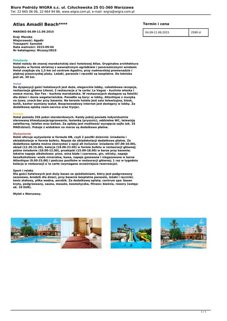Biuro Podróży WIGRA s.c. ul. Człuchowska 25 01-360 Warszawa Tel. 22 665 06 06, 22 664 94 86, www.wigra.com.pl, e-mail: [email protected] Atlas Amadil Beach**** MAROKO 04.09-11.09.2015 Termin i cena 04.09-11.09.2015 2599 zł Kraj: Maroko Miejscowość: Agadir Transport: Samolot Data ważności: 2015-09-04 Nr katalogowy: Wczasy/2015 Położenie Hotel należy do znanej marokańskiej sieci hotelowej Atlas. Oryginalna architektura budynku w formie atrialnej z wewnętrznym ogródkiem i panoramicznymi windami. Hotel znajduje się 1,5 km od centrum Agadiru, przy nadmorskiej promenadzie i pięknej piaszczystej plaży. Leżaki, parasole i ręczniki są bezpłatne. Do lotniska jest ok. 30 km. Hotel Do dyspozycji gości hotelowych jest duże, eleganckie lobby, całodobowa recepcja, restauracja główna Litoral, 2 restauracje a`la carte: La Vague – kuchnia włoska i owoce morza, Dar Fes – kuchnia marokańska. W restauracjach dostępne są foteliki dla dzieci i dania wegetariańskie. Ponadto są bary: w lobby, Atlantique z muzyką na żywo, snack-bar przy basenie. Na terenie hotelu jest sala telewizyjna, kiosk, butik, kantor wymiany walut. Bezprzewodowy internet jest dostępny w lobby. Za dodatkową opłatą room-service oraz fryzjer. Pokoje Hotel posiada 326 pokoi standardowych. Każdy pokój posiada indywidualnie sterowaną klimatyzacje/ogrzewanie, łazienkę (prysznic), oddzielne WC, telewizję satelitarną, telefon oraz balkon. Za opłatą jest możliwość wynajęcia sejfu (ok. 25 MAD/dzień). Pokoje z widokiem na morze są dodatkowo płatne. Wyżywienie Hotel oferuje wyżywienie w formule HB, czyli 2 posiłki dziennie: śniadania i obiadokolacje w formie bufetu. Napoje do obiadokolacji dodatkowo płatne. Za dodatkowa opłata można skorzystać z opcji all inclusive: śniadanie (07.00-10.00), obiad (12.30-15.00), kolacja (19.00-22.00) w formie bufetu w restauracji głównej; późne śniadanie (10.00-12.00), przekąski (15.00-18.00) w barze przy basenie; lokalne napoje alkoholowe: piwo, wina białe i czerwone, gin, whisky, napoje bezalkoholowe: woda mineralna, kawa, napoje gazowane i niegazowane w barze Atlantique (9.00-23.00) i podczas posiłków w restauracji głównej; 1 raz w tygodniu kolacja w restauracji a`la carte (wymagana wcześniejsza rezerwacja). Sport i relaks Dla gości hotelowych jest duży basen ze zjeżdżalniami, który jest podgrzewany sezonowo, brodzik dla dzieci, przy basenie bezpłatne parasole, leżaki i ręczniki; tenis stołowy, piłka wodna, aerobik. Za dodatkową opłatą: centrum spa: basen kryty, podgrzewany, sauna, masaże, kosmetyczka, fitness: bieżnia, rowery (wstęp: ok. 10 EUR). Wylot z Warszawy. 1/1 Powered by TCPDF (www.tcpdf.org)