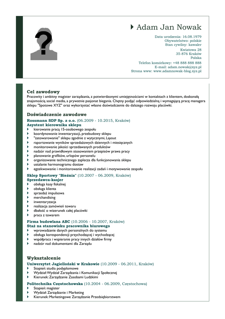 } Adam Jan Nowak Data urodzenia: 16.08.1979 Obywatelstwo: polskie Stan cywilny: kawaler Kwiatowa 28 35-876 Kraków Polska Telefon komórkowy: +48 888 888 888 E-mail: [email protected] Strona www: www.adamnowak-blog.xyz.pl Cel zawodowy Pracowity i ambitny magister zarządzania, z potwierdzonymi umiejętnościami w kontaktach z klientem, doskonałą znajomością social media, a prywatnie pasjonat biegania. Chętny podjąć odpowiedzialną i wymagającą pracę managera sklepu "Spotowe XYZ" oraz wykorzystać własne doświadczenie do dalszego rozwoju placówki. Doświadczenie zawodowe Rossmann SDP Sp. z o.o. (06.2009 - 10.2015, Kraków) Asystent kierownika sklepu } kierowanie pracą 15-osobowego zespołu } koordynowanie inwentaryzacji, przebudowy sklepu } ''zatowarowanie'' sklepu zgodnie z wytycznymi, Layout } raportowanie wyników sprzedażowych dziennych i miesięcznych } monitorowanie jakości sprzedawanych produktów } nadzór nad prawidłowym stosowaniem przepisów prawa pracy } planowanie grafików, urlopów personelu } organizowanie technicznego zaplecza dla funkcjonowania sklepu } ustalanie harmonogramu dostaw } egzekwowanie i monitorowanie realizacji zadań i motywowanie zespołu Sklep Sportowy "Bieżnia" (10.2007 - 06.2009, Kraków) Sprzedawca-kasjer } obsługa kasy fiskalnej } obsługa klienta } sprzedaż impulsowa } merchandising } inwentaryzacja } realizacja zamówień towaru } dbałość o wizerunek całej placówki } praca z towarem Firma budowlana ABC (10.2006 - 10.2007, Kraków) Staż na stanowisku pracownika biurowego } wprowadzanie danych personalnych do systemu } obsługa korespondencji przychodzącej i wychodzącej } współpraca i wspieranie pracy innych działów firmy } nadzór nad dokumentami dla Zarządu Wykształcenie Uniwersytet Jagielloński w Krakowie (10.2009 - 06.2011, Kraków) } Stopień: studia podyplomowe } Wydział: Wydział Zarządzania i Komunikacji Społecznej } Kierunek: Zarządzanie Zasobami Ludzkimi Politechnika Częstochowska (10.2004 - 06.2009, Częstochowa) } Stopień: magister } Wydział: Zarządzanie i Marketing } Kierunek: Marketingowe Zarządzanie Przedsiębiorstwem Adam Jan Nowak Szkolenia Social Media Marketing (Akademia Biznesu Danone 2011) (03.2011) Motywowanie pracowników (Akademia Rozwoju Umiejętności) (01.2015) Certyfikaty i uprawnienia Prawo jazdy kat. B (01.2000) Umiejętności Społeczne: umiejętność rozwiązywania problemów (3), komunikacja interpersonalna (4), łatwość w nawiązywaniu kontaktów (3) Techniczne: obsługa pakietu MS Office (4), obsługa kasy fiskalnej (4) Inne: zbajomość branży social media (4), znajomość branży sportowej i biegowej (3) (*) poziom umiejętności: 1 - początkujący, 2 - średniozaawansowany, 3 - zaawansowany, 4 - biegły Języki } } angielski: średniozaawansowany (FCE) rosyjski: początkujący Informacje dodatkowe Biegacz amator (półmaraton przebiegnięty w 1:55:29) i autor poczytnego bloga www.adamnowak-blog.xyz.pl, poświęconego tematyce sportowej. Hobby biegi długodystansowe, sporty wodne, podróże, trendy społeczne, nowinki technologiczne Wyrażam zgodę na przetwarzanie moich danych osobowych dla potrzeb procesu rekrutacji zgodnie z ustawą z dnia 29.08.1997r. Dz. U. z 2002 r., Nr 101, poz. 926 ze zm. Strona 2 | Telefon komórkowy: +48 888 888 888 | [email protected]