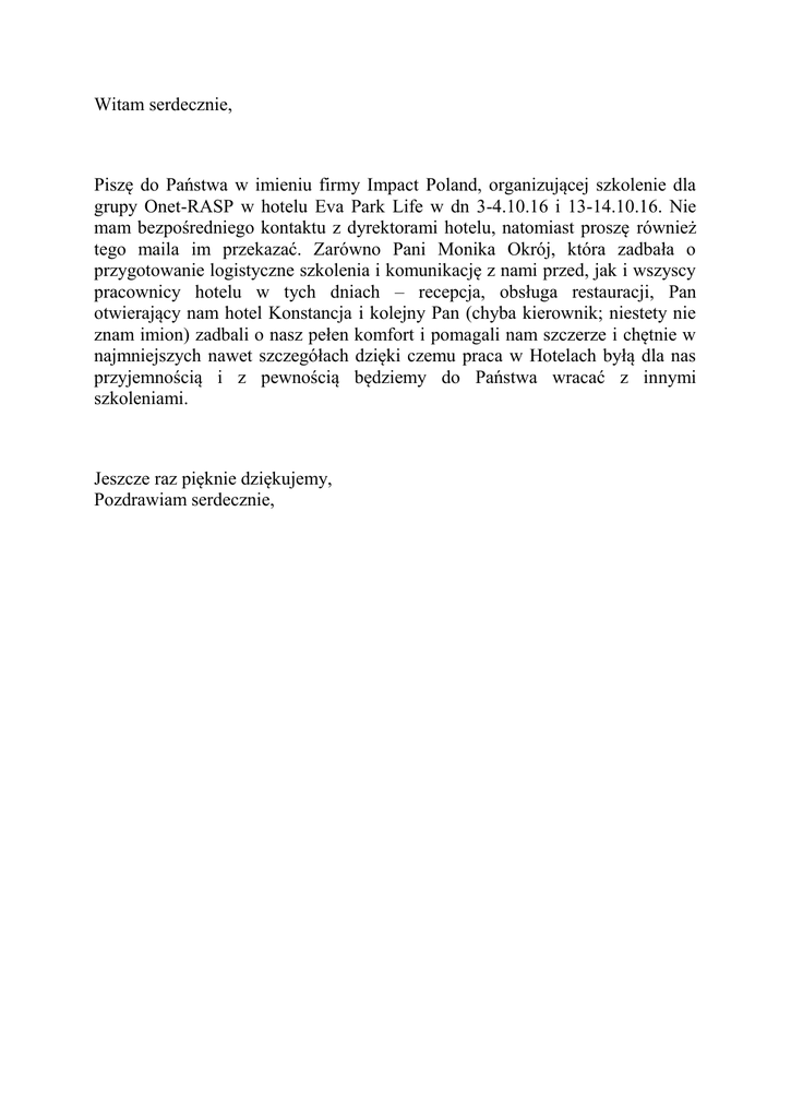 Witam serdecznie, Piszę do Państwa w imieniu firmy Impact Poland, organizującej szkolenie dla grupy Onet-RASP w hotelu Eva Park Life w dn 3-4.10.16 i 13-14.10.16. Nie mam bezpośredniego kontaktu z dyrektorami hotelu, natomiast proszę również tego maila im przekazać. Zarówno Pani Monika Okrój, która zadbała o przygotowanie logistyczne szkolenia i komunikację z nami przed, jak i wszyscy pracownicy hotelu w tych dniach – recepcja, obsługa restauracji, Pan otwierający nam hotel Konstancja i kolejny Pan (chyba kierownik; niestety nie znam imion) zadbali o nasz pełen komfort i pomagali nam szczerze i chętnie w najmniejszych nawet szczegółach dzięki czemu praca w Hotelach byłą dla nas przyjemnością i z pewnością będziemy do Państwa wracać z innymi szkoleniami. Jeszcze raz pięknie dziękujemy, Pozdrawiam serdecznie,