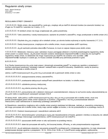 Regulamin strefy zmian. Autor: Marek Góralczyk 10.01.2007. Zmieniony 11.01.2007. REGULAMIN STREFY ZMIAN  1.      Strefy zmian, dla zawodników z pola gry, znajduj± siê po dwóch stronach boiska (na zewn±trz boiska) i s± d³ugie na 15 metrów i szerokie na 3 metry. (1:7) 2.      W strefach zmian nie mog± znajdowaæ siê ¿adne przedmioty. 3.      Tylko zawodnicy i osoby towarzysz±ce, wpisane do protoko³u zawodów, mog± przebywaæ w strefie zmian (4:2, 4:6). 4.      Obydwie dru¿yny znajduj± siê w strefach zmian, po stronie boiska wybranej w wyniku losowania (1:7, 2:1). 5.      Osoby towarzysz±ce, znajduj±ce siê w strefie zmian, musz± posiadaæ ubiór sportowy. 6.      Je¿eli zachodzi potrzeba obecno¶ci t³umacza, to musi on zaj±æ miejsce poza stref± zmian. 7.      Sêdziowie: mierz±cy czas i sekretarz musz± pomagaæ sêdziom w kontroli przestrzegania regulaminu strefy zmian przed i w czasie meczu. Je¿eli przed meczem zostan± stwierdzone nieprawid³owo¶ci w stosunku do wymogów regulaminu strefy zmian, to sêdziowie nie mog± rozpocz±æ gry dopóki nie zostan± one usuniête. Je¶li nieprawid³owo¶ci wyst±pi± w czasie gry, to musz± zostaæ usuniête przy pierwszej przerwie w grze. 8.       a) Osoby towarzysz±ce dru¿ynie maj± prawo i obowi±zek prowadziæ zespó³ w czasie gry zgodnie z przepisami i duchem sportowej rywalizacji, udzielaj±c zaleceñ i wskazówek w sposób kulturalny. Zasadniczo, osoby te powinny siedzieæ lub klêczeæ w strefie zmian. Jedna z osób towarzysz±cych dru¿ynie mo¿e poruszaæ siê w granicach strefy zmian w celu: -         zadysponowania zmiany zawodników, -         przekazania taktycznych wskazówek zawodnikom na boisku i w strefie zmian, -         udzielenia pomocy medycznej, -         za¿±dania przerwy dla dru¿yny, -         porozumienia siê z sêdziom mierz±cym czas/sekretarzem; dotyczy to wy³±cznie osoby odpowiedzialnej za dru¿ynê i tylko w wyj±tkowych sytuacjach (przepis 4:6). W danej chwili , tylko jedna z osób towarzysz±cych ka¿dej z dru¿yn mo¿e poruszaæ siê w strefie zmian, musi ona jednak przestrzegaæ granic strefy zmian opisanych w punkcie 1 regulaminu i nie mo¿e przeszkadzaæ sêdziom mierz±cemu czas/ sekretarzowi w obserwacji przebiegu zawodów. b) Zasadniczo, zawodnicy znajduj±cy siê w strefie zmian powinni siedzieæ lub klêczeæ. Jednak¿e, zawodnicy zmieniaj±cy siê mog± poruszaæ siê w strefie zmian, kiedy maj± zamiar wej¶æ na boisko, o ile nie przeszkadza to w przebiegu meczu. c)      Osobom towarzysz±cym i zawodnikom zabrania siê: -         demonstracyjnie i prowokuj±co wyra¿aæ niezadowolenie (s³ownie, gestami i mimik±) w stosunku do: sêdzià delegatów, sêdziego mierz±cego czas/sekretarza, osób towarzysz±cych lub widzów; -         opuszczaæ strefê zmian w celu wp³ywania na przebieg meczu; -         staæ lub poruszaæ siê wzd³u¿ linii bocznej boiska, równie¿ w celu przeprowadzenia rozgrzewki. 9.      Je¿eli sêdziowie stwierdz± naruszenie przepisów wynikaj±cych z niniejszego regulaminu, to maj± obowi±zek podejmowaæ decyzje zgodnie z przepisami: 16:1d, 16:2c-d lub 16:6b, e, h (zwrócenie uwagi gestem, wykluczenie, http://www.niewiem.webd.pl/plaza Kreator PDF Utworzono 2 March, 2017, 14:11 dyskwalifikacja). 10.  Naruszenia przepisów niniejszego regulaminu, w czasie meczu, niezauwa¿one przez sêdziów, a stwierdzone przez sêdziów: mierz±cego czas/sekretarza, powinny byæ przez nich przekazane sêdziom w czasie najbli¿szej przerwy w grze. 11.  Delegat IHF, EHF lub ZPRP na dane zawody ma prawo zwróciæ uwagê sêdziom (przy najbli¿szej przerwie w grze) na naruszenie przepisów gry lub regulaminu strefy zmian (z wy³±czeniem przypadków, gdy decyzja zosta³a podjêta przez sêdziów na podstawie ich w³asnej obserwacji zdarzeñ). W powy¿szym przypadku gra musi byæ wznowiona rzutem odpowiednim do sytuacji powoduj±cej przerwê w grze. Jednak¿e, je¶li delegat IHF, EHF lub ZPRP przerwie natychmiast grê, z powodu naruszenia przepisów przez jedn± z dru¿yn, wówczas gra jest wznawiana przez dru¿ynê, która nie pope³ni³a przewinienia (rzutem wolnym, a je¶li dru¿yna ta by³a w sytuacji pewnej do zdobycia bramki – rzutem karnym). Pope³niaj±cy przewinienie zawodnik lub osoba towarzysz±ca dru¿ynie powinni zostaæ ukarani przez sêdziów; w protokóle zawodów nale¿y szczegó³owo opisaæ zdarzenie. Je¿eli sêdziowie nie zareaguj± na przypadki naruszenia przepisów regulaminu strefy zmian, pomimo, ¿e zostali o nich poinformowani, to delegat IHF, EHF lub ZPRP jest zobowi±zany do sporz±dzenia raportu w tej sprawie i przes³ania go do odpowiednich w³adz. W³adze te podejmuj± decyzjê w stosunku do: opisanych przypadków naruszenia przepisów oraz sêdziów. http://www.niewiem.webd.pl/plaza Kreator PDF Utworzono 2 March, 2017, 14:11