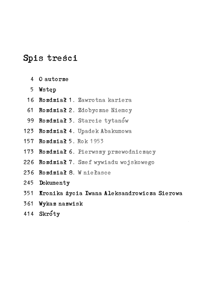 Spis treści 4 O autorze 5 Wstęp 16 Rozdział 1. Zawrotna kariera 61 Rozdział 2. Zdobyczne Niemcy 99 Rozdział 3. Starcie tytanów 123 Rozdział 4. Upadek Abakumowa 157 Rozdział 5. Rok 1953 173 Rozdział 6. Pierwszy przewodniczący 226 Rozdział 7. Szef wywiadu wojskowego 236 Rozdział 8. W niełasce 245 Dokumenty 351 Kronika życia Iwana Aleksandrowicza Sierowa 361 Wykaz nazwisk 414 Skróty