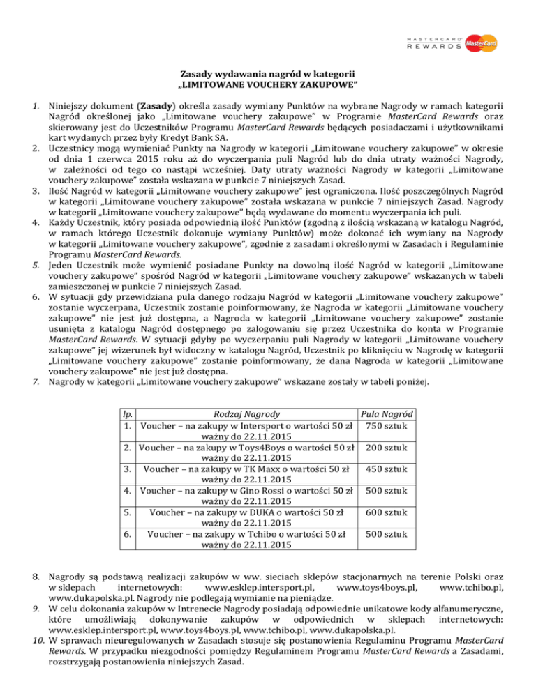 Zasady wydawania nagród w kategorii „LIMITOWANE VOUCHERY ZAKUPOWE” 1. Niniejszy dokument (Zasady) określa zasady wymiany Punktów na wybrane Nagrody w ramach kategorii Nagród określonej jako „Limitowane vouchery zakupowe” w Programie MasterCard Rewards oraz skierowany jest do Uczestników Programu MasterCard Rewards będących posiadaczami i użytkownikami kart wydanych przez były Kredyt Bank SA. 2. Uczestnicy mogą wymieniać Punkty na Nagrody w kategorii „Limitowane vouchery zakupowe” w okresie od dnia 1 czerwca 2015 roku aż do wyczerpania puli Nagród lub do dnia utraty ważności Nagrody, w zależności od tego co nastąpi wcześniej. Daty utraty ważności Nagrody w kategorii „Limitowane vouchery zakupowe” została wskazana w punkcie 7 niniejszych Zasad. 3. Ilość Nagród w kategorii „Limitowane vouchery zakupowe” jest ograniczona. Ilość poszczególnych Nagród w kategorii „Limitowane vouchery zakupowe” została wskazana w punkcie 7 niniejszych Zasad. Nagrody w kategorii „Limitowane vouchery zakupowe” będą wydawane do momentu wyczerpania ich puli. 4. Każdy Uczestnik, który posiada odpowiednią ilość Punktów (zgodną z ilością wskazaną w katalogu Nagród, w ramach którego Uczestnik dokonuje wymiany Punktów) może dokonać ich wymiany na Nagrody w kategorii „Limitowane vouchery zakupowe”, zgodnie z zasadami określonymi w Zasadach i Regulaminie Programu MasterCard Rewards. 5. Jeden Uczestnik może wymienić posiadane Punkty na dowolną ilość Nagród w kategorii „Limitowane vouchery zakupowe” spośród Nagród w kategorii „Limitowane vouchery zakupowe” wskazanych w tabeli zamieszczonej w punkcie 7 niniejszych Zasad. 6. W sytuacji gdy przewidziana pula danego rodzaju Nagród w kategorii „Limitowane vouchery zakupowe” zostanie wyczerpana, Uczestnik zostanie poinformowany, że Nagroda w kategorii „Limitowane vouchery zakupowe” nie jest już dostępna, a Nagroda w kategorii „Limitowane vouchery zakupowe” zostanie usunięta z katalogu Nagród dostępnego po zalogowaniu się przez Uczestnika do konta w Programie MasterCard Rewards. W sytuacji gdyby po wyczerpaniu puli Nagrody w kategorii „Limitowane vouchery zakupowe” jej wizerunek był widoczny w katalogu Nagród, Uczestnik po kliknięciu w Nagrodę w kategorii „Limitowane vouchery zakupowe” zostanie poinformowany, że dana Nagroda w kategorii „Limitowane vouchery zakupowe” nie jest już dostępna. 7. Nagrody w kategorii „Limitowane vouchery zakupowe” wskazane zostały w tabeli poniżej. lp. Rodzaj Nagrody Pula Nagród 1. Voucher – na zakupy w Intersport o wartości 50 zł 750 sztuk ważny do 22.11.2015 2. Voucher – na zakupy w Toys4Boys o wartości 50 zł 200 sztuk ważny do 22.11.2015 3. Voucher – na zakupy w TK Maxx o wartości 50 zł 450 sztuk ważny do 22.11.2015 4. Voucher – na zakupy w Gino Rossi o wartości 50 zł 500 sztuk ważny do 22.11.2015 5. Voucher – na zakupy w DUKA o wartości 50 zł 600 sztuk ważny do 22.11.2015 6. Voucher – na zakupy w Tchibo o wartości 50 zł 500 sztuk ważny do 22.11.2015 8. Nagrody są podstawą realizacji zakupów w ww. sieciach sklepów stacjonarnych na terenie Polski oraz w sklepach internetowych: www.esklep.intersport.pl, www.toys4boys.pl, www.tchibo.pl, www.dukapolska.pl. Nagrody nie podlegają wymianie na pieniądze. 9. W celu dokonania zakupów w Intrenecie Nagrody posiadają odpowiednie unikatowe kody alfanumeryczne, które umożliwiają dokonywanie zakupów w odpowiednich w sklepach internetowych: www.esklep.intersport.pl, www.toys4boys.pl, www.tchibo.pl, www.dukapolska.pl. 10. W sprawach nieuregulowanych w Zasadach stosuje się postanowienia Regulaminu Programu MasterCard Rewards. W przypadku niezgodności pomiędzy Regulaminem Programu MasterCard Rewards a Zasadami, rozstrzygają postanowienia niniejszych Zasad.