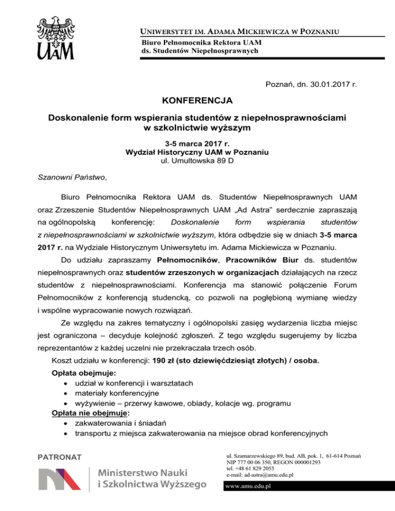 Biuro Pełnomocnika Rektora UAM ds. Studentów Niepełnosprawnych Poznań, dn. 30.01.2017 r. KONFERENCJA Doskonalenie form wspierania studentów z niepełnosprawnościami w szkolnictwie wyższym 3-5 marca 2017 r. Wydział Historyczny UAM w Poznaniu ul. Umultowska 89 D Szanowni Państwo, Biuro Pełnomocnika Rektora UAM ds. Studentów Niepełnosprawnych UAM oraz Zrzeszenie Studentów Niepełnosprawnych UAM „Ad Astra” serdecznie zapraszają na ogólnopolską konferencję: Doskonalenie form wspierania studentów z niepełnosprawnościami w szkolnictwie wyższym, która odbędzie się w dniach 3-5 marca 2017 r. na Wydziale Historycznym Uniwersytetu im. Adama Mickiewicza w Poznaniu. Do udziału zapraszamy Pełnomocników, Pracowników Biur ds. studentów niepełnosprawnych oraz studentów zrzeszonych w organizacjach działających na rzecz studentów z niepełnosprawnościami. Konferencja ma stanowić połączenie Forum Pełnomocników z konferencją studencką, co pozwoli na pogłębioną wymianę wiedzy i wspólne wypracowanie nowych rozwiązań. Ze względu na zakres tematyczny i ogólnopolski zasięg wydarzenia liczba miejsc jest ograniczona – decyduje kolejność zgłoszeń. Z tego względu sugerujemy by liczba reprezentantów z każdej uczelni nie przekraczała trzech osób. Koszt udziału w konferencji: 190 zł (sto dziewięćdziesiąt złotych) / osoba. Opłata obejmuje: udział w konferencji i warsztatach materiały konferencyjne wyżywienie – przerwy kawowe, obiady, kolacje wg. programu Opłata nie obejmuje: zakwaterowania i śniadań transportu z miejsca zakwaterowania na miejsce obrad konferencyjnych PATRONAT www.ci.amu.edu.pl a ul. Szamarzewskiego 89, bud. AB, pok. 1, 61-614 Poznań NIP 777 00 06 350, REGON 000001293 tel. +48 61 829 2055 e-mail: [email protected] www.amu.edu.pl W trakcie konferencji zapewniamy: pomoc wolontariuszy, w tym pomoc w dotarciu na miejsce konferencji tłumacza języka migowego (wyłącznie po uprzednim zgłoszeniu takiej potrzeby) stenotypistę uwzględnienie indywidualnych potrzeb w zakresie wyżywienia (po uprzednim zgłoszeniu) certyfikat udziału w konferencji Zgłoszenia na konferencję: WYŁĄCZNIE poprzez wypełnienie formularza on-line dostępnego na stronie BON UAM: http://studenci.amu.edu.pl/studia/niepelnosprawni - KONFERENCJA (tutaj) Link bezpośredni do formularza zgłoszeniowego TUTAJ Zgłoszenia przyjmujemy do 24 lutego 2017 r. Opłata za udział: Po wypełnieniu formularza zgłoszeniowego należy dokonać płatności 190 zł / osoba na subkonto konferencji: Uniwersytet im. Adama Mickiewicza w Poznaniu ul. Wieniawskiego 1, 61-712 Poznań Nr konta (BZ WBK): 77 1090 1362 0000 0000 3601 7903 Tytułem: K00000667 – imię i nazwisko Płatność MUSI być dokonana przed konferencją (warunek udziału). Nie ma możliwości płatności po konferencji. Termin wpłat mija 24 lutego 2017. Wpłata stanowi potwierdzenie udziału w konferencji. Brak wpłaty oznacza rezygnację z udziału. Faktura VAT za opłacenie udziału w konferencji będzie gotowa do odbioru w trakcie konferencji w dniach 3-5 marca 2017 r. pod warunkiem prawidłowego podania danych do faktury przez Uczestnika w formularzu zgłoszeniowym. *** Serdecznie zachęcamy Państwa do udziału w tym ważnym wydarzeniu. W razie jakichkolwiek pytań zapraszamy do kontaktu. Kontakt: Krzysztof Osóbka [email protected] i telefonicznego (0-61) 829 2243. Z poważaniem, Anna Rutz Pełnomocniczka Rektora UAM ds. Studentów z niepełnosprawnościami PATRONAT www.ci.amu.edu.pl a ul. Szamarzewskiego 89, bud. AB, pok. 1, 61-614 Poznań NIP 777 00 06 350, REGON 000001293 tel. +48 61 829 2055 e-mail: [email protected] www.amu.edu.pl Miejsca hotelowe jakie polecamy: Dom Studencki Jowita UAM – zarezerwowana część hotelowa o podwyższonym standardzie, do wyboru pokój przystosowany, liczba miejsc ograniczona. http://dsjowita.home.amu.edu.pl/pokoje-goscinne/standard-podwyzszony/ Ceny: 70 – 150 zł ul. Zwierzyniecka 7 60-813 Poznań e-mail: [email protected] (rezerwacje) Recepcja tel. 61 829 2500, 519 340 588 Hotel Topaz – blisko centrum i dworca PKP, pełna dostępność obiektu, do wyboru pokój przystosowany, liczba miejsc ograniczona. http://hotel-topaz.pl/pokoje ul. Przemysłowa 34A 61-579 Poznań e-mail: [email protected] tel/fax: (61) 833 39 04 lub tel/fax: (61) 833 76 00 kom.: +48 507 12 17 99 Hostel Fusion – dobre ceny, blisko dworca PKP, winda http://www.fusionhostel.pl/rezerwacja-hostel-poznan-centrum ul. św. Marcin 66/72, 61-808 Poznań [email protected] tel. +48 61 852 12 30 *** Sprawdź dojazd na Wydział Historyczny UAM, ul. Umultowska 89 D, za pomocą: poznan.jakdojade.pl PATRONAT www.ci.amu.edu.pl a ul. Szamarzewskiego 89, bud. AB, pok. 1, 61-614 Poznań NIP 777 00 06 350, REGON 000001293 tel. +48 61 829 2055 e-mail: [email protected] www.amu.edu.pl