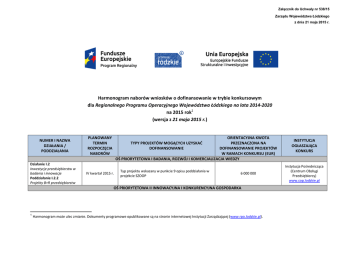 Załącznik do Uchwały nr 538/15 Zarządu Województwa Łódzkiego z dnia 21 maja 2015 r. Harmonogram naborów wniosków o dofinansowanie w trybie konkursowym dla Regionalnego Programu Operacyjnego Województwa Łódzkiego na lata 2014-2020 na 2015 rok1 (wersja z 21 maja 2015 r.) NUMER I NAZWA DZIAŁANIA / PODDZIAŁANIA Działanie I.2 Inwestycje przedsiębiorstw w badania i innowacje Poddziałanie I.2.2 Projekty B+R przedsiębiorstw PLANOWANY TERMIN ROZPOCZĘCIA NABORÓW ORIENTACYJNA KWOTA PRZEZNACZONA NA DOFINANSOWANIE PROJEKTÓW W RAMACH KONKURSU (EUR) OŚ PRIORYTETOWA I BADANIA, ROZWÓJ I KOMERCJALIZACJA WIEDZY TYPY PROJEKTÓW MOGĄCYCH UZYSKAĆ DOFINANSOWANIE IV kwartał 2015 r. Typ projektu wskazany w punkcie 9 opisu poddziałania w projekcie SZOOP 6 000 000 OŚ PRIORYTETOWA II INNOWACYJNA I KONKURENCYJNA GOSPODARKA 1 Harmonogram może ulec zmianie. Dokumenty programowe opublikowane są na stronie internetowej Instytucji Zarządzającej (www.rpo.lodzkie.pl). INSTYTUCJA OGŁASZAJĄCA KONKURS Instytucja Pośrednicząca (Centrum Obsługi Przedsiębiorcy) www.cop.lodzkie.pl Działanie II.1 Otoczenie biznesu Poddziałanie II.1.1 Tereny inwestycyjne Działanie II.2 Internacjonalizacja przedsiębiorstw Poddziałanie II.2.2 Promocja gospodarcza regionu Działanie II.3 Zwiększenie konkurencyjności MŚP Poddziałanie II.3.1 Innowacje w MŚP II/III kwartał 2015 r. Typ projektu wskazany w punkcie 9 opisu poddziałania w projekcie SZOOP III kwartał 2015 Typy projektów wskazane w punkcie 9 opisu poddziałania w projekcie SZOOP IV kwartał 2015 r. Typy projektów wskazane w punkcie 9 opisu poddziałania w projekcie SZOOP 12 000 000 Instytucja Pośrednicząca (Centrum Obsługi Przedsiębiorcy) www.cop.lodzkie.pl 3 000 000 Instytucja Pośrednicząca (Centrum Obsługi Przedsiębiorcy) www.cop.lodzkie.pl 12 000 000 Instytucja Pośrednicząca (Centrum Obsługi Przedsiębiorcy) www.cop.lodzkie.pl OŚ PRIORYTETOWA III TRANSPORT Działanie III.1 Niskoemisyjny transport miejski Poddziałanie III.1.1 Niskoemisyjny transport miejski - ZIT Działanie III.1 Niskoemisyjny transport miejski Poddziałanie III.1.2 Niskoemisyjny transport miejski Działanie III.2 Drogi Poddziałanie III.2.1 Drogi wojewódzkie Działanie III.2 Drogi Poddziałanie III.2.2 Drogi lokalne Wsparcie udzielane będzie wyłącznie w trybie pozakonkursowym IV kwartał 2015 r. Typy projektów wskazane w punkcie 9 opisu poddziałania w projekcie SZOOP 66 885 740 Instytucja Zarządzająca RPO WŁ 2014-2020 www.rpo.lodzkie.pl II/III kwartał 2015 r. Typy projektów wskazane w punkcie 9 opisu poddziałania w projekcie SZOOP 68 000 000 Instytucja Zarządzająca RPO WŁ 2014-2020 www.rpo.lodzkie.pl 22 560 000 Instytucja Zarządzająca RPO WŁ 2014-2020 www.rpo.lodzkie.pl Przewiduje się także wsparcie w trybie pozakonkursowym III kwartał 2015 r. Typy projektów wskazane w punkcie 9 opisu poddziałania w projekcie SZOOP OŚ PRIORYTETOWA IV GOSPODARKA NISKOEMISYJNA Działanie IV.1 Odnawialne źródła energii Poddziałanie IV.1.1 Odnawialne źródła energii – ZIT Wsparcie udzielane będzie wyłącznie w trybie pozakonkursowym Działanie IV.2 Termomodernizacja budynków Poddziałanie IV.2.1 Termomodernizacja budynków – ZIT Działanie IV.2 Termomodernizacja budynków Poddziałanie IV.2.2 Termomodernizacja budynków Działanie IV.3 Ochrona powietrza Poddziałanie IV.3.1 Ochrona powietrza – ZIT Wsparcie udzielane będzie wyłącznie w trybie pozakonkursowym IV kwartał 2015 r. Typ projektu wskazany w punkcie 9 opisu poddziałania w projekcie SZOOP 27 770 982 Instytucja Zarządzająca RPO WŁ 2014-2020 www.rpo.lodzkie.pl 1 561 217 Instytucja Zarządzająca RPO WŁ 2014-2020 www.rpo.lodzkie.pl 11 491 961 Instytucja Zarządzająca RPO WŁ 2014-2020 www.rpo.lodzkie.pl Wsparcie udzielane będzie wyłącznie w trybie pozakonkursowym OŚ PRIORYTETOWA V OCHRONA ŚRODOWISKA Działanie V.1 Gospodarka wodna i przeciwdziałanie zagrożeniom Poddziałanie V.1.2 Rozwój Krajowego Systemu Ratowniczo-Gaśniczego Działanie V.3 Gospodarka wodnokanalizacyjna Poddziałanie V.3.1 Gospodarka wodnokanalizacyjna – ZIT Działanie V.4 Ochrona przyrody III kwartał 2015 r. Typ projektu wskazany w punkcie 9 opisu poddziałania w projekcie SZOOP Wsparcie udzielane będzie wyłącznie w trybie pozakonkursowym IV kwartał 2015 r. Typy projektów wskazane w punkcie 9 opisu działania w projekcie SZOOP OŚ PRIORYTETOWA VI REWITALIZACJA I POTENCJAŁ ENDOGENICZNY REGIONU Działanie VI.1 Dziedzictwo kulturowe i infrastruktura kultury Poddziałanie VI.1.1 Dziedzictwo kulturowe i infrastruktura kultury – ZIT Wsparcie udzielane będzie wyłącznie w trybie pozakonkursowym Działanie VI.3 Rewitalizacja i rozwój potencjału społecznogospodarczego Poddziałanie VI.3.1 Rewitalizacja i rozwój potencjału społecznogospodarczego – ZIT Wsparcie udzielane będzie wyłącznie w trybie pozakonkursowym OŚ PRIORYTETOWA VII INFRASTRUKTURA DLA USŁUG SPOŁECZNYCH Działanie VII.1 Technologie informacyjnokomunikacyjne Poddziałanie VII.1.1 Technologie informacyjnokomunikacyjne – ZIT Wsparcie udzielane będzie wyłącznie w trybie pozakonkursowym OŚ PRIORYTETOWA VIII ZATRUDNIENIE Działanie VIII.1 Wsparcie aktywności zawodowej osób po 29. roku życia przez powiatowe urzędy pracy Działanie VIII.3 Wsparcie przedsiębiorczości Poddziałanie VIII.3.1 Wsparcie przedsiębiorczości w formach bezzwrotnych Działanie VIII.3 Wsparcie przedsiębiorczości Poddziałanie VIII.3.3 Wsparcie przedsiębiorczości w formach bezzwrotnych - ZIT Wsparcie udzielane będzie wyłącznie w trybie pozakonkursowym (planowany termin rozpoczęcia naboru II/III kwartał 2015 r., beneficjentami będą powiatowe urzędy pracy województwa łódzkiego) IV kwartał 2015 r. IV kwartał 2015 r. Typy projektów wskazane w punkcie 9 opisu poddziałania w projekcie SZOOP Typy projektów wskazane w punkcie 9 opisu poddziałania w projekcie SZOOP 11 400 000 Instytucja Pośrednicząca (Wojewódzki Urząd Pracy w 