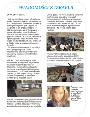 WIADOMOŚCI Z IZRAELA 26.11.2015, Izrael. Już od miesiąca trwają nieustające ataki. Palestyńczykom nie zależy na ich zatrzymaniu, ponieważ im więcej terrorystów ginie, tym „lepiej” to wygląda w ich propagandzie, w której, pomijając swój terroryzm, pokazują światu dane liczbowe! Sposób ten niestety często działa, gdyż ludzie na Zachodzie całkowicie ignorują fakty. Mają podane ilości ludzi, którzy zginęli po obu stronach, a liczby mają wskazywać na winę Izraela! Prowadzi to do kolejnych rezolucji ONZ potępiających Izrael. Módlmy się, aby oczy ludzie się otworzyły oraz aby mieli trzeźwe myślenie. Około 11.00. miał miejsce atak nożownika w Tapuach na punkcie kontrolnym (skrzyżowanie w Samarii). Terrorysta wyskoczył z nożem z powoli przejeżdżającego samochodu i próbował zaatakować żołnierzy. Nie zdążył nikogo zranić, został zastrzelony. Samochód oddalił się z miejsca ataku. Około 22.50 Palestyńczycy obrzucali bombami zapalającymi minibus koło Modiin. Ciężko poparzony kierowca został odtransportowany do szpitala. Około godz. 13.00 w regionie Biniamin miał miejsce poważny wypadek opancerzonego autobusu wiozącego żołnierzy. Autobus, unikając zderzenia z samochodem, wywrócił się. Ok. 40 osób zostało rannych, zginęła jedna żołnierka –19-letnia kapral Stav Partush. W akcji ratowniczej wzięła udział elitarna jednostka specjalna „669”. Przy pomocy helikopterów natychmiast odtransportowała rannych do szpitali. DziewczynaIzraelka, która zginęła w wypadku autobusu, kapral Stav Partush Minister obrony, Mosze Jaalon, poinformował parlament o planie wybudowania bariery bezpieczeństwa oddzielającej Hebron od osiedla żydowskiego Kiryat Arba. Ma to być całkowicie hermetyczny i zaawansowany technologicznie mur, który powstanie w ciągu roku. Bezpośrednią przyczyną podjęcia decyzji o jego budowie był ostatni wzrost ataków terrorystycznych i spadek poczucia bezpieczeństwa mieszkańców Kiryat Arba. Na skutek ostatniego zestrzelenia samolotu rosyjskiego przez Turcję i ze względu na brak przeprosin z ich strony, władze w Rosji zapowiedziały, że wstrzymają większość dostaw owoców i warzyw z Turcji i kupować będą te produkty od Izraela. Kiedy Europa postanawia bojkotować produkty rolne z Izraela, znalazł się inny duży odbiorca. Jak podają izraelskie media, zjawiły się setki, a nawet tysiące gości, a wśród nich niespodziewanie i żona premiera Netanjahu. Niech „w radość zamieni się ich płacz”. Radujmy się mimo wszystko, jak mówi znana żydowska pieśń „Hava Nagila”. Wiadomości oraz zdjęcia zebrał Jarosław Papiór Dziękujmy Bogu, który sam o sobie mówi, że Jego imię jest: Jahwe Jireh (Bóg naszym zaopatrzeniem). Jego wierność jest zadziwiająca. Odbył sie zapowiadany ślub Sary Litman, której ojciec i brat zginęłi w ataku terrorystycznym tydzień przed planowanym weselem. Tak, jak zapowiadano, zaproszeni byli wszyscy chętni. Korekta oraz opracowanie graficzne Stowarzyszenie Służba Szalom w Oświęcimiu