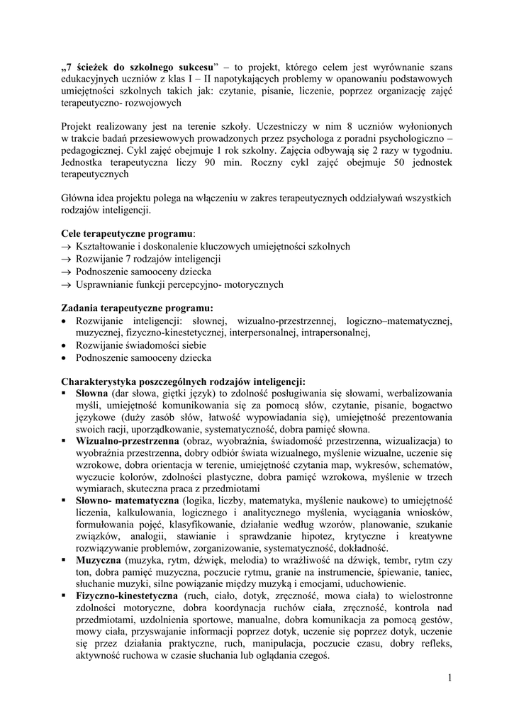 „7 ścieżek do szkolnego sukcesu” – to projekt, którego celem jest wyrównanie szans edukacyjnych uczniów z klas I – II napotykających problemy w opanowaniu podstawowych umiejętności szkolnych takich jak: czytanie, pisanie, liczenie, poprzez organizację zajęć terapeutyczno- rozwojowych Projekt realizowany jest na terenie szkoły. Uczestniczy w nim 8 uczniów wyłonionych w trakcie badań przesiewowych prowadzonych przez psychologa z poradni psychologiczno – pedagogicznej. Cykl zajęć obejmuje 1 rok szkolny. Zajęcia odbywają się 2 razy w tygodniu. Jednostka terapeutyczna liczy 90 min. Roczny cykl zajęć obejmuje 50 jednostek terapeutycznych Główna idea projektu polega na włączeniu w zakres terapeutycznych oddziaływań wszystkich rodzajów inteligencji. Cele terapeutyczne programu: Kształtowanie i doskonalenie kluczowych umiejętności szkolnych Rozwijanie 7 rodzajów inteligencji Podnoszenie samooceny dziecka Usprawnianie funkcji percepcyjno- motorycznych Zadania terapeutyczne programu: Rozwijanie inteligencji: słownej, wizualno-przestrzennej, logiczno–matematycznej, muzycznej, fizyczno-kinestetycznej, interpersonalnej, intrapersonalnej, Rozwijanie świadomości siebie Podnoszenie samooceny dziecka Charakterystyka poszczególnych rodzajów inteligencji: Słowna (dar słowa, giętki język) to zdolność posługiwania się słowami, werbalizowania myśli, umiejętność komunikowania się za pomocą słów, czytanie, pisanie, bogactwo językowe (duży zasób słów, łatwość wypowiadania się), umiejętność prezentowania swoich racji, uporządkowanie, systematyczność, dobra pamięć słowna. Wizualno-przestrzenna (obraz, wyobraźnia, świadomość przestrzenna, wizualizacja) to wyobraźnia przestrzenna, dobry odbiór świata wizualnego, myślenie wizualne, uczenie się wzrokowe, dobra orientacja w terenie, umiejętność czytania map, wykresów, schematów, wyczucie kolorów, zdolności plastyczne, dobra pamięć wzrokowa, myślenie w trzech wymiarach, skuteczna praca z przedmiotami Słowno- matematyczna (logika, liczby, matematyka, myślenie naukowe) to umiejętność liczenia, kalkulowania, logicznego i analitycznego myślenia, wyciągania wniosków, formułowania pojęć, klasyfikowanie, działanie według wzorów, planowanie, szukanie związków, analogii, stawianie i sprawdzanie hipotez, krytyczne i kreatywne rozwiązywanie problemów, zorganizowanie, systematyczność, dokładność. Muzyczna (muzyka, rytm, dźwięk, melodia) to wrażliwość na dźwięk, tembr, rytm czy ton, dobra pamięć muzyczna, poczucie rytmu, granie na instrumencie, śpiewanie, taniec, słuchanie muzyki, silne powiązanie między muzyką i emocjami, uduchowienie. Fizyczno-kinestetyczna (ruch, ciało, dotyk, zręczność, mowa ciała) to wielostronne zdolności motoryczne, dobra koordynacja ruchów ciała, zręczność, kontrola nad przedmiotami, uzdolnienia sportowe, manualne, dobra komunikacja za pomocą gestów, mowy ciała, przyswajanie informacji poprzez dotyk, uczenie się poprzez dotyk, uczenie się przez działania praktyczne, ruch, manipulacja, poczucie czasu, dobry refleks, aktywność ruchowa w czasie słuchania lub oglądania czegoś. 1 Interpersonalna (komunikacja, współpraca, relacje) to umiejętność komunikowania się z innymi, łatwość w nawiązywaniu kontaktów, myślenie o innych i próba zrozumienia innych osób, reagowanie na potrzeby innych osób, posiadanie empatii i rozpoznawanie różnic pomiędzy ludźmi, dążenie do współpracy, towarzyskość, sztuka negocjacji i mediacji, zdolność kierowania grupą, dobra orientacja w nowych sytuacjach społecznych, efektywne angażowanie się w interakcje z jedną lub kilkoma osobami w warunkach codziennych lub pracy. Intrapersonalna (emocje, świadomość, duchowość, intuicja) to umiejętność introspekcji, poszukiwania i poznawania samego siebie, refleksyjność, dobra intuicja, świadomość swoich mocnych stron i słabości oraz swoich stanów i uczuć, rozwinięta wyobraźnia, rozwój duchowy, cenienie swojej prywatności, indywidualizm, efektywne planowanie osobistego rozwoju, umiejętność kontrolowania siebie w relacjach interpersonalnych. Wskazówki dla rodziców. Jak zadbać o rozwój swojego dziecka? Rodzaje ćwiczeń rozwijających poszczególne rodzaje inteligencji Inteligencja słowna: codzienne czytanie dziecku utrwalanie mylonych liter – wyszukiwanie ich i zakreślanie w kolorowych czasopismach, wklejanie do własnego literowego albumu wdrażanie dziecka do czytania sylabami - służy temu odczytywanie pojedynczych sylab, przeciąganie samogłosek, czytanie tekstów z zaznaczonymi sylabami, zapisywanie wyrazów z jednoczesnym wypowiadaniem pisanych sylab czytanie z tłem (wspólnie z inną osobą) czytanie ze wskaźnikiem czytanie naprzemienne z drugą osobą śledzenie wzrokiem tekstu czytanego przez inną osobę czytanie wyrazów podobnych (traktat – tartak – traktor)czytanie treningowe (pobijanie własnych rekordów) – kilkukrotne mierzenie czasu na danym tekście założenie dzienniczka czytania podsuwanie lektur niezbyt obszernych z większym drukiem proponowanie tekstów związanych z zainteresowaniami dziecka częste rozmowy z dzieckiem na różne tematy zabawy językowe np. rodzic wymawia słowa sylabami lub głoskami, dziecko mówi, jakie to słowo, „domino słuchowe”- wypowiadanie naprzemienne słów zaczynających się na głoskę kończącą poprzedni wyraz np. rak – kot – tablica - atlas układanie wyrazów z liter wchodzących w skład dłuższego wyrazu układanie zdań z rozsypani wyrazowej układanie opowiadania z rozsypani zdaniowej dobieranie odpowiednich podpisów do obrazków lub odwrotnie wyszukiwanie w tekście określonych wyrazów słuchanie i rozwiązywanie zagadek. 2 Inteligencja logiczno-matematyczna: gry i zagadki logiczne przeliczanie elementów liczenie w pamięci układanie treści w porządku logicznym klasyfikowanie pojęć np. wysz