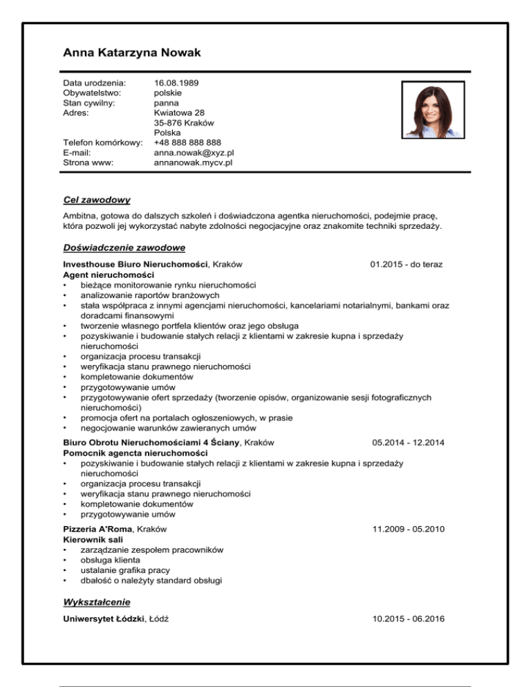 Anna Katarzyna Nowak Data urodzenia: Obywatelstwo: Stan cywilny: Adres: Telefon komórkowy: E-mail: Strona www: 16.08.1989 polskie panna Kwiatowa 28 35-876 Kraków Polska +48 888 888 888 [email protected] annanowak.mycv.pl Cel zawodowy Ambitna, gotowa do dalszych szkoleń i doświadczona agentka nieruchomości, podejmie pracę, która pozwoli jej wykorzystać nabyte zdolności negocjacyjne oraz znakomite techniki sprzedaży. Doświadczenie zawodowe Investhouse Biuro Nieruchomości, Kraków 01.2015 - do teraz Agent nieruchomości • bieżące monitorowanie rynku nieruchomości • analizowanie raportów branżowych • stała współpraca z innymi agencjami nieruchomości, kancelariami notarialnymi, bankami oraz doradcami finansowymi • tworzenie własnego portfela klientów oraz jego obsługa • pozyskiwanie i budowanie stałych relacji z klientami w zakresie kupna i sprzedaży nieruchomości • organizacja procesu transakcji • weryfikacja stanu prawnego nieruchomości • kompletowanie dokumentów • przygotowywanie umów • przygotowywanie ofert sprzedaży (tworzenie opisów, organizowanie sesji fotograficznych nieruchomości) • promocja ofert na portalach ogłoszeniowych, w prasie • negocjowanie warunków zawieranych umów Biuro Obrotu Nieruchomościami 4 Ściany, Kraków 05.2014 - 12.2014 Pomocnik agencta nieruchomości • pozyskiwanie i budowanie stałych relacji z klientami w zakresie kupna i sprzedaży nieruchomości • organizacja procesu transakcji • weryfikacja stanu prawnego nieruchomości • kompletowanie dokumentów • przygotowywanie umów Pizzeria A'Roma, Kraków Kierownik sali • zarządzanie zespołem pracowników • obsługa klienta • ustalanie grafika pracy • dbałość o należyty standard obsługi 11.2009 - 05.2010 Wykształcenie Uniwersytet Łódzki, Łódź 10.2015 - 06.2016 Dyplom studiów podyplomowych Wydział: Ekonomiczno-Socjologiczny Kierunek: Rynek Nieruchomości - Wycena Uniwersytet Jagielloński, Kraków Magister Wydział: Prawa i Administracji Kierunek: Administracja państwowa 10.2012 - 06.2014 Uniwersytet Jagielloński, Kraków Licencjat Wydział: Prawa i Administracji Kierunek: Administracja państwowa 10.2009 - 06.2012 Szkolenia Szkolenie dla specjalistów sprzedaży domów i mieszkań Freedom Nieruchomości Techniki sprzedaży i negocjacji w biznesie 02.2016 03.2015 Certyfikaty i uprawnienia Licencja Pośrednika w Obrocie Nieruchomościami wydana przez Federację Porozumienia Polskiego Rynku Nieruchomości 11.2015 Umiejętności SPOŁECZNE: zdolności komunikacyjne (4), łatwość w nawiązywaniu kontaktów (4), odporność na stres (4), znajomość technik sprzedaży i negocjacji (4) TECHNICZNE: Obsługa pakietu Office (4), Obsługa Internetu (3), Obsługa programu AutoCAD (1) (*) poziom umiejętności: 1 - początkujący, 2 - średniozaawansowany, 3 - zaawansowany, 4 - biegły Języki Angielski: zaawansowany Francuski: początkujący Informacje dodatkowe Jestem osobą gotową i chętną do dalszego szkolenia i poszerzania zakresu umiejętności. Planuję kolejne szkolenia, między innymi w zakresie projektowania wnętrz. Hobby architektura wnętrz, psychologia biznesu, wykorzystanie social media w promocji firm Wyrażam zgodę na przetwarzanie moich danych osobowych dla potrzeb procesu rekrutacji zgodnie z ustawą z dnia 29.08.1997r. Dz. U. z 2002 r., Nr 101, poz. 926 ze zm.