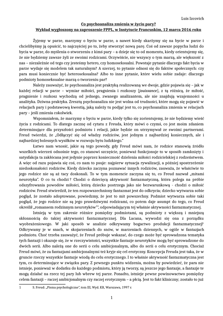 Luis Izcovich Co psychoanaliza zmienia w życiu pary? Wykład wygłoszony na zaproszenie FPPL, w Instytucie Francuskim, 12 marca 2016 roku Żyjemy w parze, marzymy o byciu w parze, a nawet kiedy skarżymy się na bycie w parze i chcielibyśmy ją opuścić, to najczęściej po to, żeby stworzyć nową parę. Coś od zawsze popycha ludzi do bycia w parze, do myślenia o stworzeniu z kimś pary – a dzieje się to od momentu, kiedy orientujemy się, że nie będziemy zawsze żyli ze swoimi rodzicami. Oczywiście, nie wszyscy o tym marzą, ale większość z nas – niezależnie od tego czy jesteśmy hetero, czy homoseksualni. Powstaje pytanie dlaczego fakt bycia w parze wydaje się modelem tak naturalnym? A szerzej, to pytanie odnosi się do faktów społecznych: czy para musi koniecznie być heteroseksualna? Albo to inne pytanie, które wielu sobie zadaje: dlaczego podmioty homoseksualne marzą o tworzeniu par? Należy zauważyć, że psychoanaliza jest praktyką realizowaną we dwoje, gdzie pojawia się – jak w każdej relacji w parze – wymiar miłości, pragnienia i rozkoszy [jouissance], z tą różnicą, że miłość, pragnienie i rozkosz wychodzą od jednego, zwanego analizantem, ale nie znajdują wzajemności u analityka. Dziwna praktyka. Zresztą psychoanaliza nie jest wolna od trudności, które mogą się pojawić w relacjach pary i podstawową kwestią, jaką należy tu podjąć jest to, co psychoanaliza zmienia w relacjach pary – jeśli zmienia cokolwiek. Wspomniałem, że marzymy o byciu w parze, kiedy tylko się zorientujemy, że nie będziemy wieść życia z rodzicami. To dlatego zacznę od cytatu z Freuda, który mówi o czymś, co jest moim zdaniem determinujące dla przyszłości podmiotu i relacji, jakie będzie on utrzymywał ze swoimi partnerami. Freud twierdzi, że „Odłączyć się od władzy rodziców, jest jednym z najbardziej koniecznych, ale i najbardziej bolesnych wysiłków w rozwoju bytu ludzkiego.” Łatwo nam wnosić, jakie są tego powody, gdy Freud mówi nam, że rodzice stanowią źródło wszelkich wierzeń odnośnie tego, co stanowi szczęście, ponieważ funkcjonuje to w sposób zamknięty i satysfakcja ta zakłócana jest jedynie poprzez konieczność dzielenia miłości rodzicielskiej z rodzeństwem. A więc od razu pojawia się coś, co nam to psuje: najpierw sytuacja rywalizacji, a później spostrzeżenie niedoskonałości rodziców. Kiedy dziecko zaczyna poznawać innych rodziców, zauważa, że właściwie to jego rodzice nie są aż tacy doskonali. To w tym momencie zaczyna się to, co Freud nazwał „mitami neurotyka”. O co tu chodzi ? Chodzi o dziecięcą aktywność fantazmatyczną, która polega na próbie odszyfrowania powodów miłości, którą dziecko postrzega jako nie bezwarunkową - chodzi o miłość rodziców. Freud stwierdził, że ten rozpowszechniony fantazmat jest do odkrycia; dziecko wytwarza sobie pogląd, że zostało adoptowane, powiedzmy, że jest to mit powszechny. Podmiot wytwarza sobie taki pogląd, że jego rodzice nie są jego prawdziwymi rodzicami, co potem daje asumpt do tego, co Freud określił „romansem rodzinnym neurotyków1”, odpowiadającym tej właśnie aktywności fantazmatycznej. Istnieją w tym zakresie różnice pomiędzy podmiotami, są podmioty z większą i mniejszą skłonnością do takiej aktywności fantazmatycznej. Dla Lacana, wywodzi się ona z porządku wyobrażeniowego. W jaki sposób w analizie odkrywamy bogactwo produkcji fantazmatycznej? Odkrywamy je w snach, w skojarzeniach do snów, w marzeniach dziennych, w ogóle w fantazjach podmiotu. Choć trzeba zauważyć, że Freud próbuje wskazać, do czego może być sprowadzona tematyka tych fantazji i okazuje się, że w rzeczywistości, wszystkie fantazje neurotyków mogą być sprowadzone do dwóch serii. Albo należą one do serii o celu ambicjonalnym, albo do serii o celu erotycznym. Chociaż Freud mówi, że za fantazjami ambicjonalnymi też kryje się cel erotyczny. Koncepcja Freuda jest taka, że w gruncie rzeczy wszystkie fantazje wiodą do celu erotycznego. I to właśnie aktywność fantazmatyczna jest tym, co determinujące w związku pary. Z pewnego punktu widzenia, można by powiedzieć, że para nie istnieje, ponieważ w dodatku do każdego podmiotu, który ją tworzy, są jeszcze jego fantazje, a fantazje te mogą działać na rzecz tej pary lub wbrew tej parze. Ponadto, istnieje pewne powinowactwo pomiędzy celem fantazji – raczej ambicjonalnym czy raczej erotycznym – a płcią. Jest to fakt kliniczny; zostało to już 1 S. Freud: „Pisma psychologiczne”, tom III, Wyd. KR, Warszawa, 1997 r. 1 powiedziane przez Freuda i potwierdza się to w gabinecie analitycznym. Łatwo z tego wydedukować, że fantazje o zawartości ambicjonalnej są bardziej rozpowszechnione u chłopców, a o treści erotycznej u dziewczynek. Gdy zaś napotkamy na fantazje ambicjonalne u dziewczynki, najczęściej napotykamy u niej także na identyfikację męską, [takie dziewczynki] zachowują się jak chłopcy. Możemy więc powiedzieć, że to na bazie identyfikacji męskiej tworzy się zawartość fantazji ambicjonalnych. Ale, jak mówi Freud, w tle takiej fantazji, skrywa się często fantazja o celu erotycznym. To bardzo trafne. Jeśli chodzi o mężczyzn, to są oni niesieni przez fantazje w typie obsesyjnym, choć nie można powiedzieć by istniała jakaś fantazja specyficzna dla obsesyjnego. Ale często to, co wychodzi na pierwszy plan, to idea wyjątkowej kariery, bo to jest właśnie fantazja ambicjonalna. Potem pojawia się inna myśl, ta z kolei wyłania się stopniowo, w ślad za tym, jak podmiot rozwija swoją fantazję, bo to wymaga czasu. Idea, jaką ma podmiot jest więc taka, że pewnego dnia będzie on sławny, a jak już zostanie sławny, spotka kobietę, o jakiej zawsze marzył. Ale to się w tym miejscu nie zatrzymuje, bowiem w końcowej fazie scenariusz w tle tej fantazji jest taki, że podmiot powie tej kob