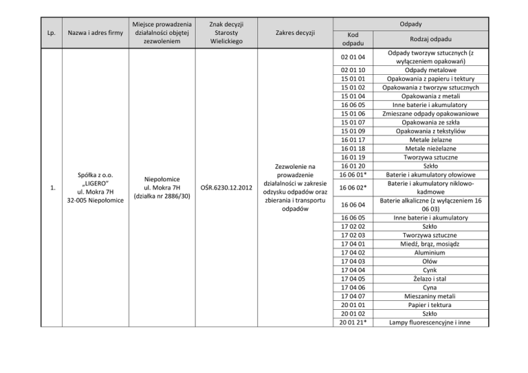 Lp. Nazwa i adres firmy Miejsce prowadzenia działalności objętej zezwoleniem Znak decyzji Starosty Wielickiego Odpady Zakres decyzji Kod odpadu 02 01 04 1. Spółka z o.o. „LIGERO” ul. Mokra 7H 32-005 Niepołomice Niepołomice ul. Mokra 7H (działka nr 2886/30) OŚR.6230.12.2012 Zezwolenie na prowadzenie działalności w zakresie odzysku odpadów oraz zbierania i transportu odpadów 02 01 10 15 01 01 15 01 02 15 01 04 16 06 05 15 01 06 15 01 07 15 01 09 16 01 17 16 01 18 16 01 19 16 01 20 16 06 01* 16 06 02* 16 06 04 16 06 05 17 02 02 17 02 03 17 04 01 17 04 02 17 04 03 17 04 04 17 04 05 17 04 06 17 04 07 20 01 01 20 01 02 20 01 21* Rodzaj odpadu Odpady tworzyw sztucznych (z wyłączeniem opakowań) Odpady metalowe Opakowania z papieru i tektury Opakowania z tworzyw sztucznych Opakowania z metali Inne baterie i akumulatory Zmieszane odpady opakowaniowe Opakowania ze szkła Opakowania z tekstyliów Metale żelazne Metale nieżelazne Tworzywa sztuczne Szkło Baterie i akumulatory ołowiowe Baterie i akumulatory niklowokadmowe Baterie alkaliczne (z wyłączeniem 16 06 03) Inne baterie i akumulatory Szkło Tworzywa sztuczne Miedź, brąz, mosiądz Aluminium Ołów Cynk Żelazo i stal Cyna Mieszaniny metali Papier i tektura Szkło Lampy fluorescencyjne i inne 20 01 23* 20 01 33* 20 01 34 20 01 35* 20 01 36 20 01 39 20 01 40 02 01 04 2. NYCZ INTERTRADE Sp. z o.o. ul. Płk. Dąbka 8c 30-732 Kraków Niepołomice ul. Grabska 15a (działka nr 1445/9) OŚR.6233.1.2011 Zezwolenie na zbieranie odpadów 02 01 10 15 01 01 15 01 02 15 01 04 16 06 05 15 01 06 15 01 07 15 01 09 16 01 17 16 01 18 odpady zawierające rtęć Urządzenia zawierające freony Baterie i akumulatory łącznie z bateriami i akumulatorami wymienionymi w 16 06 01, 16 06 02 lub 16 06 03 oraz niesortowane baterie i akumulatory zawierające te baterie Baterie i akumulatory inne niż wymienione w 20 01 33 Zużyte urządzenia elektryczne i elektroniczne inne niż wymienione w 20 01 21 i 20 01 23 zawierające niebezpieczne składniki Zużyte urządzenia elektryczne i elektroniczne inne niż wymienione w 20 01 21, 20 01 23 i 20 01 35 Tworzywa sztuczne Metale Odpady tworzyw sztucznych (z wyłączeniem opakowań) Odpady metalowe Opakowania z papieru i tektury Opakowania z tworzyw sztucznych Opakowania z metali Inne baterie i akumulatory Zmieszane odpady opakowaniowe Opakowania ze szkła Opakowania z tekstyliów Metale żelazne Metale nieżelazne 16 01 19 16 01 20 16 06 01* 16 06 02* 16 06 04 16 06 05 17 01 01 3. Polbruk S.A. ul. Nowy Świat 16 c 80-299 Gdańsk Niepołomice ul. Skarbowa 43 (dz. nr 1523/1, 1524, 1530/1, 1530/2, 1531/1) 17 02 02 17 02 03 17 04 01 17 04 02 17 04 03 17 04 04 17 04 05 17 04 06 17 04 07 15 01 01 15 01 02 16 06 01* OŚR.7644-1-1/10 Pozwolenie na wytwarzanie odpadów wraz z odzyskiem 16 06 02* 16 06 04 17 01 01 4. „Skup i Sprzedaż Złomu Metlai Kolorowych” Danuta Gucwa Niepołomice ul. Świerkowa 3 OŚR.7644-4-5/10 Zezwolenie na prowadzenie działalności w zakresie zbierania odpadów 17 04 05 15 01 04 17 04 01 17 04 02 17 04 03 Tworzywa sztuczne Szkło Baterie i akumulatory ołowiowe Baterie i akumulatory niklowokadmowe Baterie alkaliczne (z wyłączeniem 16 06 03) Inne baterie i akumulatory Odpady z betonu oraz gruz betonowy z rozbiórek i remontów Szkło Tworzywa sztuczne Miedź, brąz, mosiądz Aluminium Ołów Cynk Żelazo i stal Cyna Mieszaniny metali Opakowanie z papieru i tektury Opakowania z tworzyw sztucznych Baterie i akumulatory ołowiowe Baterie i akumulatory niklowokadmowe Baterie alkaliczne (z wyłączeniem 16 06 03) Odpady z betonu oraz gruz betonowy z rozbiórek i remontów Żelazo i stal Opakowania z metali Miedź, brąz, mosiądz Aluminium Ołów ul. Świerkowa 3 32-005 Niepołomice 5. Olimar Sp. z o.o. ul. Zawiła 65E 30-390 Kraków Niepołomice ul. Wodna 11 (dz. nr 2671, 2672/1) OŚR.7644-416/09/10 Zezwolenie na prowadzenie działalności w zakresie zbierania odpadów 6. Przedsiębiorstwo Usługowo – Handlowe METALEX Tomasz Zdebski Łąkta Dolna 60 32-733 Trzciana Staniątki (dz. nr 855/1, 855/2) OŚR.VI.7648-420/04/05 OŚR.7644-4-4/07 OŚR.7644-4-13/09 Zezwolenie na prowadzenie działalności w zakresie zbierania odpadów 17 04 04 17 04 05 17 04 06 17 04 07 17 04 11 15 01 02 16 01 19 17 02 03 20 01 39 15 01 01 15 01 02 15 01 04 15 01 06 15 01 07 15 01 09 16 01 17 16 01 18 16 01 19 16 01 20 16 06 01* 16 06 02* 16 06 04 16 06 05 17 01 01 17 01 02 17 01 03 17 02 02 17 02 03 17 04 01 17 04 02 Cynk Żelazo i stal Cyna Mieszaniny metali Kable inne niż wymienione w 17 04 10 Opakowania z tworzyw sztucznych Tworzywa sztuczne Tworzywa sztuczne Tworzywa sztuczne Opakowania z papieru i tektury Opakowania z tworzyw sztucznych Opakowania z metali Zmieszane odpady opakowaniowe Opakowania ze szkła Opakowania z tekstyliów Metale żelazne Metale nieżelazne Tworzywa sztuczne Szkło Baterie i akumulatory ołowiowe Baterie i akumulatory niklowokadmowe Baterie alkaliczne (z wyłączeniem 16 06 03) Inne baterie i akumulatory Odpady z betonu oraz gruz betonowy z rozbiórek i remontów Gruz ceglany Odpady z innych materiałów ceramicznych i elementów wyposażenia Szkło Tworzywa sztuczne Miedź, brąz, mosiądz Aluminium 17 04 03 17 04 04 17 04 05 17 04 06 17 04 07 17 04 11 20 01 33* 20 01 34 20 01 35* 20 01 36 7. L.P.G. „JAN-GAZ” s.c. W. Janik, J. Tadaj ul. Babińskiego 29/25/3 30-393 Kraków Staniątki OŚR.7644-4-3/08 Zezwolenie na prowadzenie działalności w zakresie zbierania odpadów 20 01 39 20 01 40 17 04 01 17 04 02 17 04 03 17 04 04 17 04 05 17 04 06 17 04 07 17 04 11 Ołów Cynk Żelazo i stal Cyna Mieszaniny metali Kable inne niż wymienione w 17 04 10 Baterie i akumulatory łącznie z bateriami i akumulatorami wymienionymi w 16 06 01, 16 06 02 lub 16 06 03 oraz niesortowane baterie i akumulatory zawierające te baterie Baterie i akumulatory inne niż wymienione w 20 01 33 Zużyte urządzenia elektryczne i elektroniczne inne niż wymienione w 20 01 21 i 20 01 23 zawierające niebezp