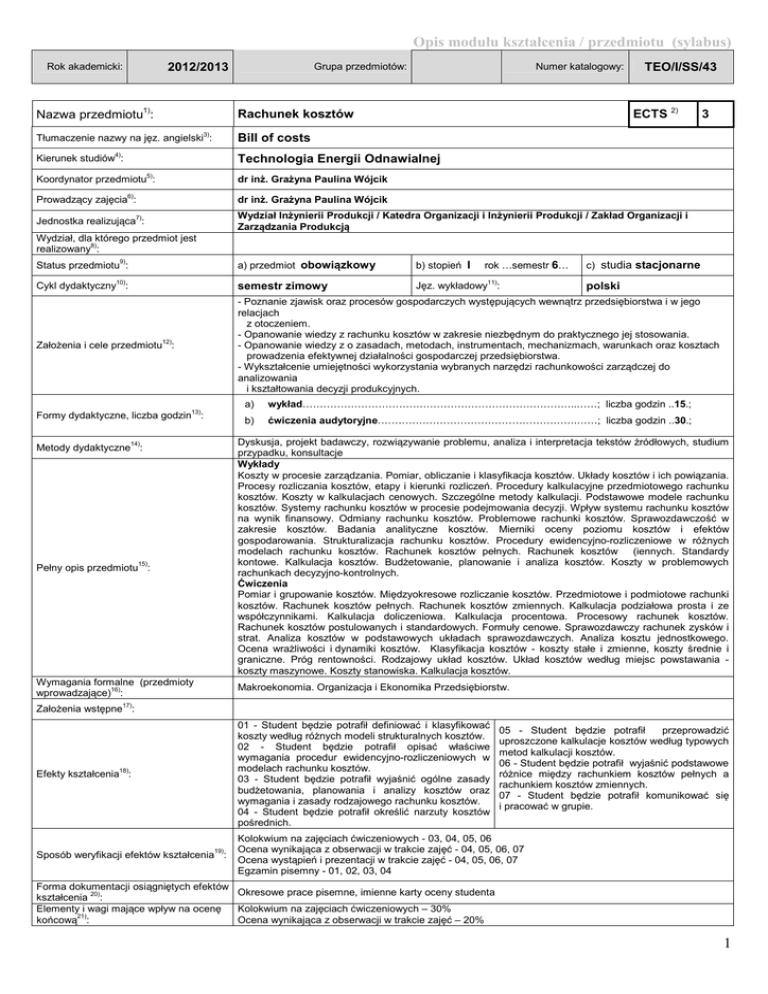 Opis modułu kształcenia / przedmiotu (sylabus) 2012/2013 Rok akademicki: Nazwa przedmiotu1): Grupa przedmiotów: Numer katalogowy: ECTS 2) Rachunek kosztów 3) Tłumaczenie nazwy na jęz. angielski : 4) TEO/I/SS/43 3 Bill of costs Technologia Energii Odnawialnej Kierunek studiów : 5) Koordynator przedmiotu : Prowadzący zajęcia6): 7) Jednostka realizująca : dr inż. Grażyna Paulina Wójcik dr inż. Grażyna Paulina Wójcik Wydział Inżynierii Produkcji / Katedra Organizacji i Inżynierii Produkcji / Zakład Organizacji i Zarządzania Produkcją Wydział, dla którego przedmiot jest realizowany8): Status przedmiotu9): a) przedmiot obowiązkowy b) stopień I Cykl dydaktyczny10): semestr zimowy Jęz. wykładowy11): Założenia i cele przedmiotu12): - Poznanie zjawisk oraz procesów gospodarczych występujących wewnątrz przedsiębiorstwa i w jego relacjach z otoczeniem. - Opanowanie wiedzy z rachunku kosztów w zakresie niezbędnym do praktycznego jej stosowania. - Opanowanie wiedzy z o zasadach, metodach, instrumentach, mechanizmach, warunkach oraz kosztach prowadzenia efektywnej działalności gospodarczej przedsiębiorstwa. - Wykształcenie umiejętności wykorzystania wybranych narzędzi rachunkowości zarządczej do analizowania i kształtowania decyzji produkcyjnych. Formy dydaktyczne, liczba godzin13): Metody dydaktyczne14): Pełny opis przedmiotu15): Wymagania formalne (przedmioty wprowadzające)16): rok …semestr 6… c) studia stacjonarne polski a) wykład……………………………………………………………………..……; liczba godzin ..15.; b) ćwiczenia audytoryjne………………………………………………….……; liczba godzin ..30.; Dyskusja, projekt badawczy, rozwiązywanie problemu, analiza i interpretacja tekstów źródłowych, studium przypadku, konsultacje Wykłady Koszty w procesie zarządzania. Pomiar, obliczanie i klasyfikacja kosztów. Układy kosztów i ich powiązania. Procesy rozliczania kosztów, etapy i kierunki rozliczeń. Procedury kalkulacyjne przedmiotowego rachunku kosztów. Koszty w kalkulacjach cenowych. Szczególne metody kalkulacji. Podstawowe modele rachunku kosztów. Systemy rachunku kosztów w procesie podejmowania decyzji. Wpływ systemu rachunku kosztów na wynik finansowy. Odmiany rachunku kosztów. Problemowe rachunki kosztów. Sprawozdawczość w zakresie kosztów. Badania analityczne kosztów. Mierniki oceny poziomu kosztów i efektów gospodarowania. Strukturalizacja rachunku kosztów. Procedury ewidencyjno-rozliczeniowe w różnych modelach rachunku kosztów. Rachunek kosztów pełnych. Rachunek kosztów (iennych. Standardy kontowe. Kalkulacja kosztów. Budżetowanie, planowanie i analiza kosztów. Koszty w problemowych rachunkach decyzyjno-kontrolnych. Ćwiczenia Pomiar i grupowanie kosztów. Międzyokresowe rozliczanie kosztów. Przedmiotowe i podmiotowe rachunki kosztów. Rachunek kosztów pełnych. Rachunek kosztów zmiennych. Kalkulacja podziałowa prosta i ze współczynnikami. Kalkulacja doliczeniowa. Kalkulacja procentowa. Procesowy rachunek kosztów. Rachunek kosztów postulowanych i standardowych. Formuły cenowe. Sprawozdawczy rachunek zysków i strat. Analiza kosztów w podstawowych układach sprawozdawczych. Analiza kosztu jednostkowego. Ocena wrażliwości i dynamiki kosztów. Klasyfikacja kosztów - koszty stałe i zmienne, koszty średnie i graniczne. Próg rentowności. Rodzajowy układ kosztów. Układ kosztów według miejsc powstawania koszty maszynowe. Koszty stanowiska. Kalkulacja kosztów. Makroekonomia. Organizacja i Ekonomika Przedsiębiorstw. 17) Założenia wstępne : Efekty kształcenia18): 01 - Student będzie potrafił definiować i klasyfikować koszty według różnych modeli strukturalnych kosztów. 02 - Student będzie potrafił opisać właściwe wymagania procedur ewidencyjno-rozliczeniowych w modelach rachunku kosztów. 03 - Student będzie potrafił wyjaśnić ogólne zasady budżetowania, planowania i analizy kosztów oraz wymagania i zasady rodzajowego rachunku kosztów. 04 - Student będzie potrafił określić narzuty kosztów pośrednich. Sposób weryfikacji efektów kształcenia19): Kolokwium na zajęciach ćwiczeniowych - 03, 04, 05, 06 Ocena wynikająca z obserwacji w trakcie zajęć - 04, 05, 06, 07 Ocena wystąpień i prezentacji w trakcie zajęć - 04, 05, 06, 07 Egzamin pisemny - 01, 02, 03, 04 05 - Student będzie potrafił przeprowadzić uproszczone kalkulacje kosztów według typowych metod kalkulacji kosztów. 06 - Student będzie potrafił wyjaśnić podstawowe różnice między rachunkiem kosztów pełnych a rachunkiem kosztów zmiennych. 07 - Student będzie potrafił komunikować się i pracować w grupie. Forma dokumentacji osiągniętych efektów Okresowe prace pisemne, imienne karty oceny studenta kształcenia 20): Elementy i wagi mające wpływ na ocenę Kolokwium na zajęciach ćwiczeniowych – 30% końcową21): Ocena wynikająca z obserwacji w trakcie zajęć – 20% 1 Obserwacja w trakcie dyskusji zdefiniowanego problemu (aktywność) – 20% Egzamin pisemny – 30% Miejsce realizacji zajęć22): sala wykładowa 23) Literatura podstawowa i uzupełniająca : 1. Nowak E., Rachunek kosztów przedsiębiorstwa, EKSPERT Wydawnictwo i Doradztwo, Wrocław 2005. 2. Drury Colin, Rachunek kosztów, Wydawnictwo Naukowe PWN, Warszawa 2003. 3. Giętkowska D. E., Rachunek kosztów, Wydawnictwo PK, Koszalin 2003. 4. Jarugowa A., Rachunek kosztów w zarządzaniu przedsiębiorstwem, PWE, Warszawa 2002. 5. Jarugow A., Malec W., Sawicki K., Rachunek kosztów, PWE, Warszawa 2003. 6. Rachunek kosztów i rachunkowość zarządcza. Najnowsze tendencje, procedury i ich zastosowanie w przedsiębiorstwie, praca zbiorowa pod red. I. Sobańskiej, Wydawnictwo C. H. BECK, Warszawa 2003. 7. Dobija M., Rachunkowość zarządcza i controlling, Wydawnictwo Naukowe PWN, Warszawa 2007. 8. Nowak E., Decyzyjne rachunki kosztów, Wydawnictwo Naukowe PWN, Warszawa 2004. UWA