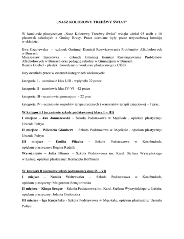 „NASZ KOLOROWY TRZEŹWY ŚWIAT” W konkursie plastycznym „Nasz Kolorowy Trzeźwy Świat” wzięło udział 93 osób z 10 placówek szkolnych z Gminy Brusy. Prace oceniane były przez trzyosobową komisję w składzie: Ewa Czapiewska – członek Gminnej Komisji Rozwiązywania Problemów Alkoholowych w Brusach Mieczysław Spierewka – członek Gminnej Komisji Rozwiązywania Problemów Alkoholowych w Brusach oraz pedagog szkolny w Gimnazjum w Brusach Renata Goebel - plastyk i koordynator konkursu plastycznego z CKiB Jury oceniało prace w czterech kategoriach wiekowych: kategoria I - uczniowie klas I-III - wpłynęło 22 prace kategoria II - uczniowie klas IV-VI - 42 prace kategoria III - uczniowie gimnazjum - 22 prac kategoria IV - uczniowie zespołów terapeutycznych i warsztatów terapii zajęciowej – 7 prac. W kategorii I (uczniowie szkoły podstawowej klasy I – III) I miejsce – Jan Januszewski – Szkoła Podstawowa w Męcikale , opiekun plastyczny: Urszula Pultyn II miejsce – Wiktoria Glaubert – Szkoła Podstawowa w Męcikale , opiekun plastyczny: Urszula Pultyn III – miejsce Emilia Pilacka - Szkoła Podstawowa w Kosobudach, opiekun plastyczny: Regina Rudnik Wyróżnienie – Julia Bluma – Szkoła Podstawowa im. Kard. Stefana Wyszyńskiego w Leśnie, opiekun plastyczny: Bernadeta Hoffmann W kategorii II (uczniowie szkoły podstawowej klasy IV – VI) I miejsce – Natalia Weltrowska – Szkoła Podstawowa w Kosobudach, opiekun plastyczny: Małgorzata Sznajdrowska II miejsce – Kinga Senger – Szkoła Podstawowa im. Kard. Stefana Wyszyńskiego w Leśnie, opiekun plastyczny: Jolanta Orzłowska III miejsce – Iga Kurzyńska - Szkoła Podstawowa w Męcikale, opiekun plastyczny: Urszula Pultyn III miejsce – Aleksandra Miloch – Szkoła Podstawowa w Kosobudach, opiekun plastyczny: Irena Piekarska Wyróżnienie – Wiktoria Zblewska - Szkoła Podstawowa im. Jana Pawła II w Brusach, opiekun plastyczny: Marcin Stoltmann Wyróżnienie – Adrianna Ziółtkowska - Szkoła Podstawowa im. Jana Pawła II w Brusach, opiekun plastyczny: Marcin Stoltmann W kategorii III (uczniowie gimnazjum) I miejsce – Daria Hamerska – Gimnazjum w Brusach, opiekun plastyczny: Patryk Nita II miejsce – Klaudia Rekowska – Gimanzjum w Brusach, opiekun plastyczny: Patryk Nita III miejsce – Patrycja Kuklińska – Gimnazjum w Brusach, opiekun plastyczny: Patryk Nita III miejsce – Patrycja Kurs – Gimnazjum w Brusach, opiekun plastyczny: Patryk Nita Wyróżnienie – Krzysztof Knut – Gimnazjum w Brusach, opiekun plastyczny: Patryk Nita Wyróżnienie – Joanna Januszewska – Gimnazjum w Brusach, opiekun plastyczny: Patryk Nita W kategorii IV (wychowankowie zespołów/świetlic terapeutycznych i warsztatów terapii zajęciowej) I miejsce – Piotr Szuca – Warsztat Terapii Zajęciowej w Brusach, opiekun plastyczny: Katarzyna Ryduchowska II miejsce – Michał Iwanczenko – Warsztat Terapii Zajęciowej w Brusach, opiekun plastyczny: Katarzyna Ryduchowska III miejsce – Dawid Molski – Warsztat Terapii Zajęciowej w Brusach, opiekun plastyczny: Justyna Wirkus III miejsce – Piotr Miszewski – Warsztat Terapii Zajęciowej w Brusach, opiekun plastyczny: Justyna Wirkus