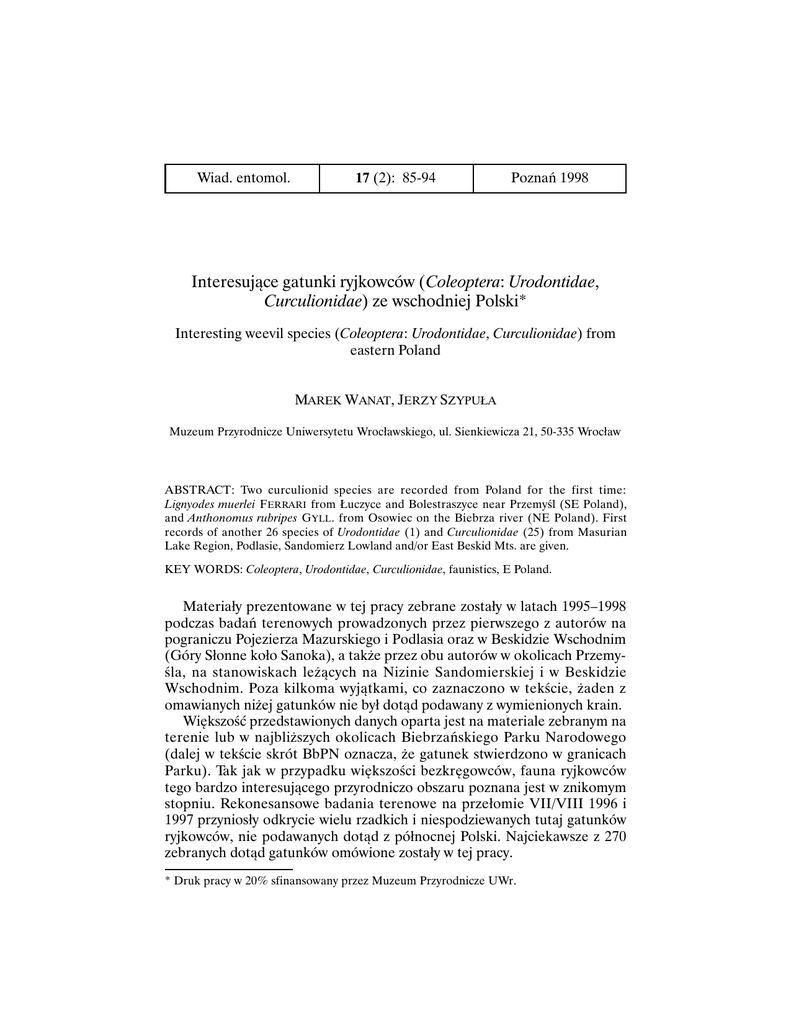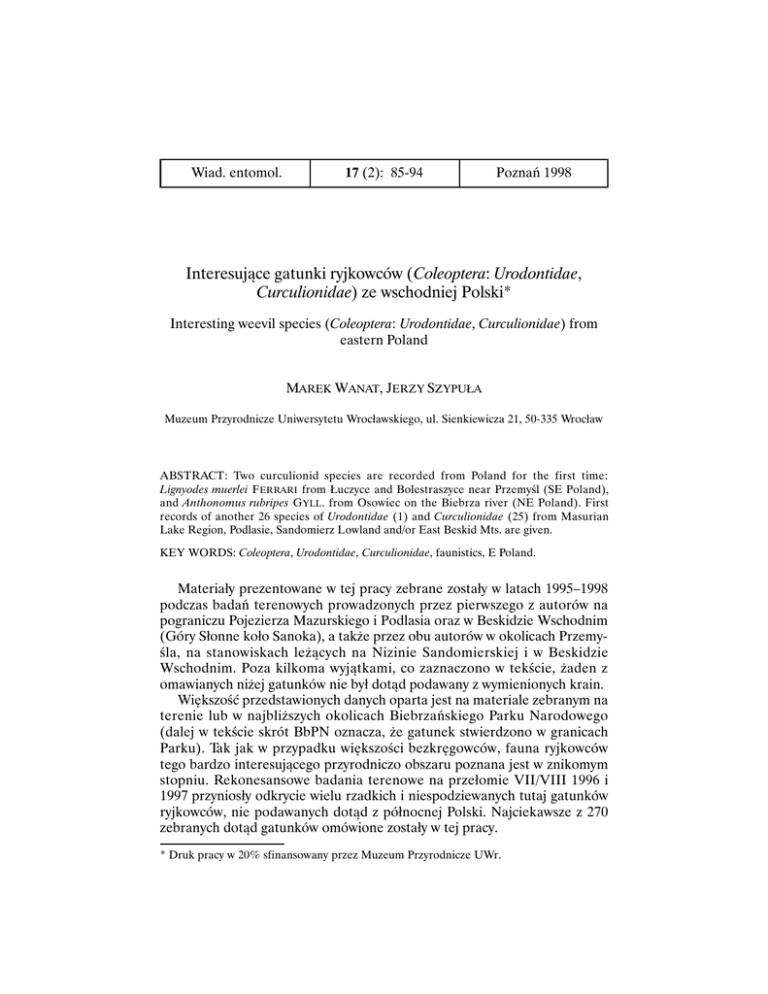 Wiad. entomol. 17 (2): 85-94 Poznań 1998 Interesujące gatunki ryjkowców (Coleoptera: Urodontidae, Curculionidae) ze wschodniej Polski* Interesting weevil species (Coleoptera: Urodontidae, Curculionidae) from eastern Poland MAREK WANAT, JERZY SZYPUŁA Muzeum Przyrodnicze Uniwersytetu Wrocławskiego, ul. Sienkiewicza 21, 50-335 Wrocław ABSTRACT: Two curculionid species are recorded from Poland for the first time: Lignyodes muerlei F ERRARI from Łuczyce and Bolestraszyce near Przemyśl (SE Poland), and Anthonomus rubripes GYLL . from Osowiec on the Biebrza river (NE Poland). First records of another 26 species of Urodontidae (1) and Curculionidae (25) from Masurian Lake Region, Podlasie, Sandomierz Lowland and/or East Beskid Mts. are given. KEY WORDS: Coleoptera, Urodontidae, Curculionidae, faunistics, E Poland. Materiały prezentowane w tej pracy zebrane zostały w latach 1995–1998 podczas badań terenowych prowadzonych przez pierwszego z autorów na pograniczu Pojezierza Mazurskiego i Podlasia oraz w Beskidzie Wschodnim (Góry Słonne koło Sanoka), a także przez obu autorów w okolicach Przemyśla, na stanowiskach leżących na Nizinie Sandomierskiej i w Beskidzie Wschodnim. Poza kilkoma wyjątkami, co zaznaczono w tekście, żaden z omawianych niżej gatunków nie był dotąd podawany z wymienionych krain. Większość przedstawionych danych oparta jest na materiale zebranym na terenie lub w najbliższych okolicach Biebrzańskiego Parku Narodowego (dalej w tekście skrót BbPN oznacza, że gatunek stwierdzono w granicach Parku). Tak jak w przypadku większości bezkręgowców, fauna ryjkowców tego bardzo interesującego przyrodniczo obszaru poznana jest w znikomym stopniu. Rekonesansowe badania terenowe na przełomie VII/VIII 1996 i 1997 przyniosły odkrycie wielu rzadkich i niespodziewanych tutaj gatunków ryjkowców, nie podawanych dotąd z północnej Polski. Najciekawsze z 270 zebranych dotąd gatunków omówione zostały w tej pracy. * Druk pracy w 20% sfinansowany przez Muzeum Przyrodnicze UWr. 86 M. WANAT, J. SZYPUŁA Dotychczasowe dane o rozmieszczeniu ryjkowców w Polsce podsumowane zostały w czterech tomach „Katalogu fauny Polski” (BURAKOWSKI i in., 1992, 1993, 1995, 1997), stąd przy omawianiu rozsiedlenia poszczególnych gatunków cytujemy jedynie najnowsze prace tam nie uwzględnione. Również za „Katalogiem fauny Polski” (BURAKOWSKI i in., 1973–1997) przyjęliśmy podział Polski na krainy geograficzne. W wykazie gatunków przy każdym stanowisku podano w nawiasach kod siatki UTM. Wszystkie okazy dokumentujące poniższe doniesienia znajdują się w zbiorach autorów. Dziękujemy Dyrekcji Biebrzańskiego Parku Narodowego za umożliwienie prowadzenia badań na terenie Parku oraz naszemu koledze Jackowi KALISIAKOWI za udostępnienie okazu jednego z gatunków omówionych w tej pracy. URODONTIDAE Bruchela rufipes (OLIVIER , 1790) – Pojezierze Mazurskie: Goniądz (FE12), 28 VII 1997, 36 exx. Podawany dotąd tylko z południowej Polski, jest jednak z pewnością szerzej rozmieszczony na terenie całego kraju, podobnie jak jego roślina żywicielska – Reseda lutea L. Wszystkie okazy z Goniądza odznaczają się zupełnie czarnymi czułkami i nogami, tak jak wszystkie badane przez nas okazy z południowej Polski należą więc do wyróżnionego przez STREJČEK'a (1991) podgatunku B. rufipes nigritarsis (REITTER). CURCULIONIDAE Polydrusus flavipes (DE GEER, 1775) – Pojezierze Mazurskie: Osowiec - Twierdza, zarośla wierzbowe przy drodze do Mężenina (FE12), 22 VII 1997, 1 ex. W Polsce podawany dotąd głównie z krain południowych, najdalej na północ wysunięte stanowiska to Słubice i Puszcza Białowieska. Sitona lateralis GYLLENHAL, 1834 (=ononidis SHARP, 1867) – Pojezierze Mazurskie: Osowiec-Twierdza, pobocze drogi do Mężenina (FE12), 28 VII 1996, 2 exx., 18 VII 1997, 2 exx., 31 VII 1997, 1 ex.; łąka nad Kanałem Rudzkim (FE02), 31 VII 1997, 1 ex. Rozmieszczenie tego gatunku w Polsce poznane jest słabo, głównie z powodu nieodróżniania go przez długi czas od S. suturalis STEPHENS. Wykazywano go dotychczas z zaledwie 7 krain (P ETRYSZAK i in., 1993; STACHOWIAK, 1993; WANAT, 1994), choć wydaje się, że jest szeroko rozprzestrzeniony w całym kraju. W Osowcu większość okazów zebrano na wilżynie bez- INTERESUJĄCE GATUNKI RYJKOWCÓW ZE WSCHODNIEJ POLSKI 87 bronnej Ononis arvensis L., a jeden otrząśnięto z groszku żółtego Lathyrus pratensis L. Synonimizacji S. ononidis (SHARP) i S. lateralis GYLL. dokonał KOROTYAEV (1994) po zbadaniu typów opisowych. Donus palumbarius (GERMAR, 1821) – Beskid Wschodni: Góry Słonne ad Sanok, przełęcz Słonna - Przysłup (EV98/EV99), 30 V 1997, 1 ex. złowiony do czerpaka z runa lasu bukowego. Rzadko spotykany górski ryjkowiec, wykazywany z izolowanego stanowiska pod Miechowem oraz około 10 stanowisk w Sudetach i Karpatach, w Beskidzie Wschodnim jedynie z Magóry Małastowskiej w Beskidzie Niskim. Cotaster uncipes (BOHEMAN, 1838) – Beskid Wschodni: Góry Słonne, rezerwat Góra Sobień (EV98), 29 V 1997, 1 ex., 25 V 1998, 3 exx., wysiane ze ściółki. Z Polski wykazywany dotąd jedynie z Wlenia w Górach Kaczawskich na podstawie doniesień z ubiegłego wieku. Gatunek środkowoeuropejski, sięgający dalej na południe na obszarze byłej Jugosławii i we Włoszech, znany ze słowackiej części Karpat. Występuje w terenach górskich i podgórskich. Nowy dla polskich Karpat. Bagous puncticollis BOHEMAN , 1845 – Pojezierze Mazurskie: Osowiec - Twierdza, BbPN, starorzecze Biebrzy (FE02), 27 VII 1996, 3 exx.; Goniądz, BPN, starorzecze Biebrzy (FE12), 3 VIII 1996, 1 ex. W północnej Polsce podany jedynie z okolic Słupska. Jest u nas jednym z najpospolitszych przedstawicieli rodzaju, a niewielka jeszcze liczba stanowisk wynika z trudności w łowieniu tych wodnych ryjkowców. Obok przesiewania detrytusu na brzegach zbiorników wodnych dobre efekty daje w miesiącach letnich wieczorne cze