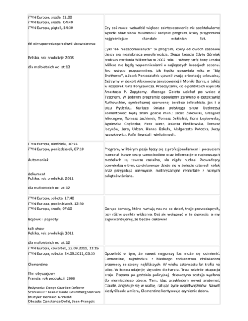iTVN Europa, środa, 21:00 iTVN Europa, środa, 04:40 iTVN Europa, piątek, 14:30 Czy coś może wzbudzić większe zainteresowanie niż spektakularne wpadki sław show businessu? Jedynie program, który przypomina najgłośniejsze skandale ostatnich lat. 66 niezapomnianych chwil showbiznesu Polska, rok produkcji: 2008 dla małoletnich od lat 12 iTVN Europa, niedziela, 10:55 iTVN Europa, poniedziałek, 07:10 Automaniak dokument Polska, rok produkcji: 2011 Cykl "66 niezapomnianych" to program, który od dwóch sezonów cieszy się niesłabnącą popularnością. Skąpa kreacja Edyty Górniak podczas rozdania Wiktorów w 2002 roku i różowy strój żony Leszka Millera nie będą wspomnieniami o najlepszych kreacjach sezonu. Bez wstydu przypomnimy, jak Frytka uprawiała seks w "Big Brotherze", a Jacek Poniedziałek ujawnił swoją orientację seksualną. Zajrzymy w dekolt Aleksandry Jakubowskiej i Moniki Borys, a także w rozporek Jana Borysewicza. Przeczytamy, co o politykach napisała Anastazja P. Zapytamy, dlaczego Gołota uciekał po walce z Tysonem. W jednym programie opowiemy zarówno o detektywie Rutkowskim, symbolicznej czerwonej torebce teletubisia, jak i o ojcu Rydzyku. Kurioza świata polskiego show businessu komentować będą znani goście m.in.: Jacek Żakowski, Grzegorz Miecugow, Tomasz Jachimek, Tomasz Sekielski, Ilona Łepkowska, Agnieszka Chylińska, Piotr Metz, Jolanta Pieńkowska, Tomasz Jacyków, Jerzy Urban, Hanna Bakuła, Małgorzata Potocka, Jerzy Iwaszkiewicz, Rafał Bryndal i wielu innych. Program, w którym pasja łączy się z profesjonalizmem i poczuciem humoru! Nasze testy samochodów oraz informacje o najnowszych modelach są zawsze rzetelne, ale nigdy nudne! Prowadzący opowiedzą o tym, co ciekawego dzieje się w świecie czterech kółek oraz przygotują niezwykłe, motoryzacyjne reportaże z różnych zakątków świata. dla małoletnich od lat 12 iTVN Europa, sobota, 17:40 iTVN Europa, poniedziałek, 12:50 iTVN Europa, środa, 07:10 Bojówki i papiloty Gorące tematy, które nurtują nas na co dzień, troje prowadzących, trzy różne punkty widzenia. Daj sie wciągnąć w te dyskusje, a my zagwarantujemy, że będzie ciekawie! talk show Polska, rok produkcji: 2011 dla małoletnich od lat 12 iTVN Europa, czwartek, 22.09.2011, 22:15 iTVN Europa, sobota, 24.09.2011, 03:35 Clementine film obyczajowy Francja, rok produkcji: 2008 Reżyseria: Denys Granier-Deferre Scenariusz: Jean-Claude Grumberg Vercors Muzyka: Bernard Grimaldi Obsada: Constance Dollé, Jean-François Opowieść o tym, że nawet najgorszy los może się odmienić. Clementine, najmłodsza z biednego rodzeństwa, doświadcza przemocy ze strony najbliższych. W wieku czternastu lat trafia na ulicę. W końcu udaje jej się uciec do Paryża. Trwa właśnie okupacja kraju. Złapana po godzinie policyjnej, dziewczyna zostaje wysłana do niemieckiego obozu. Tam, idąc przykładem nowej znajomej, Claude, angażuje się w walkę, ratując życie współwięźniów. Nawet kiedy Claude umiera, Clementine kontynuuje czynienie dobra. Balmer, Jocelyne Desverchere dla małoletnich od lat 12 iTVN Europa, niedziela, 17:40 iTVN Europa, niedziela, 00:15 iTVN Europa, czwartek, 04:40 Cruiser to pierwszy w polskiej telewizji program poświęcony amerykańskiej motoryzacji. Twórcy proponują widzom podróż na znane dotąd nielicznym motoryzacyjne lądy. Przeprowadzą ich po nich ze znawstwem i prawdziwą pasją! CRUISER program motoryzacyjny rok produkcji: 2011 dla małoletnich od lat 12 Do tej pory amerykańska motoryzacja nie była obecna w polskiej telewizji. Cruiser to pierwszy program w całości poświęcony maszynom zza oceanu. Autorzy skupią się na przybliżeniu historii unikatowych, legendarnych czy wręcz kultowych maszyn z USA takich jak muscle cary, hotrody, lowridery, customowe motocykle. W trakcie wiosennego sezonu zaprezentowanych zostanie ponad dwadzieścia wyjątkowych maszyn o amerykańskim rodowodzie. Każda z nich zainteresuje oryginalną formą, niesamowitymi osiągami oraz własną, niepowtarzalną historię. W programie pojawią się też krótkie fabuły prezentujące konkretne maszyny. Co ciekawe - w produkcji zastosowano rozwiązania żywcem zaczerpnięte z kina akcji – mistrzowskie efekty świetlne i ekscytujące zabiegi pirotechniczne. Zresztą to właśnie zdjęcia będą jedną z najmocniejszych stron Cruisera! Tego programu nie da się zapomnieć! iTVN Europa, piątek, 23.09.2011, 21:00 iTVN Europa, niedziela, 25.09.2011, 03:35 Cud w Krakowie film obyczajowy Polska/Węgry, rok produkcji: 2004 Reżyseria: Diana Groo Scenariusz: Diana Groo Muzyka: Daniel Kardos Obsada: Eszter Biro, Maciej Adamczyk, Franciszek Pieczka, Bartłomiej Świderski, Stanisława Celińska Ukochana babcia Piotra, Mancika, ma 86 lat, mieszka w Budapeszcie, w starej żydowskiej dzielnicy. To ona go wychowuje. Oprócz miłości do Piotra owładnięta jest również miłością do książek. Poszukuje zbiorów zaginionych podczas wojny z krakowskiej biblioteki. Zwłaszcza jednej książki, należącej niegdyś do rabina, który potrafił wskrzeszać zmarłych. Umiera, a Piotr trafia do Krakowa, gdzie opiekują się nim mieszkańcy Kazimierza. Chłopiec dorasta, żyje samotnie i kocha książki, tak jak babcia. Pewnego dnia spotyka dziewczynę z Budapesztu, która ma tę cudowną książkę, której Piotr szukał z babcią przez całe życie. Piotr kradnie książkę dziewczynie. Od tego momentu doświadcza cudów, spotyka nawet rabina, który pomaga mu nawiązać kontakt ze zmarłą babcią... dla małoletnich od lat 12 iTVN Europa, wtorek, 21:30 iTVN Europa, wtorek, 03:50 Grzech i wstyd serial dramat Włochy, rok produkcji: 2010 dla małoletnich od lat 16 Koniec lat trzydziestych ubiegłego wieku. Rzym kontrolowany jest przez faszystów. Zmysłowa Carmen Tabacchi poznaje Nito Valdi, kryminalistę, który zakochuje się w niej od pierwszego wejrzenia. Kobieta nie odwzajemnia jednak uczucia ze względu na przemo