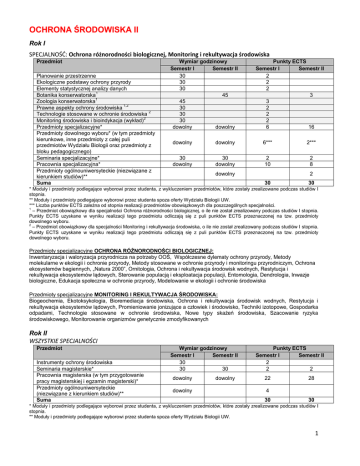 OCHRONA ŚRODOWISKA II Rok I SPECJALNOŚĆ: Ochrona różnorodności biologicznej, Monitoring i rekultywacja środowiska Przedmiot Planowanie przestrzenne Ekologiczne podstawy ochrony przyrody Elementy statystycznej analizy danych 1 Botanika konserwatorska 1 Zoologia konserwatorska 1,2 Prawne aspekty ochrony środowiska 2 Technologie stosowane w ochronie środowiska 2 Monitoring środowiska i bioindykacja (wykład) Przedmioty specjalizacyjne* Przedmioty dowolnego wyboru* (w tym przedmioty kierunkowe, inne przedmioty z całej puli przedmiotów Wydziału Biologii oraz przedmioty z bloku pedagogicznego) Seminaria specjalizacyjne* Pracownia specjalizacyjna* Przedmioty ogólnouniwersyteckie (niezwiązane z kierunkiem studiów)** Suma Wymiar godzinowy Semestr I Semestr II 30 30 30 45 45 30 30 30 dowolny dowolny Punkty ECTS Semestr I Semestr II 2 2 2 3 3 2 2 2 6 16 dowolny dowolny 6*** 2*** 30 dowolny 30 dowolny 2 10 2 8 dowolny 2 30 30 * Moduły i przedmioty podlegające wyborowi przez studenta, z wykluczeniem przedmiotów, które zostały zrealizowane podczas studiów I stopnia. ** Moduły i przedmioty podlegające wyborowi przez studenta spoza oferty Wydziału Biologii UW. *** Liczba punktów ECTS zależna od stopnia realizacji przedmiotów obowiązkowych dla poszczególnych specjalności. 1 – Przedmiot obowiązkowy dla specjalności Ochrona różnorodności biologicznej, o ile nie został zrealizowany podczas studiów I stopnia. Punkty ECTS uzyskane w wyniku realizacji tego przedmiotu odliczają się z puli punktów ECTS przeznaczonej na tzw. przedmioty dowolnego wyboru. 2 – Przedmiot obowiązkowy dla specjalności Monitoring i rekultywacja środowiska, o ile nie został zrealizowany podczas studiów I stopnia. Punkty ECTS uzyskane w wyniku realizacji tego przedmiotu odliczają się z puli punktów ECTS przeznaczonej na tzw. przedmioty dowolnego wyboru. Przedmioty specjalizacyjne OCHRONA RÓŻNORODNOŚCI BIOLOGICZNEJ: Inwentaryzacja i waloryzacja przyrodnicza na potrzeby OOŚ, Współczesne dylematy ochrony przyrody, Metody molekularne w ekologii i ochronie przyrody, Metody stosowane w ochronie przyrody i monitoringu przyrodniczym, Ochrona ekosystemów bagiennych, „Natura 2000”, Ornitologia, Ochrona i rekultywacja środowisk wodnych, Restytucja i rekultywacja ekosystemów lądowych, Sterowanie populacją i eksploatacja populacji, Entomologia, Dendrologia, Inwazje biologiczne, Edukacja społeczna w ochronie przyrody, Modelowanie w ekologii i ochronie środowiska Przedmioty specjalizacyjne MONITORING I REKULTYWACJA ŚRODOWISKA: Biogeochemia, Ekotoksykologia, Bioremediacja środowiska, Ochrona i rekultywacja środowisk wodnych, Restytucja i rekultywacja ekosystemów lądowych, Promieniowanie jonizujące a człowiek i środowisko, Techniki izotopowe, Gospodarka odpadami, Technologie stosowane w ochronie środowiska, Nowe typy skażeń środowiska, Szacowanie ryzyka środowiskowego, Monitorowanie organizmów genetycznie zmodyfikowanych Rok II WSZYSTKIE SPECJALNOŚCI Przedmiot Instrumenty ochrony środowiska Seminaria magisterskie* Pracownia magisterska (w tym przygotowanie pracy magisterskiej i egzamin magisterski)* Przedmioty ogólnouniwersyteckie (niezwiązane z kierunkiem studiów)** Suma Wymiar godzinowy Semestr I Semestr II 30 30 30 dowolny dowolny dowolny Punkty ECTS Semestr I Semestr II 2 2 2 22 28 4 30 30 * Moduły i przedmioty podlegające wyborowi przez studenta, z wykluczeniem przedmiotów, które zostały zrealizowane podczas studiów I stopnia. ** Moduły i przedmioty podlegające wyborowi przez studenta spoza oferty Wydziału Biologii UW. 1