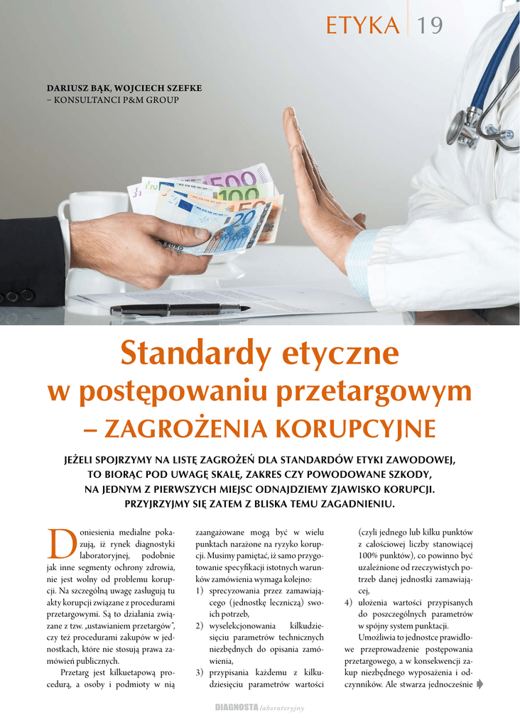 ETYKA 19 DARIUSZ BĄK, WOJCIECH SZEFKE – KONSULTANCI P&M GROUP Standardy etyczne w postępowaniu przetargowym – ZAGROŻENIA KORUPCYJNE JEŻELI SPOJRZYMY NA LISTĘ ZAGROŻEŃ DLA STANDARDÓW ETYKI ZAWODOWEJ, TO BIORĄC POD UWAGĘ SKALĘ, ZAKRES CZY POWODOWANE SZKODY, NA JEDNYM Z PIERWSZYCH MIEJSC ODNAJDZIEMY ZJAWISKO KORUPCJI. PRZYJRZYJMY SIĘ ZATEM Z BLISKA TEMU ZAGADNIENIU. D oniesienia medialne pokazują, iż rynek diagnostyki laboratoryjnej, podobnie jak inne segmenty ochrony zdrowia, nie jest wolny od problemu korupcji. Na szczególną uwagę zasługują tu akty korupcji związane z procedurami przetargowymi. Są to działania związane z tzw. „ustawianiem przetargów”, czy też procedurami zakupów w jednostkach, które nie stosują prawa zamówień publicznych. Przetarg jest kilkuetapową procedurą, a osoby i podmioty w nią zaangażowane mogą być w wielu punktach narażone na ryzyko korupcji. Musimy pamiętać, iż samo przygotowanie specyfikacji istotnych warunków zamówienia wymaga kolejno: 1) sprecyzowania przez zamawiającego (jednostkę leczniczą) swoich potrzeb, 2) wyselekcjonowania kilkudziesięciu parametrów technicznych niezbędnych do opisania zamówienia, 3) przypisania każdemu z kilkudziesięciu parametrów wartości (czyli jednego lub kilku punktów z całościowej liczby stanowiącej 100% punktów), co powinno być uzależnione od rzeczywistych potrzeb danej jednostki zamawiającej, 4) ułożenia wartości przypisanych do poszczególnych parametrów w spójny system punktacji. Umożliwia to jednostce prawidłowe przeprowadzenie postępowania przetargowego, a w konsekwencji zakup niezbędnego wyposażenia i odczynników. Ale stwarza jednocześnie 20 ETYKA możliwości, by poprzez określenie warunków zawartych w specyfikacji, np. szczegółów technicznych, promować określonego oferenta. Może to być działanie przypadkowe, o ile wynika z niestaranności w przygotowaniu dokumentacji (przypadkowe wykorzystywanie metody kopiuj-wklej w oparciu o dane techniczne dostępne np. w internecie). Może też mieć charakter celowy, i o ile jest związane z przyjęciem określonej korzyści – nosi znamiona korupcji. Korupcja z definicji Samo pojęcie stosowali już autorzy starożytni: Platon i Arystoteles, później także Machiavelli czy Monteskiusz. Odnosili je do kondycji moralnej społeczeństwa, z czasem również do działań jednostek. Słownik języka polskiego termin ,,korupcja” tłumaczy jako: „przyjmowanie lub żądanie przez pracownika instytucji państwowej lub społecznej korzyści majątkowej lub osobistej w zamian za wykonanie czynności urzędniczej lub za naruszenie prawa” (PWN, Warszawa 1978). Podobnie hasło to zdefiniowane jest Istotne jest, iż działanie tego typu nie musi być bezpośrednio skierowane do funkcjonariusza (funkcjonariuszem jest każdy członek komisji przetargowej). Za korupcję mogą być więc uznane m.in. wszelkiego rodzaju umowy „na rodzinę” czy „znajomych”, gdzie rzeczywistym celem jest zapłata za określone zachowanie funkcjonariusza publicznego. Należy także wspomnieć, iż nasz wymiar sprawiedliwości bardzo szeroko definiuje działania, które uznaje się za sprzeczne Pojęcie korupcji zostało najszerzej ujęte w ustawie o CBA. W myśl tych przepisów, jest nią czyn polegający na obiecywaniu, proponowaniu lub wręczaniu nienależnych korzyści osobie pełniącej funkcję publiczną. w innych dokumentach. Zgodnie z treścią Konwencji cywilnoprawnej o korupcji – korupcja oznacza żądanie, proponowanie, wręczanie lub przyjmowanie, bezpośrednio lub pośrednio, łapówki lub jakiejkolwiek innej nienależnej korzyści lub jej obietnicy, które wypacza prawidłowe wykonywanie jakiegokolwiek obowiązku lub zachowanie wymagane od osoby otrzymującej łapówkę, nienależną korzyść lub jej obietnicę. Także nasz system prawny definiuje pojęcie korupcji w art. 228 i 229 Kodeksu Karnego oraz w innych aktach prawnych. z prawem. Generalnie rzecz ujmując, aby coś zostało uznane za korupcję, musi dojść do przekazania lub obietnicy przekazania korzyści osobistej lub majątkowej. Korzyść majątkowa To korzyść każdego rodzaju, której wartość da się wyrazić w pieniądzu lub innym płatniczy środku, również wszelkie zwiększenie aktywów lub zmniejszenie pasywów, np. wynagrodzenie w sposób znaczący odbiegające od wartości świadczeń (np. umowy na przygotowanie określonego dokumentu - opinii, ekspertyz, wykładów). Korzyść osobista To świadczenia nieprzeliczalne na pieniądze. Posiadają inne niż materialne pozytywne znaczenie (np. miejsce na studiach dla syna, awans, ograniczanie obowiązków, nieodpłatne bankiety lub podróże, dodatkowy urlop). Procedura dialogu technicznego W systemie prawnym wyróżniamy korupcję czynną i bierną, polegające na żądaniu lub też jedynie przyjmowaniu korzyści majątkowych. Istniejące ryzyko korupcyjne możemy częściowo minimalizować, pozyskując w sposób obiektywny informacje niezbędne do przeprowadzenia postępowania przetargowego. Nie wyeliminuje to zjawiska korupcji, ale z pewnością utrudni składanie naruszających standardy prawne i etyczne ofert, które związane są z zamieszczeniem w specyfikacji przetargowych określonych parametrów technicznych. Jednym z narzędzi, które pozwala w legalny sposób zbierać informacje o produktach, jest tzw. dialog techniczny, który od lutego b. r. istnieje w naszym systemie prawnym. Pojęcie dialogu technicznego nie zostało nigdzie jednoznacznie zdefiniowane. Terminem tym można jednak określić niesformalizowany proces pozwalający instytucji ETYKA 21 zamawiającej na konsultowanie i weryfikację dokumentów służących opisowi przedmiotu zamówienia. Co najważniejsze, aktywność ta jest prowadzona przed rozpoczęciem procedury przetargowej. Wykorzystanie tego narzędzia może się przyczynić z jednej strony do skorygowania nieścisłości w formułowaniu opisu przed