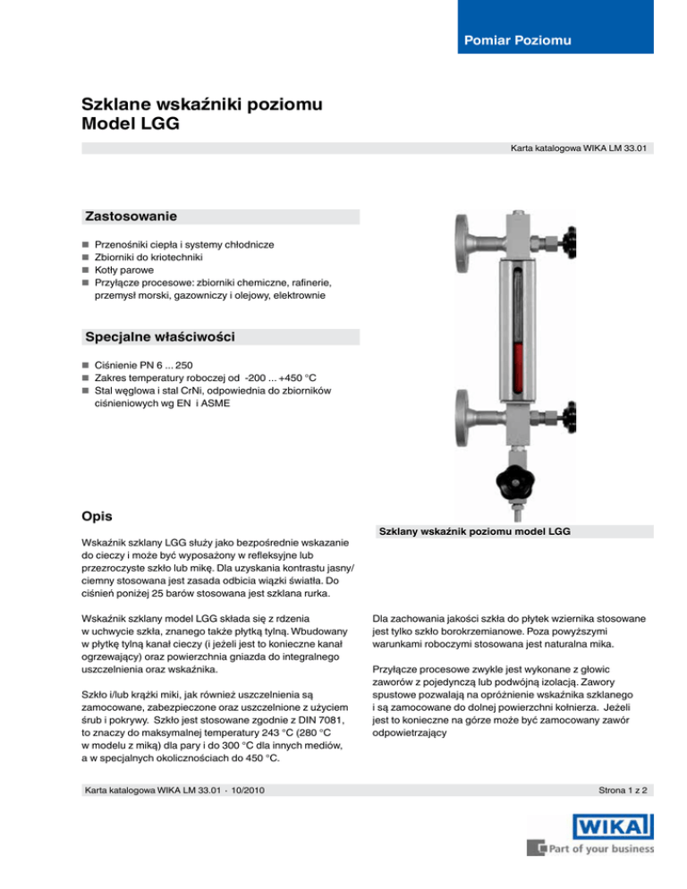 Pomiar Poziomu Szklane wskaźniki poziomu Model LGG Karta katalogowa WIKA LM 33.01 Zastosowanie ■■ Przenośniki ciepła i systemy chłodnicze ■■ Zbiorniki do kriotechniki ■■ Kotły parowe ■■ Przyłącze procesowe: zbiorniki chemiczne, rafinerie, przemysł morski, gazowniczy i olejowy, elektrownie Specjalne właściwości ■■ Ciśnienie PN 6 ... 250 ■■ Zakres temperatury roboczej od -200 ... +450 °C ■■ Stal węglowa i stal CrNi, odpowiednia do zbiorników ciśnieniowych wg EN i ASME Opis Wskaźnik szklany LGG służy jako bezpośrednie wskazanie do cieczy i może być wyposażony w refleksyjne lub przezroczyste szkło lub mikę. Dla uzyskania kontrastu jasny/ ciemny stosowana jest zasada odbicia wiązki światła. Do ciśnień poniżej 25 barów stosowana jest szklana rurka. Wskaźnik szklany model LGG składa się z rdzenia w uchwycie szkła, znanego także płytką tylną. Wbudowany w płytkę tylną kanał cieczy (i jeżeli jest to konieczne kanał ogrzewający) oraz powierzchnia gniazda do integralnego uszczelnienia oraz wskaźnika. Szkło i/lub krążki miki, jak również uszczelnienia są zamocowane, zabezpieczone oraz uszczelnione z użyciem śrub i pokrywy. Szkło jest stosowane zgodnie z DIN 7081, to znaczy do maksymalnej temperatury 243 °C (280 °C w modelu z miką) dla pary i do 300 °C dla innych mediów, a w specjalnych okolicznościach do 450 °C. Karta katalogowa WIKA LM 33.01 ∙ 10/2010 Szklany wskaźnik poziomu model LGG Dla zachowania jakości szkła do płytek wziernika stosowane jest tylko szkło borokrzemianowe. Poza powyższymi warunkami roboczymi stosowana jest naturalna mika. Przyłącze procesowe zwykle jest wykonane z głowic zaworów z pojedynczą lub podwójną izolacją. Zawory spustowe pozwalają na opróżnienie wskaźnika szklanego i są zamocowane do dolnej powierzchni kołnierza. Jeżeli jest to konieczne na górze może być zamocowany zawór odpowietrzający Strona 1 z 2 Dane ogólne Opcje Długość wskaźnika SL ≤ min. odległość od środków ME Działanie Przejście zaworu koło ręczne lub dzwignia zawór zintegrowany lub jako wyposażenie 8 mm Zawór spustowy kurek lub zawór Waga zależna od wykonania Rozmiar szyby 1) Przyłącze zaworu (tył) Przyłącze procesowe Zawór odpowietrzający 2 ... 11 (34 x 17 mm) kołnierz wg DIN lub ANSI 2) pojedynczy lub podwójny 1) Inne typy szkła na zapytanie 2) lub wg specyfikacji klienta Temperatura robocza Materiał ■■ Wzierniki ■■ Uchwyt szyby, pokrywa, płyta tylna ■■ Przyłącze kołnierzowe ■■ Części odpowietrzające ■■ Uszczelka Certyfikaty Akcesora do zaworu marka niski stan wody wg TRD zawór kulowy zwrotny Podświetlenie - pojedyncze lub podwójne odpowietrzenie - koło ręczne lub dzwignia żarówka lub rura fluorescencyjna (wymagane ciśnienie w zbiorniku min.1 bar) Ogrzewanie zewnętrzne lub zintegrowane Skala Ochrona przed zamrzaniem Szyba grawerowana wg specyfikacji klienta z plexiglas płyta z miki, folia FEP Pokrwa/powłoka halar, guma Ochrona szkła Obudowy Dane techniczne Ciśnienie robocze Wskazówka +6 ... +250 bar ochrona miką z zew. i wew. odporna na wodę morską, malowana lub galwanizowana -200 ... +450 °C borokrzemianowe (wg DIN 7081) lub z miki stal węglowa, stal CrNi, duplex, monel, inconel, hastelloy, tytan, itd. stal węglowa lub stal CrNi stal CrNi 2) grafit, guma, PTFE certyfikat sprawdzenia wg EN 10204, NACE i specyfika klienta 2) dla zbiornika ciśnieniowego wg EN lub ASME Układ (przykład) "A" "B" Szkło refleksyjne Szkło refleksyjne "C" Budowa (przykład) Uszczelka Pokrywa Podkładka Szyba Szkło refleksyjne Korpus Specyfikacje i wymiary podane w niniejszej karcie przedstawiają stan konstrukcyjny aktualny w momencie wydruku. Istnieje możliwość wprowadzenia modyfikacji i zmian specyfikacji materiałowej bez wcześniejszego powiadomienia Strona 2 z 2 Karta katalogowa WIKA LM 33.01 ∙ 10/2010 WIKA Polska spółka z ograniczoną odpowiedzialnością sp. k. Ul. Łęgska 29/35, 87-800 Włocławek Tel.: (+48) 54 23 01 100 Fax: (+48) 54 23 01 101 E-mail: [email protected] www.wikapolska.pl 10/2010 PL based on 01/2010 GB Widok