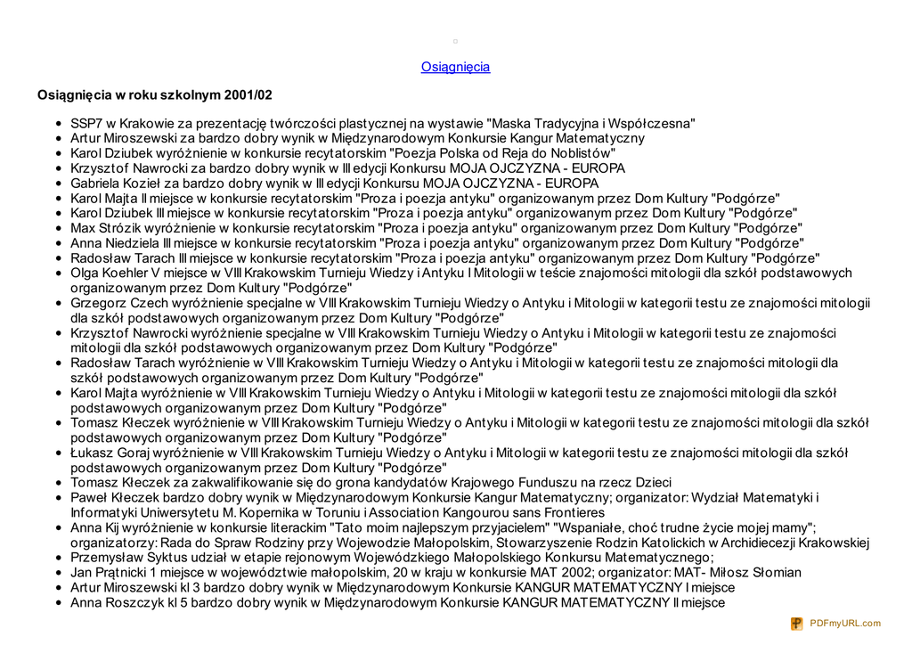 Osiągnięcia Osiągnięcia w roku szkolnym 2001/02 SSP7 w Krakowie za prezentację twórczości plastycznej na wystawie "Maska Tradycyjna i Współczesna" Artur Miroszewski za bardzo dobry wynik w Międzynarodowym Konkursie Kangur Matematyczny Karol Dziubek wyróżnienie w konkursie recytatorskim "Poezja Polska od Reja do Noblistów" Krzysztof Nawrocki za bardzo dobry wynik w III edycji Konkursu MOJA OJCZYZNA - EUROPA Gabriela Kozieł za bardzo dobry wynik w III edycji Konkursu MOJA OJCZYZNA - EUROPA Karol Majta II miejsce w konkursie recytatorskim "Proza i poezja antyku" organizowanym przez Dom Kultury "Podgórze" Karol Dziubek III miejsce w konkursie recytatorskim "Proza i poezja antyku" organizowanym przez Dom Kultury "Podgórze" Max Strózik wyróżnienie w konkursie recytatorskim "Proza i poezja antyku" organizowanym przez Dom Kultury "Podgórze" Anna Niedziela III miejsce w konkursie recytatorskim "Proza i poezja antyku" organizowanym przez Dom Kultury "Podgórze" Radosław Tarach III miejsce w konkursie recytatorskim "Proza i poezja antyku" organizowanym przez Dom Kultury "Podgórze" Olga Koehler V miejsce w VIII Krakowskim Turnieju Wiedzy i Antyku I Mitologii w teście znajomości mitologii dla szkół podstawowych organizowanym przez Dom Kultury "Podgórze" Grzegorz Czech wyróżnienie specjalne w VIII Krakowskim Turnieju Wiedzy o Antyku i Mitologii w kategorii testu ze znajomości mitologii dla szkół podstawowych organizowanym przez Dom Kultury "Podgórze" Krzysztof Nawrocki wyróżnienie specjalne w VIII Krakowskim Turnieju Wiedzy o Antyku i Mitologii w kategorii testu ze znajomości mitologii dla szkół podstawowych organizowanym przez Dom Kultury "Podgórze" Radosław Tarach wyróżnienie w VIII Krakowskim Turnieju Wiedzy o Antyku i Mitologii w kategorii testu ze znajomości mitologii dla szkół podstawowych organizowanym przez Dom Kultury "Podgórze" Karol Majta wyróżnienie w VIII Krakowskim Turnieju Wiedzy o Antyku i Mitologii w kategorii testu ze znajomości mitologii dla szkół podstawowych organizowanym przez Dom Kultury "Podgórze" Tomasz Kłeczek wyróżnienie w VIII Krakowskim Turnieju Wiedzy o Antyku i Mitologii w kategorii testu ze znajomości mitologii dla szkół podstawowych organizowanym przez Dom Kultury "Podgórze" Łukasz Goraj wyróżnienie w VIII Krakowskim Turnieju Wiedzy o Antyku i Mitologii w kategorii testu ze znajomości mitologii dla szkół podstawowych organizowanym przez Dom Kultury "Podgórze" Tomasz Kłeczek za zakwalifikowanie się do grona kandydatów Krajowego Funduszu na rzecz Dzieci Paweł Kłeczek bardzo dobry wynik w Międzynarodowym Konkursie Kangur Matematyczny; organizator: Wydział Matematyki i Informatyki Uniwersytetu M. Kopernika w Toruniu i Association Kangourou sans Frontieres Anna Kij wyróżnienie w konkursie literackim "Tato moim najlepszym przyjacielem" "Wspaniałe, choć trudne życie mojej mamy"; organizatorzy: Rada do Spraw Rodziny przy Wojewodzie Małopolskim, Stowarzyszenie Rodzin Katolickich w Archidiecezji Krakowskiej Przemysław Syktus udział w etapie rejonowym Wojewódzkiego Małopolskiego Konkursu Matematycznego; Jan Prątnicki 1 miejsce w województwie małopolskim, 20 w kraju w konkursie MAT 2002; organizator: MAT- Miłosz Słomian Artur Miroszewski kl 3 bardzo dobry wynik w Międzynarodowym Konkursie KANGUR MATEMATYCZNY I miejsce Anna Roszczyk kl 5 bardzo dobry wynik w Międzynarodowym Konkursie KANGUR MATEMATYCZNY II miejsce PDFmyURL.com Anna Polańska-Niedziela III miejsce w konkursie recytatorskim "Poezja Polska-od Reja do Noblistów" Karol Majta kl 6 I miejsce w konkursie recytatorskim "Poezja Polska-od Reja do Noblistów" Radosław Tarach 1gim II miejsce w konkursie recytatorskim "Poezja Polska-od Reja do Noblistów" Przemek Syktus uczestnik finału Małopolskiego Konkursu Matematycznego Karol Majta I miejsce w Konkursie Recytatorskim "Współczesna Poezja Austriacka" pod Honorowym Patronatem Konsula Generalnego Republiki Austrii Marcin Sołtysik II miejsce w Konkursie Recytatorskim "Współczesna Poezja Austriacka" pod Honorowym Patronatem Konsula Generalnego Republiki Austrii Anna Kij III miejsce w Konkursie Recytatorskim "Współczesna Poezja Austriacka" pod Honorowym Patronatem Konsula Generalnego Republiki Austrii Anna Polańska-Niedziela Wyróżnienia w Konkursie Recytatorskim "Współczesna Poezja Austriacka" pod Honorowym Patronatem Konsula Generalnego Republiki Austrii Grzegorz Czech Wyróżnienia w Konkursie Recytatorskim "Współczesna Poezja Austriacka" pod Honorowym Patronatem Konsula Generalnego Republiki Austrii Krzysztof Nawrocki Wyróżnienia w Konkursie Recytatorskim "Współczesna Poezja Austriacka" pod Honorowym Patronatem Konsula Generalnego Republiki Austrii Tomasz Kłeczek I miejsce w województwie małopolskim Ogólnopolskiego Konkursu Języka Niemieckiego - Deutschfreund 2001r w konkursie uczestniczyło w sumie 7 904 uczniów. Piotr Wosz II miejsce w województwie małopolskim ogólnopolskiego Konkursu Języka Niemieckiego - Deutschfreund 2001r Aleksandra Kij III miejsce w województwie małopolskim ogólnopolskiego Konkursu Języka Niemieckiego - Deutschfreund 2001r Paweł Tomczuk V miejsce w województwie małopolskim ogólnopolskiego Konkursu Języka Niemieckiego - Deutschfreund 2001r Małgorzata Adamczyk VII miejsce w województwie małopolskim ogólnopolskiego Konkursu Języka Niemieckiego - Deutschfreund 2001r Gabriela Gawlik VIII miejsce w województwie małopolskim ogólnopolskiego Konkursu Języka Niemieckiego - Deutschfreund 2001r Małgorzata Duda XI miejsce w województwie małopolskim ogólnopolskiego Konkursu Języka Niemieckiego - Deutschfreund 2001r Dawid Zawartka XVI miejsce w województwie małopolskim ogólnopolskiego Konkursu Języka Niemieckiego - Deutschfreund 2001r Agnieszka Głowacka XVIII miejsce w województwie małopolskim ogólnopolskiego Konkursu Języka Niemieckiego - Deutschfreund 2001r Anna Kij II miejsce w województwie małopolskim ogólnopols