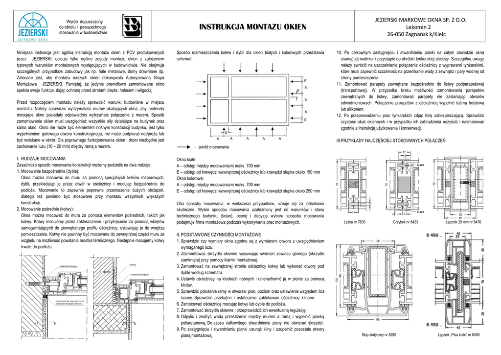 Wyrób dopuszczony do obrotu i powszechnego stosowania w budownictwie Niniejsza instrukcja jest ogólną instrukcją montażu okien z PCV produkowanych przez JEZIERSKI, opisuje tylko ogólne zasady montażu okien z założeniem typowych warunków montażowych występujących w budownictwie. Nie obejmuje szczególnych przypadków zabudowy jak np. hale metalowe, domy drewniane itp. Zalecane jest, aby montażu naszych okien dokonywała Autoryzowana Grupa Montażowa JEZIERSKI. Pamiętaj, że jedynie prawidłowo zamontowane okno spełnia swoje funkcje, dając ochronę przed stratami ciepła, hałasem i wilgocią. Przed rozpoczęciem montażu należy sprawdzić warunki budowlane w miejscu montażu. Należy sprawdzić wytrzymałość murów okalających okna, aby materiały mocujące okno posiadały odpowiednio wytrzymałe połączenie z murem. Sposób zamontowania okien musi uwzględniać wszystkie siły działające na budynek oraz samo okno. Okno nie może być elementem nośnym konstrukcji budynku, jest tylko wypełnieniem gotowego otworu konstrukcyjnego, nie może podpierać nadproża lub być wciskane w otwór. Dla poprawnego funkcjonowania okien i drzwi niezbędne jest zachowanie luzu (10 – 20 mm) między ramą a murem. I. RODZAJE MOCOWANIA Zasadniczo sposób mocowania konstrukcji możemy podzielić na dwa rodzaje: 1. Mocowanie bezpośrednie (dyble): Okna można mocować do muru za pomocą specjalnych kołków rozporowych, dybli, przekładając je przez otwór w ościeżnicy i mocując bezpośrednio do podłoża. Mocowanie to zapewnia poprawne przenoszenie dużych obciążeń, dlatego też powinno być stosowane przy montażu wszystkich większych konstrukcji. 2. Mocowanie pośrednie (kotwy): Okna można mocować do muru za pomocą elementów pośrednich, takich jak kotwy. Kotwy mocujemy przez zakleszczenie i przykręcenie za pomocą wkrętów samogwintujących do zewnętrznego profilu ościeżnicy, ustawiając je do wnętrza pomieszczenia. Kotwy nie powinny być mocowane do zewnętrznej części muru ze względu na możliwość powstania mostka termicznego. Następnie mocujemy kotwy trwale do podłoża. JEZIERSKI MARKOWE OKNA SP. Z O.O. Lekomin 2 26-050 Zagnańsk k/Kielc INSTRUKCJA MONTAZU OKIEN Sposób rozmieszczenia kotew i dybli dla okien białych i kolorowych przedstawia schemat: 10. Po całkowitym zastygnięciu i stwardnieniu pianki na całym obwodzie okna usunąć jej nadmiar i przystąpić do obróbki tynkarskiej ościeży. Szczególną uwagę należy zwrócić na uszczelnienie połączenia ościeżnicy z wyprawami tynkarskimi, które musi zapewnić szczelność na przenikanie wody z zewnątrz i pary wodnej od strony pomieszczenia. 11. Zamontować parapety zewnętrzne bezpośrednio do listwy podparapetowej (transportowej). W przypadku braku możliwości zamontowania parapetów zewnętrznych do listwy, zamontować parapety nie zasłaniając otworów odwodnieniowych. Połączenia parapetów z ościeżnicą wypełnić taśmą butylową lub silikonem. 12. Po przeprowadzeniu prac tynkarskich zdjąć folię zabezpieczającą. Sprawdzić czystość okuć okiennych i w przypadku ich zabrudzenia oczyścić i nasmarować zgodnie z instrukcją użytkowania i konserwacji. III.PRZYKŁADY NAJCZĘŚCIEJ STOSOWANYCH POŁĄCZEŃ - punkt mocowania Okna białe: A – odstęp między mocowaniami maks. 700 mm E – odstęp od krawędzi wewnętrznej ościeżnicy lub krawędzi słupka około 150 mm Okna kolorowe: A – odstęp między mocowaniami maks. 700 mm E – odstęp od krawędzi wewnętrznej ościeżnicy lub krawędzi słupka około 250 mm Oba sposoby mocowania, w większości przypadków, uznaje się za jednakowo skuteczne. Wybór sposobu mocowania uzależniony jest od warunków i stanu technicznego budynku (ścian), ocenę i decyzję wyboru sposobu mocowania podejmuje firma montażowa podczas wykonywania prac montażowych. II. PODSTAWOWE CZYNNOŚCI MONTAŻOWE 1. Sprawdzić czy wymiary okna zgodne są z wymiarami otworu z uwzględnieniem wymaganego luzu. 2. Zdemontować skrzydła okienne wysuwając sworzeń zawiasu górnego (skrzydło zamknięte) przy pomocy klamki montażowej. 3. Zamontować na zewnętrznej stronie ościeżnicy kotwy lub wykonać otwory pod dyble według schematu. 4. Ustawić ościeżnicę na klockach nośnych i unieruchomić ją w pionie za pomocą klinów. 5. Sprawdzić położenie ramy w otworze: pion, poziom oraz ustawienie względem lica ściany. Sprawdzić przekątne i ostatecznie zablokować ościeżnicę klinami. 6. Zamocować ościeżnicę mocując kotwy lub dyble do podłoża. 7. Zamontować skrzydła okienne i przeprowadzić ich ewentualną regulację. 8. Odpylić i zwilżyć wodą przestrzenie między murem a ramą i wypełnić pianką poliuretanową. Do czasu całkowitego stwardnienia piany nie otwierać skrzydeł. 9. Po zastygnięciu i stwardnieniu pianki usunąć kliny i uzupełnić pozostałe otwory pianą montażową. Łezka nr 7609 Grzybek nr 8423 Słup statyczny nr 8292 Łącznik 29 mm nr 8476 Łącznik „Psia kość” nr 8490