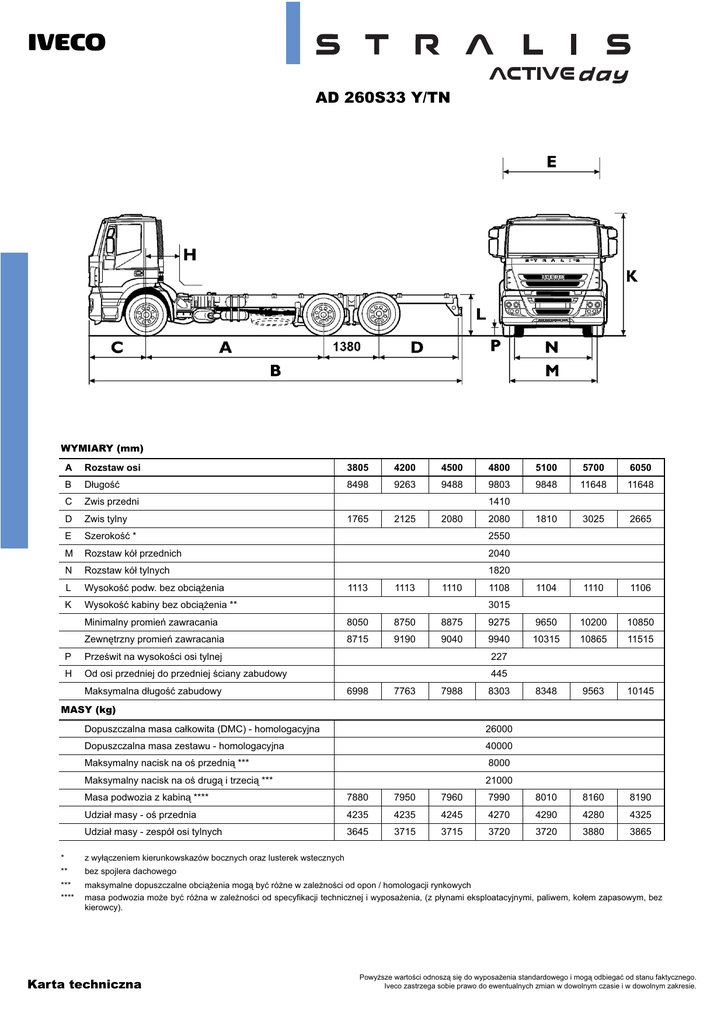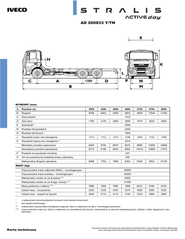IVECO AD 260S33 Y/TN WYMIARY (mm) A Rozstaw osi 3805 4200 4500 4800 5100 5700 6050 B DáugoĞü 8498 9263 9488 9803 9848 11648 11648 C Zwis przedni 1810 3025 2665 1104 1110 1106 1410 D Zwis tylny E SzerokoĞü * 2550 M Rozstaw kóá przednich 2040 N Rozstaw kóá tylnych L WysokoĞü podw. bez obciąĪenia K WysokoĞü kabiny bez obciąĪenia ** P H 1765 2125 2080 2080 1820 1113 1113 1110 1108 Minimalny promieĔ zawracania 8050 8750 8875 9275 9650 10200 10850 ZewnĊtrzny promieĔ zawracania 8715 9190 9040 9940 10315 10865 11515 8348 9563 10145 3015 PrzeĞwit na wysokoĞci osi tylnej 227 Od osi przedniej do przedniej Ğciany zabudowy Maksymalna dáugoĞü zabudowy 445 6998 7763 7988 8303 MASY (kg) Dopuszczalna masa caákowita (DMC) - homologacyjna 26000 Dopuszczalna masa zestawu - homologacyjna 40000 Maksymalny nacisk na oĞ przednią *** 8000 Maksymalny nacisk na oĞ drugą i trzecią *** * 21000 Masa podwozia z kabiną **** 7880 7950 7960 7990 8010 8160 8190 Udziaá masy - oĞ przednia 4235 4235 4245 4270 4290 4280 4325 Udziaá masy - zespóá osi tylnych 3645 3715 3715 3720 3720 3880 3865 z wyáączeniem kierunkowskazów bocznych oraz lusterek wstecznych ** bez spojlera dachowego *** **** maksymalne dopuszczalne obciąĪenia mogą byü róĪne w zaleĪnoĞci od opon / homologacji rynkowych masa podwozia moĪe byü róĪna w zaleĪnoĞci od specyfikacji technicznej i wyposaĪenia, (z páynami eksploatacyjnymi, paliwem, koáem zapasowym, bez kierowcy). Karta techniczna PowyĪsze wartoĞci odnoszą siĊ do wyposaĪenia standardowego i mogą odbiegaü od stanu faktycznego. Iveco zastrzega sobie prawo do ewentualnych zmian w dowolnym czasie i w dowolnym zakresie. AD 260S33 Y/TN SILNIK CURSOR 8 typ F2B E3681C*S (310 KM) ; F2B E3681B*S (330 KM) Diesel - 6 cylindrowy, rzĊdowy, 4 zawory na cylinder. Wtrysk paliwa - pompowtryskiwacze, sterowany elektronicznie z systemem EDC. TurbosprĊĪarka o zmiennej geometrii (VGT), intercooler. Termiczny ukáad rozruchowy. Cháodzony cieczą. Zgodny z normami EURO V (w opcji EEV ) – technologia SCR (selektywna redukcja katalityczna poprzez wtrysk mocznika w ukáadzie wydechowym poza silnikiem). 330 KM 7.790 cm PojemnoĞü caákowita ĝrednica i skok táoka 3 115 x 125 mm 330 KM (243 kW)/1660 - 2400 [kW] Moc maksymalna [obr/min] 1400 Nm/1080 - 1660 Maks. moment obrotowy [obr/min] Skrzynia biegów Typ Max przenoszony moment Manualna 9S 1310 TO 1300 Nm Manualna 16S 1620 TD 1600 Nm 12AS 1420 TD 1400 Nm Zautomatyzowana - Euro Tronic II 450 4500 400 4000 350 3500 300 3000 250 2500 200 2000 150 1500 100 1000 50 500 0 600 1000 1400 1800 [obr/min] 2200 2600 [Nm] CURSOR 8 - 330HP E5 Dane techniczne 0 SKRZYNIE BIEGÓW Manualna (9S 1320 TO) Synchronizowana z systemem pneumatycznego wspomagania zmiany biegów 9-cio biegowa +1 bieg wsteczny (16S 1620 TD ). Synchronizowana z systemem pneumatycznego wspomagania zmiany biegów, 16-to biegowa + 2 biegi wsteczne. Zautomatyzowana EuroTronic II (12AS 1420 TD ) Skrzynia z moĪliwoĞcią wyboru zmiany biegów w trybie sekwencyjnym lub w peáni zautomatyzowanym, 12-to biegowa + 2 biegi wsteczne. SPRZĉGàO Jednotarczowe o Ğrednicy 17”, odciągane sprĊĪyną talerzową. Sterowanie wyáączania za pomocą pedaáu ze wspomaganiem hydraulicznym. UKàAD KIEROWNICZY Wspomagany, hydrauliczny, kulkowy. Regulacja wysokoĞci i pochylenia koáa kierownicy. Blokada kierownicy. PODWOZIE PodáuĪnice stalowe o przekroju w ksztaácie litery „C” o wymiarach: 302 x 80 x 6,7mm, rozstaw 769mm Oĝ PRZEDNIA Sztywna, w ksztaácie „I”. OSIE TYLNE Sztywna, napĊdowa + oĞ wleczona Tylny most - noĞny z pojedynczą redukcją. Standardowe przeáoĪenie tylnego mostu: 4.11. (Skrzynia 9S 1310 TO 4,63) OPONY/KOàA Przednie pojedyncze, tylne bliĨniacze, koáo zapasowe z wciągarką. Rozmiar standardowy: 315/80R22,5, felgi – 22,5 x 9,00. Data przygotowania: wrzesieę 2007 Karta techniczna ZAWIESZENIE Przednie Paraboliczny resor piórowy, stabilizator, amortyzatory. Tylne Paraboliczny resor piórowy, stabilizator, amortyzatory. UKàAD HAMULCOWY Hamulec gáówny Pneumatyczny, dwuobwodowy. Ukáad ABS + EBL. Hamulce tarczowe wentylowane dla osi przedniej i tylnych z páywającymi zaciskami: - Ğrednica tarcz – 432 mm - powierzchnia hamująca – 784 cm2 SprĊĪarka 2-cylindrowa – 630 cm 3 Podgrzewany osuszacz powietrza w ukáadzie hamulcowym. Hamulec awaryjny Poáączony z hamulcem gáównym. Hamulec silnikowy Dekompresyjny o mocy: 300KM (220kW) przy 3000 obr/min. Hamulec postojowy Mechaniczny, dziaáający na koáa tylne, sterowany rĊcznie, uruchamiany pneumatycznie. KABINA Wykonana z ocynkowanych blach stalowych, dach z tworzywa sztucznego. Szyberdach. Tylna Ğciana kabiny bez okna. Zawieszenie kabiny na amortyzatorach i silentblokach. Podnoszona rĊcznie. IloĞü miejsc w kabinie: 2. Fotel kierowcy zawieszony pneumatycznie, z peáną regulacją, pokryty tkaniną, z pasami bezpieczeĔstwa i zagáówkami. Oprzyrządowanie podstawowe PrĊdkoĞciomierz, obrotomierz, wskaĨnik poziomu paliwa, poziomu AdBlue, wskaĨnik temperatury cieczy cháodzącej, centralny wyĞwietlacz ciekáokrystaliczny, lampki kontrolne, tachograf dla 2 kierowców. Tempomat. Transformator 24V – 12V. Elektrycznie podgrzewane i ustawiane lusterka wsteczne; lusterko rampowe i przednie, przyciemniane szyby, immobiliser. Dodatkowe Ğwiatáa przeciwmgielne i dalekosiĊĪne. UKàAD PALIWOWY Zbiornik paliwa 400 l (aluminiowy) Podgrzewany zbiornik AdBlue 55 l (plastikowy). Podgrzewany filtr paliwa + podgrzewany filtr wstĊpny. UKàAD ELEKTRYCZNY NapiĊcie: 24V Akumulatory: 2 szt. o pojemnoĞci 170Ah; Alternator: 28V – 90A Iveco Poland Sp. z o.o. Al. Wyścigowa 6 02-681 Warszawa tel. 022-5784300 www.iveco.pl PowyĪsze wartoĞci odnoszą siĊ do wyposaĪenia standardowego i mogą odbiegaü od stanu faktycznego. Iveco zastrzega sobie prawo do ewentualnych zmian w dowolnym czasie i w dowolnym zakresie.