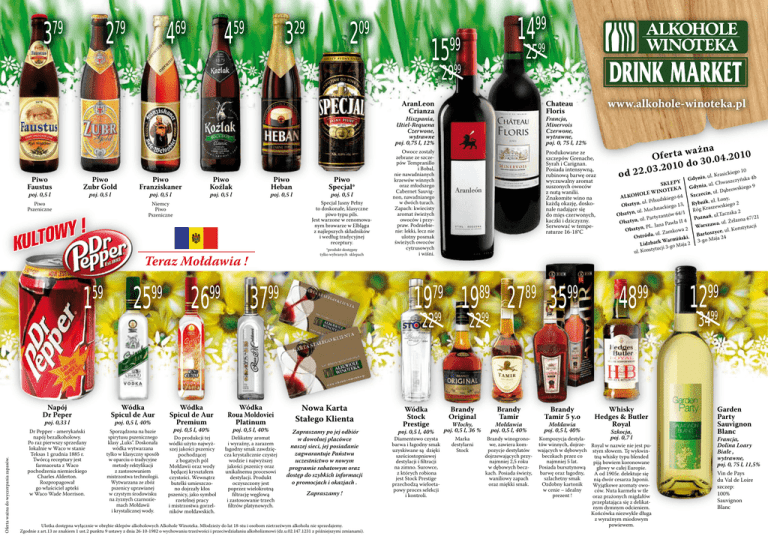 3 2 79 4 79 4 69 3 59 2 29 09 14 99 15 99 2599 2999 AranLeon Crianza Hiszpania, Utiel-Requena Czerwone, wytrawne poj. 0,75 l, 12% Piwo Faustus poj. 0,5 l Piwo Zubr Gold poj. 0,5 l Piwo Pszeniczne K poj. 0,5 l Piwo Heban poj. 0,5 l poj. 0,5 l 1 25 99 Napój Dr Peper Wódka Spicul de Aur Dr Pepper - amerykański napój bezalkoholowy. Po raz pierwszy sprzedany lokalnie w Waco w stanie Teksas 1 grudnia 1885 r. Twórcą receptury jest farmaceuta z Waco pochodzenia niemieckiego Charles Alderton. Rozpropagował go właściciel apteki w Waco Wade Morrison. Sporządzona na bazie spirytusu pszenicznego klasy „Luks”. Doskonała wódka wytwarzana tylko w klasyczny sposób w oparciu o tradycyjne metody rektyfikacji z zastosowaniem mistrzostwa technologii. Wytwarzana ze zbóż pszenicy uprawianej w czystym środowisku na żyznych czarnoziemach Mołdawii i krystalicznej wody. poj. 0,5 l, 40% 26 99 poj. 0,5 l Specjal Jasny Pełny to doskonałe, klasyczne piwo typu pils. Jest warzone w renomowanym browarze w Elblągu z najlepszych składników i według tradycyjnej receptury. Wódka Roua Moldoviei Platinum Do produkcji tej wódki użyto najwyższej jakości pszenicy pochodzącej z bogatych pól Mołdawii oraz wody będącej kryształem czystości. Wewnątrz butelki umieszczono dojrzały kłos pszenicy, jako symbol rzetelnej pracy i mistrzostwa gorzelników mołdawskich. Delikatny aromat i wyraźny, a zarazem łagodny smak zawdzięcza krystalicznie czystej wodzie i najwyższej jakości pszenicy oraz unikalnemu procesowi destylacji. Produkt oczyszczony jest poprzez wielokrotną filtrację węglową i zastosowanie trzech filtrów platynowych. poj. 0,5 l, 40% Francja, Minervois Czerwone, wytrawne, poj. 0, 75 l, 12% Owoce zostały zebrane ze szczepów Tempranillo i Bobal, nie nawadnianych krzewów winnych oraz młodszego Cabernet Sauvignon, nawadnianego w dwóch turach. Zapach: kwiecisty aromat świeżych owoców i przypraw. Podniebienie: lekki, lecz nie ulotny posmak świeżych owoców cytrusowych i wiśni. Produkowane ze szczepów Grenache, Syrah i Carignan. Posiada intensywną, rubinową barwę oraz wyczuwalny aromat suszonych owoców z nutą wanilii. Znakomite wino na każdą okazję, doskonale nadające się do mięs czerwonych, kaczki i dziczyzny. Serwować w temperaturze 16-18°C 19 19 27 35 37 99 Wódka Spicul de Aur Premium poj. 0,5 l, 40% Piwo Specjal* *produkt dostępny tylko wybranych sklepach Teraz Mołdawia ! 59 poj. 0,33 l Piwo Koźlak Niemcy Piwo Pszeniczne ! Y W ULTO Oferta ważna do wyczerpania zapasów. Piwo Franziskaner Nowa Karta Stałego Klienta Zapraszamy po jej odbiór w dowolnej placówce naszej sieci, jej posiadanie zagwarantuje Państwu uczestnictwo w nowym programie rabatowym oraz dostęp do szybkich informacji o promocjach i okazjach . Zapraszamy ! Ulotka dostępna wyłącznie w obrębie sklepów alkoholowych Alkohole Winoteka. Młodzieży do lat 18-stu i osobom nietrzeźwym alkoholu nie sprzedajemy. Zgodnie z art.13 ze znakiem 1 ust.2 punktu 9 ustawy z dnia 26-10-1982 o wychowaniu trzeźwości i przeciwdziałaniu alkoholizmowi (dz.u.02.147.1231 z późniejszymi zmianami). 79 89 2299 2299 Wódka Stock Prestige poj. 0,5 l, 40% Diamentowo czysta barwa i łagodny smak uzyskiwane są dzięki sześciostopniowej destylacji i filtracji na zimno. Surowce, z których robiona jest Stock Prestige przechodzą wieloetapowy proces selekcji i kontroli. www.alkohole-winoteka.pl Chateau Floris Brandy Original Włochy, poj. 0,5 l, 36 % Marka destylarni Stock 89 Brandy Tamir Mołdawia poj. 0,5 l, 40% 99 Brandy Tamir 5 y.o Mołdawia poj. 0,5 l, 40% od wa ż na a t 0 r e f O .04.201 0 3 o d 010 10 22.03.2 sickiego , ul. Kra Gdynia ńska 4b waszczy SKLEPY ia, ul. Ch n y d go 9 G rowskie TEKA , ul. Dąb E WINO in L c e O z c H z O 64 S ALK , dskiego ul. Łony , ul. Piłsu Rybnik, wskiego 2 , 3 1 Olsztyn o g sze hnackie Róg Kra , ul. Moc aczaka 2 w 64/1 Olsztyn tó n a ń z a y n , ul.T z rt a o P P 67/21 l. u , Żelazna II 4 Olsztyn zawa, ul. na Pawła s r Ja a . L W P tucji , y l. Konst Olsztyn wa 2 szyce, u l. Zamko to u r , a a B d ó Ostr ja 24 iński, 3-go Ma k Warm Lidzbar 3-go Maja 2 ytucji ul. Konst 48 99 Whisky Hedges & Butler Royal Szkocja, poj. 0,7 l Brandy winogronoKompozycja destylawe, zawiera komtów winnych, dojrze- Royal w nazwie nie jest pupozycje destylatów wających w dębowych stym słowem. Tę wykwindojrzewających przybeczkach przez co tną whisky typu blended najmniej 2,5 roku najmniej 5 lat. piją bowiem koronowane w dębowych beczPosiada bursztynową głowy w całej Europie. kach. Posiada świeży, barwę oraz łagodny, A od 1905r. delektuje się waniliowy zapach szlachetny smak nią dwór cesarza Japonii. oraz miękki smak. Ozdobny kartonik Wyjątkowe aromaty owow cenie – idealny ców. Nuta karmelu w tle prezent ! oraz prażonych migdałów przeplatająca się z delikatnym dymnym odcieniem. Końcówka niezwykle długa z wyraźnym miodowym powiewem. 12 99 3499 Garden Party Sauvignon Blanc Francja, Dolina Loary Białe , wytrawne, poj. 0, 75 l, 11,5% Vin de Pays du Val de Loire szczep: 100% Sauvignon Blanc z Warmii i Mazur naturalnie 19 79 53 99 18 21 28 31 31 99 99 50 21 50 Naira Chardonnay – Chenin Blanc Cytrynówka Lubelska poj. 0,5 l, 36% Naturalnie mętna, bo produkowana wyłącznie na bazie naturalnych składników. Cytrynowy smak i zapach trunku przywodzi na myśl dojrzewające w południowym słońcu owoce. Z powodzeniem można ją spożywać w kieliszkach na lodzie lub zmieszaną ze Spritem. Wódka Skorppio poj. 0,7 l, 37,5% Wódka Bols WEWNĄTRZ BUTELKI PRAWDZIWY SKORPION ! poj. 0,5 l, 40% 59 99 Śliwowica Podbeskidzka poj. 0,7 l, 50% Wyborny trunek produkowany z destylatu śliwkowego. Swój wyjątkowy aromat oraz bursztynową barwę zyskuje dzięki leżakowaniu w specjalnie wyselekcjonowanych beczkach. 63 99 46 99 Whisky Johnnie Walker Red Label Szkocja poj. 0,7 l Limitowana edycja + szklanki Whisky Johnnie Walker Red Label Szkocja poj. 0,7 l Wódka Piasecki p