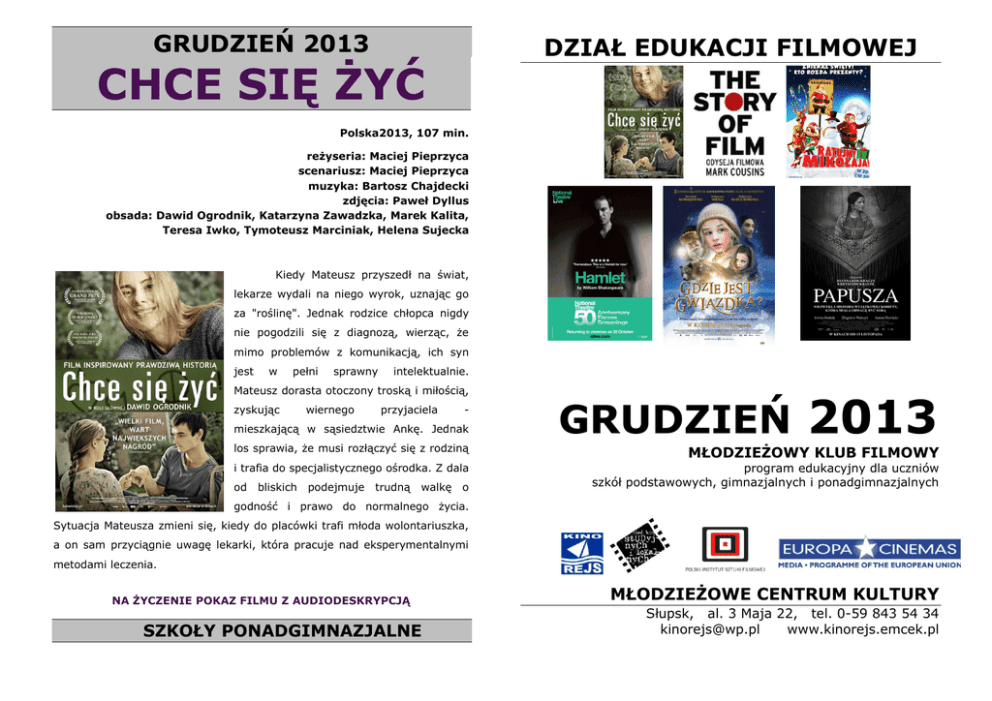 GRUDZIEŃ 2013 DZIAŁ EDUKACJI FILMOWEJ CHCE SIĘ ŻYĆ Polska2013, 107 min. reżyseria: Maciej Pieprzyca scenariusz: Maciej Pieprzyca muzyka: Bartosz Chajdecki zdjęcia: Paweł Dyllus obsada: Dawid Ogrodnik, Katarzyna Zawadzka, Marek Kalita, Teresa Iwko, Tymoteusz Marciniak, Helena Sujecka Kiedy Mateusz przyszedł na świat, lekarze wydali na niego wyrok, uznając go za "roślinę". Jednak rodzice chłopca nigdy nie pogodzili się z diagnozą, wierząc, że mimo problemów z komunikacją, ich syn jest w pełni sprawny intelektualnie. Mateusz dorasta otoczony troską i miłością, zyskując wiernego przyjaciela - mieszkającą w sąsiedztwie Ankę. Jednak los sprawia, że musi rozłączyć się z rodziną i trafia do specjalistycznego ośrodka. Z dala od bliskich podejmuje trudną walkę o GRUDZIEŃ 2013 MŁODZIEŻOWY KLUB FILMOWY program edukacyjny dla uczniów szkół podstawowych, gimnazjalnych i ponadgimnazjalnych godność i prawo do normalnego życia. Sytuacja Mateusza zmieni się, kiedy do placówki trafi młoda wolontariuszka, a on sam przyciągnie uwagę lekarki, która pracuje nad eksperymentalnymi metodami leczenia. NA ŻYCZENIE POKAZ FILMU Z AUDIODESKRYPCJĄ SZKOŁY PONADGIMNAZJALNE MŁODZIEŻOWE CENTRUM KULTURY Słupsk, al. 3 Maja 22, tel. 0-59 843 54 34 [email protected] www.kinorejs.emcek.pl 1 – 15 GRUDNIA 2013 GDZIE JEST GWIAZDKA? Reisen til julestjernen Norwegia 2012, 80 min. reżyseria: Nils Gaup scenariusz: Kamilla Krogsveen muzyka: Johan Halvorsen zdjęcia: Odd Reinhardt Nicolaysen obsada: Vilde Zeiner, Agnes Kittelsen, Anders Baasmo Christiansen, Jakob Oftebro, Evy Kasseth Røsten, Andreas Cappelen Dawno, dawno temu jedyna córka władcy niewielkiego królestwa, Złotowłosa, wybrała się do lasu w poszukiwaniu Gwiazdy Bożego Narodzenia i… słuch o niej zaginął. Królowa zmarła z żalu i tęsknoty za córką, a król przeklął Gwiazdę, sprawiając, że w jego królestwie nastały smutek i ciemność. Legenda jednak głosi, że Złotowłosa wciąż żyje i powróci do królestwa, gdy tylko król odnajdzie Gwiazdę i przywróci jej blask. Odtąd król szuka Gwiazdy w każde Boże Narodzenie, lecz na próżno. Tuż przed świętami ostatniej szansy do królestwa trafia 12-letnia Sonja, porwana przez bandę rozbójników. Dzielnej dziewczynce udaje się uciec od porywaczy, a przy okazji poznać smutną historię króla. Wzruszona jego losem i dobrocią, Sonja przysięga mu pomóc i wyrusza w długą, pełną przygód i niebezpieczeństw podróż w poszukiwaniu magicznej Gwiazdy... Film Nilsa Gaupa jest najnowszą adaptacją ulubionej skandynawskiej baśni, bez której norweskie dzieci nie wyobrażają sobie świąt. Powstał na podstawie klasycznej sztuki Sverre Brandta, często granej w norweskich teatrach przed Bożym Narodzeniem. Teraz i polskie maluchy wraz z rodzicami mają okazję poznać tę piękną historię. Ponadczasowe wartości, które przekazuje film, takie jak wiara w to, że Dobro zwycięża Zło, a trud zostaje wynagrodzony, wraz z zawartymi w nim fantazją i magią, czynią „Gdzie jest Gwiazdka?” doskonałą rozrywką dla całej rodziny. SZKOŁY PODSTAWOWE 13 – 20 GRUDNIA 2013 RATUJMY MIKOŁAJA! Saving Santa Wielka Brytania 2013, 84 min. reżyseria: Leon Joosen, Aaron Seelman scenariusz: Ricky Roxburgh muzyka - Grant Olding w polskiej wersji językowej: Krzysztof Kowalewski, Anna Dereszowska, Kamil Kula Bernard – elf mieszkający w Mikołajowie – marzy, żeby zostać nadwornym wynalazcą Świętego Mikołaja. Ma świetne pomysły, ale brakuje mu ogłady i aparycji. Kiedy po kolejnej nieudanej "prezent akcji" wydaje się, że już do końca życia będzie musiał sprzątać odchody reniferów, niespodziewanie zjednuje sobie sympatię samego Mikołaja. Wkrótce to od niego będzie zależała przyszłość nie tylko wszystkich elfów, ale i Świąt Bożego Narodzenia. Do strzeżonego specjalną barierą ochronną Mikołajewa wkracza bowiem sterowany przez okrutną matkę Emil Złoczyński. Fabuła filmu pełna jest ciekawych pomysłów. Niezwykłe zdolności bohaterów nie biorą się z nadprzyrodzonych mocy, ale z rozwoju technologicznego ich świata. Renifery latają i mówią dzięki specjalnym przyrządom, a Mikołaja umiejętność obdarowywania prezentami wszystkich dzieci w jedną noc, to zasługa wynalazku umożliwiającego podróże w czasie. Jest również morał przeznaczony dla najmłodszych widzów. Jako ciamajdowaty, niezbyt urodziwy i niecieszący się sympatią członków swojej społeczności łamaga, Bernard wpisuje się w typ bohatera-niedojdy. Dzięki czystemu sercu, odwadze i determinacji udaje mu się osiągnąć rzecz niemożliwą, czyli uratować wspólnotę, na której marginesie jeszcze niedawno się znajdował. To oczywiście mądry wzór dla dzieci – uczy je wiary w siebie i motywuje do realizowania marzeń. SZKOŁY PODSTAWOWE GRUDZIEŃ 2013 GRUDZIEŃ 2013 THE STORY OF FILM. ODYSEJA FILMOWA HAMLET Wielka Brytania 2011, 120 min. reżyseria: Marc Cousins "The Story of Film - Odyseja filmowa" to projekt zupełnie wyjątkowy - złożona z 15 części i obejmująca 12 dekad - historia kina dziejąca się na 6 kontynentach. Jego niezwykłość polega również na tym, że to bardzo subiektywna opowieść Marka Cousinsa, irlandzkiego reżysera, wybitnego krytyka filmowego i wielkiego pasjonata kina. Ta zakrojona na olbrzymią skalę produkcja jest adaptacją książki Cousinsa o tym samym tytule. Ekipa "The Story of Film" odwiedziła kluczowe dla rozwoju sztuki filmowej miejsca i przeprowadziła wywiady z jej wielkimi osobowościami, wśród których znaleźli się m.in. Stanley Donen, Gus van Sant, Lars von Trier, Roy Andersson, Claire Denis, Bernardo Bertolucci, Robert Towne, czy Jane Campion. Zapraszamy szkoły do uczestnictwa w wyjątkowym projekcie edukacyjnym „The Story Of Film. Odyseja filmowa”. Co miesiąc dostępne będą dwa kolejne odcinki tej znakomitej serii, prezentowane dla szkół na jednym s