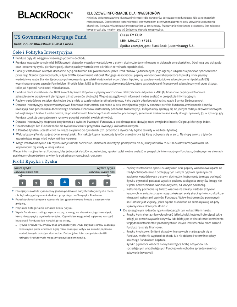 KLUCZOWE INFORMACJE DLA INWESTORÓW Niniejszy dokument zawiera kluczowe informacje dla inwestorów dotyczące tego funduszu. Nie są to materiały marketingowe. Dostarczenie tych informacji jest wymogiem prawnym mającym na celu ułatwienie zrozumienia charakteru i ryzyka związanego z inwestowaniem w ten fundusz. Przeczytanie niniejszego dokumentu jest zalecane inwestorowi, aby mógł on podjąć świadomą decyzję inwestycyjną. Class E2 EUR US Government Mortgage Fund ISIN: LU0277197322 Subfundusz BlackRock Global Funds Spółka zarządzająca: BlackRock (Luxembourg) S.A. Cele i Polityka Inwestycyjna Fundusz dąży do osiągania wysokiego poziomu dochodu. Fundusz inwestuje co najmniej 80% łącznych aktywów w papiery wartościowe o stałym dochodzie denominowane w dolarach amerykańskich. Obejmują one obligacje oraz instrumenty rynku pieniężnego (tj. dłużne papiery wartościowe o krótkich terminach zapadalności). Papiery wartościowe o stałym dochodzie będą emitowane lub gwarantowane przez Rząd Stanów Zjednoczonych, jego agencje lub przedsiębiorstwa sponsorowane przez rząd Stanów Zjednoczonych, w tym GNMA (Government National Mortgage Association), papiery wartościowe zabezpieczone hipoteką i inne papiery wartościowe rządu Stanów Zjednoczonych reprezentujące udział właścicielski w portfelach hipotek, np. papiery wartościowe zabezpieczone hipoteką (MBS) wyemitowane przez agencje Fannie Mae i Freddie Mac. MBS to finansowe papiery wartościowe, które są przepływami finansowymi zabezpieczonymi przez aktywa, takie jak hipoteki handlowe i mieszkaniowe. Fundusz może inwestować do 100% swoich łącznych aktywów w papiery wartościowe zabezpieczone aktywami i MBS (tj. finansowe papiery wartościowe zabezpieczone przepływami pieniężnymi z instrumentów dłużnych). Więcej szczegółowych informacji można znaleźć w prospekcie informacyjnym. Papiery wartościowe o stałym dochodzie będą miały w czasie nabycia rating kredytowy, który będzie odzwierciedlał rating rządu Stanów Zjednoczonych. Doradca inwestycyjny będzie wykorzystywał finansowe instrumenty pochodne w celu zmniejszenia ryzyka w obszarze portfela Funduszu, zmniejszenia kosztów inwestycji oraz generowania dodatkowego dochodu. Finansowe instrumenty pochodne to inwestycje, których ceny opierają się na jednym rodzaju aktywów bazowych lub większej ich liczbie. Fundusz może, za pośrednictwem finansowych instrumentów pochodnych, generować zróżnicowane kwoty dźwigni rynkowej (tj. w sytuacji, gdy Fundusz uzyskuje zaangażowanie rynkowe powyżej wartości swoich aktywów). Doradca inwestycyjny ma prawo decydowania o wyborze inwestycji Funduszu, a podejmując taką decyzję może uwzględnić indeks Citigroup Mortgage Index. Rekomendacja: Ten Fundusz może nie być odpowiedni w przypadku inwestycji krótkoterminowych. Z Państwa tytułami uczestnictwa nie wiąże sie prawo do dywidendy (tzn. przychód z dywidendy będzie zawarty w wartości tytułów). Walutą bazową Funduszu jest dolar amerykański. Transakcje kupna i sprzedaży tytułów uczestnictwa tej klasy odbywają się w euro. Na stopę zwrotu z tytułów uczestnictwa mogą mieć wpływ różnice kursowe. Mogą Państwo nabywać lub zbywać swoje udziały codziennie. Minimalna inwestycja początkowa dla tej klasy udziałów to 5000 dolarów amerykańskich lub odpowiednik tej kwoty w innej walucie. Więcej informacji na temat Funduszu, klas jednostek/tytułów uczestnictwa, ryzyka i opłat można znaleźć w prospekcie informacyjnym Funduszu, dostępnym na stronach poświęconych produktom w witrynie pod adresem www.blackrock.com Profil Ryzyka i Zysku Niższe ryzyko Zazwyczaj niższe zyski Wyższe ryzyko Zazwyczaj wyższe zyski Niniejszy wskaźnik wyznaczony jest na podstawie danych historycznych i może nie być wiarygodnym wskaźnikiem przyszłego profilu ryzyka Funduszu. Przedstawiona kategoria ryzyka nie jest gwarantowana i może z czasem ulec zmianie. Najniższa kategoria nie oznacza braku ryzyka. Wynik Funduszu z ratingu wynosi cztery, z uwagi na charakter jego inwestycji, które niosą ryzyka wymienione dalej. Czynniki te mogą mieć wpływ na wartość inwestycji Funduszu lub narazić go na straty. - Ryzyko kredytowe, zmiany stóp procentowych i/lub przypadki braku realizacji zobowiązań przez emitenta będą mieć znaczący wpływ na zwrot z papierów wartościowych o stałym dochodzie. Potencjalne lub rzeczywiste obniżki ratingów kredytowych mogą zwiększyć poziom ryzyka. Papiery wartościowe oparte na aktywach oraz papiery wartościowe oparte na kredytach hipotecznych podlegają tym samym ryzykom opisanym dla papierów wartościowych o stałym dochodzie. Instrumenty te mogą podlegać Ryzyku płynności, posiadać wysokie poziomy zaciągania kredytów i mogą nie w pełni odzwierciedlać wartości aktywów, od których pochodzą. - Instrumenty pochodne są bardzo wrażliwe na zmiany wartości aktywów bazowych, w związku z czym mogą zwiększać skalę strat i zysków, co skutkuje większymi wahaniami wartości Funduszu. Wpływ instrumentów pochodnych na Fundusz jest większy, jeżeli są one stosowane na szeroką skalę lub przy wykorzystaniu złożonych struktur. Do szczególnych rodzajów ryzyka nieobjętych tym wskaźnikiem należą: - Ryzyko kontrahenta: niewypłacalność jakiejkolwiek instytucji oferującej takie usługi jak przechowywanie aktywów lub działającej w charakterze kontrahenta względem instrumentów pochodnych lub innych instrumentów może narazić Fundusz na straty finansowe. - Ryzyko kredytowe: Emitent aktywów finansowych znajdujących się w Funduszu może nie wypłacić dochodu lub nie dokonać w terminie spłaty należnego Funduszowi kapitału. - Ryzyko płynności: oznacza niewystarczającą liczbę nabywców lub sprzedających umożliwiających Funduszowi swobodne sprzedawanie lub nabywanie inwestycji. - Opłaty Wnoszone opłaty służą pokryciu kosztów działania Funduszu, w