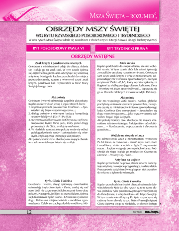 Y K Y Msza Święta – rozumieć, OBRZĘDY MSZY ŚWIĘTEJ WG RYTU RZYMSKIEGO POSOBOROWEGO I TRYDENCKIEGO M K W obu rytach Msza Święta składa się zasadniczo z dwóch części: Liturgii Słowa i Liturgii Eucharystycznej. Ryt POSOBOROWY PAWŁA VI Ryt tRYDENCKI PIUSA V OBRZĘDY WSTĘPNE Znak krzyża i pozdrowienie wiernych Celebrans z ministrantami udaje do ołtarza, skłania się i całuje go na znak czci. W tym czasie śpiewa się odpowiednią pieśń albo odczytuje się właściwą antyfonę. Następnie kapłan przechodzi do miejsca przewodniczenia, razem z wiernymi czyni znak krzyża, pozdrawia lud i wprowadza w treść Mszy Świętej danego dnia. M Akt pokuty K Celebrans i wierni odmawiają wspólnie akt pokuty. Kapłan może wybrać jedną z jego czterech form: 1. wspólna spowiedź powszechna Confiteor... – Spowiadam się Bogu wszechmogącemu…; 2. dialog pokutny z wiernymi będący kompilacją tekstów biblijnych Jl 2,17 i Ps 85,8; 3. trzy wezwania skierowane do Chrystusa, czyli tzw. tropowane Kyrie: Panie Jezu, który jesteś drogą prowadząca do Ojca, zmiłuj się nad nami. 4. W niedziele zamiast aktu pokuty może się odbyć pobłogosławienie wody i pokropienie nią wiernych, czyli aspersja (zastępuje akt pokuty). Akt pokuty kończy tzw. absolucja nie mająca charakteru sakramentalnego: Niech się zmiłuje... M K Znak krzyża Kapłan podchodzi do stopni ołtarza, ale nie wchodzi na nie. W tym czasie chór lub wierni śpiewają z mszalików antyfonę na wejście – Introit. Celebrans sam czyni znak krzyża i wraz z ministrantami, odpowiadającymi w imieniu zgromadzonych, zaczyna recytować Psalm 42,1-5, który wyraża tęsknotę za Bogiem i za służbą przy Jego ołtarzu: Judica me, Deus – Wymierz mi, Boże, sprawiedliwość… (opuszcza się go w Mszach żałobnych i w okresie Męki Pańskiej). Akt pokuty Nie ma wspólnego aktu pokuty. Kapłan, głęboko pochylony, odmawia spowiedź powszechną, następnie czynią to ministranci w imieniu zgromadzonego ludu: Confiteor Deo omnipotenti – Spowiadam się Bogu wszechmogącemu… jako wyraz wyznania win wobec Boga i Jego świętych. Akt pokuty kończy tzw. absolucja nie majaca charakteru sakramentalnego: Indulgentiam absolutionem… – Przebaczenia, odpuszczenia i darowania grzechów… Wejście na stopnie ołtarza Po odmówieniu wraz z ministrantami wersetów Ps 84: Deus, tu conversus – Zwróć się ku nam, Boże i modlitwy: Aufer a nobis – Zgładź nieprawości nasze… kapłan wstępuje po stopniach ołtarza. Podchodzi do niego i całuje go, modląc się: Oramus te, Domine – Prosimy Cię, Panie… Antyfona na wejście Kapłan przechodzi na prawą stronę ołtarza i odczytuje antyfonę na wejście przypadającą na dany dzień. Przez prawie całą Mszę Świętą kapłan stoi przodem do ołtarza a tyłem do wiernych. Kyrie, Gloria i kolekta M K Celebrans i wierni, stojąc śpiewają, ewentualnie odmawiają trzykrotnie Kyrie – Panie, zmiłuj się nad nami (jeśli nie użyto trzeciej lub czwartej formy aktu pokuty). Następnie, jeśli jest to przewidziane, śpiewa się lub odmawia hymn Gloria – Chwała na wysokości Bogu. Potem ma miejsce kolekta – modlitwa zgromadzenia. Celebrans zachęca lud do modlitwy: Mó- 12 Kyrie, Gloria i kolekta Kapłan przechodzi na środek ołtarza i odmawia dziewięciokrotnie Kyrie (w obu rytach są to te same słowa, jednak w rycie posoborowym są zwróceniem się do Pana Jezusa, a w trydenckim – do Trójcy Świętej). W tym czasie wierni klęczą. Po Kyrie rozpoczyna się radosny hymn chwały ku czci Trójcy Przenajświętszej Gloria (śpiewa się go w niedziele, w okresie Bożego 10/2009 K Y K Y K aby lepiej uczestniczyć dlmy się, wszyscy trwają przez chwilę w milczeniu, a następnie kapłan z rozłożonymi rękami odmawia modlitwę. Lud odpowiada: Amen. Narodzenia i Wielkanocy, w uroczystości Pańskie, Matki Bożej i Świętych; w innych Mszach się go opuszcza). Na jego słowa wierni wstają. Po odśpiewaniu/odmówieniu hymnu kapłan wraca do Mszału, aby odczytać kolektę. C Y LITURGIA SŁOWA Czytania Są dwa czytania w niedzielę i święta, jedno w dni powszednie. Odczytuje je lektor, którym może być zarówno kapłan, diakon, jak i osoba świecka. Lektor czyni to z ambony. Po pierwszym czytaniu śpiewany jest Psalm responsoryjny. Wierni i celebrans (jeśli nie czyta) w tym czasie siedzą. Wstają, kiedy rozpoczyna się śpiew Alleluja (lub inny w okresie Wielkiego Postu). Ewangelia Ewangelię odczytuje z ambony kapłan lub diakon. Wierni wraz z nim czynią znak krzyża na czole, ustach i piersiach. Homilia Kapłn lub diakon wygłasza ją z ambony lub od miejsca przewodniczenia. Wierni w tym czasie siedzą. Credo Czytania Kapłan lub subdiakon czyta lub śpiewa lekcję, stojąc po prawej stronie ołtarza. W rycie trydenckim odczytywana jest zawsze tylko jedna lekcja – czytanie z pism Starego Testamentu lub z Listów i Dziejów Apostolskich. Po niej następuje ozdobny śpiew – Graduał, Alleluja w okresie Wielkanocy lub Traktus, czyli Psalm, w okresie Wielkiego Postu. Ewangelia Ewangelię odczytuje celebrans lub diakon, stojąc po lewej stronie ołtarza. Wierni wraz z kapłanem czynią znak krzyża na czole, ustach i piersiach. Homilia Kapłan głosi ją z ambony lub od ołtarza. Wierni w tym czasie siedzą. Credo Jeżeli jest to przepisane, po homilii składa się wyznanie wiary: Wierzę w jednego Boga… Odmawiane lub śpiewane jest w postawie stojącej. Uroczyste wyznanie wiary odmawiane jest na stojąco, jako odpowiedź na pouczenia, które otrzymaliśmy w lekcji i Ewangelii. Modlitwa powszechna W rycie trydenckim nie ma modlitwy powszechnej. Zgromadzeni w postawie stojącej zanoszą do Boga wspólne prośby. Modlitwę rozpoczyna celebrans krótką zachętą do modlitwy i kończy podsumowującą oracją. Poszczególne prośby mogą wypowiadać wierni. LITURGIA EUCHARYSTYCZNA Przygotowanie darów Na ołtarz przynosi się kielich oraz patenę z chlebem i a