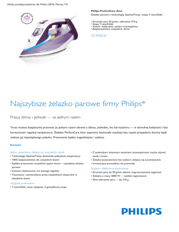 Ulotka przedsprzedażowa dla Polska (2016, Marzec 17) Philips PerfectCare Azur Żelazko parowe z technologią OptimalTemp i stopą T-ionicGlide • Strumień pary 50 g/min, uderzenie 210 g • Stopa T-ionicGlide • Autom. wyłączanie, system antywapienny • Bezpieczeństwo wszystkich ubrań GC4928/30 Najszybsze żelazko parowe firmy Philips* Prasuj dżinsy i jedwab — za jednym razem Teraz możesz bezpiecznie prasować za jednym razem ubrania z dżinsu, jedwabiu, lnu lub kaszmiru — w dowolnej kolejności i bez konieczności regulacji temperatury. Żelazko PerfectCare Azur zapewnia doskonałe rezultaty bez ryzyka przypalenia tkaniny bądź nadania jej niepożądanego połysku. Prasowanie będzie wygodniejsze i szybsze. Korzyści Jedno ustawienie, idealne do wszystkich ubrań • Technologia OptimalTemp: doskonałe połączenie temperatury • 100% bezpieczeństwa dla wszystkich tkanin • Szybkie prasowanie wszystkich typów tkanin – najszybsze żelazko parowe • Łatwość użytkowania, nie wymaga regulacji • Testowane i zatwierdzone przez niezależnych ekspertów w dziedzinie tkanin Wygoda prasowania • T-ionicGlide: nasza najlepsza, 5-gwiazdkowa stopa • Z podwójnym aktywnym systemem antywapiennym można używać wody z kranu • Żelazko pozostawione bez nadzoru wyłącza się automatycznie • Innowacyjna prowadnica do przewodu Szybkie i efektywne prasowanie • Strumień pary do 50 g/min ułatwia rozprasowywanie zagnieceń • Żelazko o mocy 3000 W — szybkie nagrzewanie • Silne uderzenie pary — do 210 g PerfectCare Azur Cechy Technologia OptimalTemp Stopa T-ionicGlide To prawdziwa rewolucja w dziedzinie prasowania, która zapewnia doskonałe połączenie pary i temperatury. Szybkie prasowanie, doskonałe rezultaty nawet w przypadku trudnych zagnieceń i bezpieczeństwo wszystkich tkanin — bez konieczności regulacji. Mechanizm działania jest następujący: 1) Inteligentny procesor ustawia odpowiednią temperaturę. 2) Technologia HeatFlow pozwala uzyskać odpowiednie proporcje pary i temperatury. T-ionicGlide to najlepsza stopa firmy Philips. Wraz z żelazkami OptimalTemp wyznacza nowy standard poślizgu i odporności na zarysowania. Nowa, opatentowana powłoka zapewnia doskonałe rezultaty. Starannie zaprojektowany kształt i otwory gwarantują równomierne rozprowadzanie pary ułatwiające rozprasowywanie zagnieceń. 100% bezpieczeństwa 100% bezpieczeństwa dla wszystkich delikatnych tkanin, takich jak jedwab, kaszmir, wełna czy poliester. Niezależne instytuty badawcze stosowały żelazko PerfectCare do prasowania najbardziej delikatnych tkanin przeznaczonych do prasowania — ich badania potwierdziły doskonałe efekty. 100% wydajności Szybkie prasowanie bez konieczności sortowania odzieży. Uprasujesz wszystkie swoje ubrania dzięki bardziej skutecznemu działaniu pary. Możliwość korzystania z wody z kranu Z żelazkiem parowym PerfectCare Azur można używać wody z kranu. Podwójny aktywny system antywapienny to połączenie tabletek rozpuszczających kamień i regularnego samoczyszczenia, dzięki któremu wewnątrz żelazka osadza się mniej kamienia. Aby uzyskać lepsze rezultaty, należy używać wody destylowanej, która zapewni stały przepływ pary w żelazku. Automatyczne wyłączanie Łatwość użytkowania Żelazko pozostawione bez nadzoru wyłącza się automatycznie: postawione na podstawie po trzech minutach, zaś na stopie — po dwóch. Łatwość uzytkowania, nie wymaga regulacji. Teraz możesz wyprasować wszystkie ubrania przeznaczone do prasowania, jedno po drugim — bez zbędnych przerw i regulacji temperatury. Prowadnica do przewodu CordGuide Testowane i zatwierdzone: Innowacyjna prowadnica do przewodu przypinana do deski do prasowania utrzymuje przewód z dala od żelazka podczas prasowania. Strumień pary do 50 g/min To żelazko zapewnia doskonałą jakość prasowania — potwierdziły to testy przeprowadzone przez niezależne instytuty z branży tekstylnej, takie jak DWI, IWTO i Woolmark. Program Woolmark Apparel Care ma zadanie pomóc klientom w zidentyfikowaniu wysokiej jakości produktów do pielęgnacji ubrań, które firma Woolmark zatwierdziła do stosowania na odzieży wełnianej. Do tej pory tylko firma Philips oferująca oryginalną technologię OptimalTemp otrzymała od firmy Woolmark certyfikat Gold. Można mieć pewność, że produkty do pielęgnacji odzieży zatwierdzone przez firmę Woolmark zapewnią wełnianym tkaninom idealną ochronę. Ciągły strumień pary do 50 g/min zapewnia optymalną ilość pary pozwalającą skutecznie rozprasować wszystkie zagniecenia. Dane wkrótce ulegną zmianie 2016, Marzec 17 PerfectCare Azur Moc 3000 W — szybkie nagrzewanie Silne uderzenie pary — do 210 g Funkcji silnego uderzenia pary można używać do prasowania w pionie i usuwania uporczywych zagnieceń. Żelazko o mocy 3000 W zapewnia szybkie nagrzewanie i skuteczne prasowanie wszystkich typów odzieży. Specyfikacje Prosimy pamiętać, że jest to ulotka przedsprzedażowa. Treść ulotki jest zgodna z naszą najlepszą wiedzą w momencie publikacji i w odniesieniu do danego kraju (podane powyżej). Treść ulotki może ulec zmianie bez powiadomienia. Firma Philips nie ponosi odpowiedzialności za treść ulotki. Szybkie i skuteczne usuwanie zagnieceń Stopa żelazka Technologia OptimalTemp Stała dystrybucja pary Silne uderzenie pary Moc Spryskiwacz Przypomnienie o usuwaniu kamienia T-ionicGlide TAK Dane techniczne Do 50 g/min 210 g 3000 W TAK Waga żelazka Prowadnica do przewodu CordGuide Miarka 2,5 m 350 ml TAK TAK TAK Zacisk do przewodu zasilającego Przewód obracany o 180 stopni Utrzymuje przewód z dala od żelazka TAK 2,5 m O 10% mniejsze zużycie energii Zabezpieczenie przed osadzaniem się kamienia Możliwość korzystania z wody z kranu Rozwiązanie antywapienne TAK Wysokość Szerokość Głębokość Waga netto Waga brutto EAN Liczba produktów w zestawie Kraj pochodzenia Kod towaru według Systemu