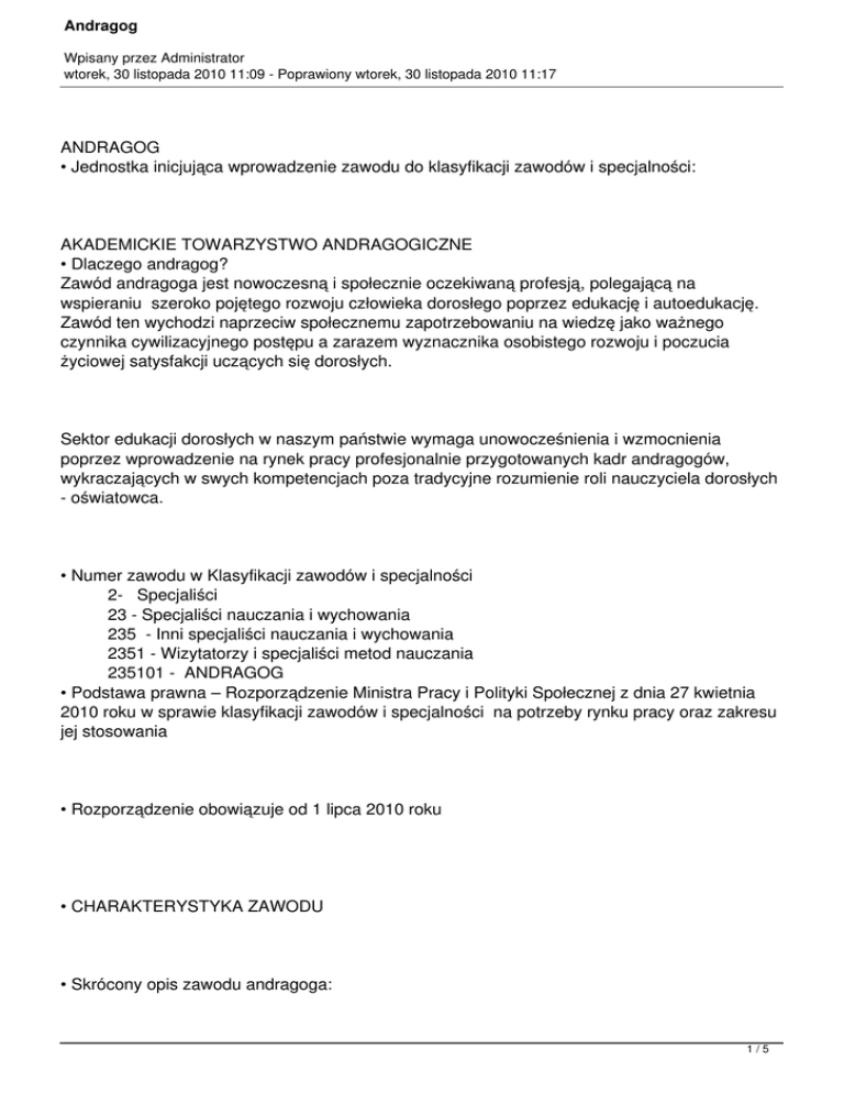 Andragog Wpisany przez Administrator wtorek, 30 listopada 2010 11:09 - Poprawiony wtorek, 30 listopada 2010 11:17 ANDRAGOG • Jednostka inicjująca wprowadzenie zawodu do klasyfikacji zawodów i specjalności: AKADEMICKIE TOWARZYSTWO ANDRAGOGICZNE • Dlaczego andragog? Zawód andragoga jest nowoczesną i społecznie oczekiwaną profesją, polegającą na wspieraniu szeroko pojętego rozwoju człowieka dorosłego poprzez edukację i autoedukację. Zawód ten wychodzi naprzeciw społecznemu zapotrzebowaniu na wiedzę jako ważnego czynnika cywilizacyjnego postępu a zarazem wyznacznika osobistego rozwoju i poczucia życiowej satysfakcji uczących się dorosłych. Sektor edukacji dorosłych w naszym państwie wymaga unowocześnienia i wzmocnienia poprzez wprowadzenie na rynek pracy profesjonalnie przygotowanych kadr andragogów, wykraczających w swych kompetencjach poza tradycyjne rozumienie roli nauczyciela dorosłych - oświatowca. • Numer zawodu w Klasyfikacji zawodów i specjalności 2- Specjaliści 23 - Specjaliści nauczania i wychowania 235 - Inni specjaliści nauczania i wychowania 2351 - Wizytatorzy i specjaliści metod nauczania 235101 - ANDRAGOG • Podstawa prawna – Rozporządzenie Ministra Pracy i Polityki Społecznej z dnia 27 kwietnia 2010 roku w sprawie klasyfikacji zawodów i specjalności na potrzeby rynku pracy oraz zakresu jej stosowania • Rozporządzenie obowiązuje od 1 lipca 2010 roku • CHARAKTERYSTYKA ZAWODU • Skrócony opis zawodu andragoga: 1/5 Andragog Wpisany przez Administrator wtorek, 30 listopada 2010 11:09 - Poprawiony wtorek, 30 listopada 2010 11:17 Andragog opisuje, bada, organizuje, realizuje, koordynuje, inspiruje aktywność edukacyjną człowieka dorosłego podejmowaną w systemie edukacji ustawicznej - ogólnokształcącej i zawodowej: formalnej, pozaformalnej i nieformalnej w różnych środowiskach (społecznościach lokalnych, środowisku pracy, grupach nieformalnych); realizuje cele polityki edukacyjnej państwa w zakresie rozwoju kapitału ludzkiego i społecznego • Szczegółowy opis zawodu andragoga /zadania zawodowe andragoga: • Andragog gromadzi wiedzę na temat: systemu kształcenia w Polsce (edukacji formalnej i pozaformalnej/ szkolnej i pozaszkolnej na wszystkich poziomach kształcenia) oraz na świecie, ze szczególnym uwzględnieniem krajów Unii Europejskiej; misji i celów kształcenia ustawicznego zawartych w dokumentach Unii Europejskiej; uczestników edukacji dorosłych (wieku, płci, motywacji edukacyjnej, aspiracji edukacyjnych, oczekiwań wobec edukacji, barier utrudniających podjęcie edukacji); zmieniających się rodzajów aktywności (w tym edukacyjnej) człowieka dorosłego w różnych fazach jego rozwoju; zadań rozwojowych związanych z okresem dorosłości; prawidłowości uczenia się dorosłych oraz różnorodnych uwarunkowań tego procesu; rynku usług edukacyjnych (firm edukacyjnych, ich ofert: celów, programów i metodyki kształcenia, uzyskiwanych efektów); możliwości finansowego wsparcia projektów edukacyjnych z funduszy UE. • Andragog prowadzi badania empiryczne służące celom naukowym i praktyce: edukacji ustawicznej w Polsce i za granicą ukierunkowanej na kształcenie dorosłych (instytucji kształcenia ustawicznego, programów, rozwiązań metodycznych, uzyskiwanych efektów); edukacji nieformalnej dorosłych; celów, treści, form, metod, procesów kształcenia i samokształcenia dorosłych oraz uwarunkowań: biopsychicznych, społeczno-demograficznych, ekonomicznych, kulturowych i politycznych tych procesów; przygotowuje publikacje naukowe i popularno-naukowe z zakresu edukacji dorosłych. • Andragog diagnozuje i analizuje: rynek edukacyjny; potrzeby edukacyjne indywidualnych odbiorców ofert edukacyjnych, różnych grup społecznych i zawodowych, instytucji, zakładów pracy i stowarzyszeń; poprawność przygotowania i prowadzenia zajęć dydaktycznych dla dorosłych; poziom kompetencji pracownika i proces pracy w celu ich udoskonalenia • Andragog planuje działalność edukacyjną dorosłych w różnych firmach/instytucjach/organizacjach z uwzględnieniem indywidualnej sytuacji życiowej uczestników • Andragog opracowuje krótko i długoterminowe plany szkoleniowe dla różnych grup pracowników/ w różnych firmach i organizacjach; indywidualne i grupowe programy rozwoju kompetencji pracowniczych; programy kursów/szkoleń/seminariów; skrypty, materiały i środki dydaktyczne; programy zajęć dydaktycznych zgodnie z zasadami dydaktyki dorosłych; projekty edukacyjne realizowane w ramach programów unijnych, fundacji, stowarzyszeń • Andragog organizuje i koordynuje działalność edukacyjną w firmach/instytucjach/organizacjach; dobór i upowszechnianie najlepszych z punktu widzenia celów instytucji szkoleń, kursów i seminariów; proces edukacyjnego rozwoju oraz doskonalenia/dokształcania zawodowego pracowników 2/5 Andragog Wpisany przez Administrator wtorek, 30 listopada 2010 11:09 - Poprawiony wtorek, 30 listopada 2010 11:17 • Andragog prowadzi zajęcia dydaktyczne: naucza, pracuje z grupą, tworzy warunki stymulujące do uczenia się, identyfikuje bariery w uczeniu się dorosłych; dobiera koncepcje kształcenia do grupy i jednostek, prowadzi dokumentację związaną z nauczaniem; kształtuje umiejętności kierowania własnym rozwojem i edukacją (w przestrzeni życia rodzinnego, zawodowego, czasu wolnego, roli obywatelskiej, itp.) • Andragog kształci specjalistów z innych dziedzin w zakresie umiejętności kształcenia dorosłych i upowszechnienia wiedzy; znajomości specyfiki oraz wspomagania rozwoju człowieka dorosłego • Andragog wdraża do samokształcenia: udziela wskazówek metodycznych samoukom, tworzy instytucjonalne i organizacyjne warunki do samokształcenia; wspiera samokształcenie dorosłych (projekty z wykorzystaniem mediów masowych i infrastruktury środowiska lokalnego) • Andragog wykorzystuje w procesie kształcenia nowoczesne t