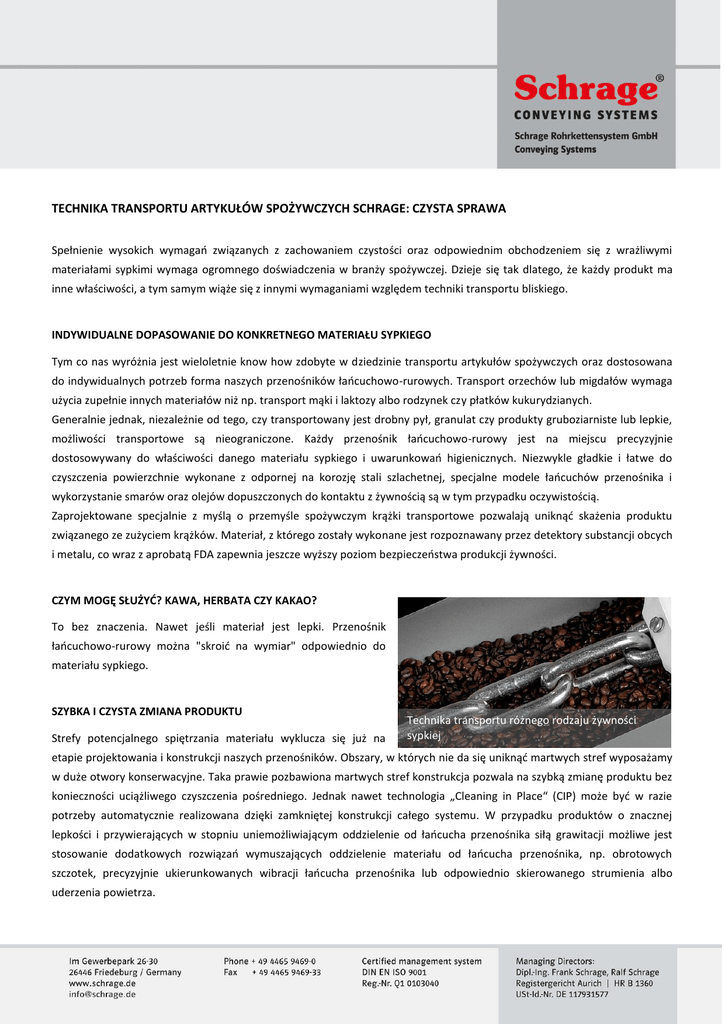 TECHNIKA TRANSPORTU ARTYKUŁÓW SPOŻYWCZYCH SCHRAGE: CZYSTA SPRAWA Spełnienie wysokich wymagań związanych z zachowaniem czystości oraz odpowiednim obchodzeniem się z wrażliwymi materiałami sypkimi wymaga ogromnego doświadczenia w branży spożywczej. Dzieje się tak dlatego, że każdy produkt ma inne właściwości, a tym samym wiąże się z innymi wymaganiami względem techniki transportu bliskiego. INDYWIDUALNE DOPASOWANIE DO KONKRETNEGO MATERIAŁU SYPKIEGO Tym co nas wyróżnia jest wieloletnie know how zdobyte w dziedzinie transportu artykułów spożywczych oraz dostosowana do indywidualnych potrzeb forma naszych przenośników łańcuchowo-rurowych. Transport orzechów lub migdałów wymaga użycia zupełnie innych materiałów niż np. transport mąki i laktozy albo rodzynek czy płatków kukurydzianych. Generalnie jednak, niezależnie od tego, czy transportowany jest drobny pył, granulat czy produkty gruboziarniste lub lepkie, możliwości transportowe są nieograniczone. Każdy przenośnik łańcuchowo-rurowy jest na miejscu precyzyjnie dostosowywany do właściwości danego materiału sypkiego i uwarunkowań higienicznych. Niezwykle gładkie i łatwe do czyszczenia powierzchnie wykonane z odpornej na korozję stali szlachetnej, specjalne modele łańcuchów przenośnika i wykorzystanie smarów oraz olejów dopuszczonych do kontaktu z żywnością są w tym przypadku oczywistością. Zaprojektowane specjalnie z myślą o przemyśle spożywczym krążki transportowe pozwalają uniknąć skażenia produktu związanego ze zużyciem krążków. Materiał, z którego zostały wykonane jest rozpoznawany przez detektory substancji obcych i metalu, co wraz z aprobatą FDA zapewnia jeszcze wyższy poziom bezpieczeństwa produkcji żywności. CZYM MOGĘ SŁUŻYĆ? KAWA, HERBATA CZY KAKAO? To bez znaczenia. Nawet jeśli materiał jest lepki. Przenośnik łańcuchowo-rurowy można "skroić na wymiar" odpowiednio do materiału sypkiego. SZYBKA I CZYSTA ZMIANA PRODUKTU Strefy potencjalnego spiętrzania materiału wyklucza się już na Technika transportu różnego rodzaju żywności sypkiej etapie projektowania i konstrukcji naszych przenośników. Obszary, w których nie da się uniknąć martwych stref wyposażamy w duże otwory konserwacyjne. Taka prawie pozbawiona martwych stref konstrukcja pozwala na szybką zmianę produktu bez konieczności uciążliwego czyszczenia pośredniego. Jednak nawet technologia „Cleaning in Place“ (CIP) może być w razie potrzeby automatycznie realizowana dzięki zamkniętej konstrukcji całego systemu. W przypadku produktów o znacznej lepkości i przywierających w stopniu uniemożliwiającym oddzielenie od łańcucha przenośnika siłą grawitacji możliwe jest stosowanie dodatkowych rozwiązań wymuszających oddzielenie materiału od łańcucha przenośnika, np. obrotowych szczotek, precyzyjnie ukierunkowanych wibracji łańcucha przenośnika lub odpowiednio skierowanego strumienia albo uderzenia powietrza. PIĘĆ RÓŻNYCH ROZMIARÓW I WSZYSTKIE ZALETY SCHRAGE Wszystkie nasze przenośniki łańcuchowo-rurowe projektujemy w konstrukcji modułowej i integrujemy w nich wszelkie zalety, które może zaoferować Schrage: Długość odcinka poziomego nawet do 60 m, odcinka pionowego do 40 m Elastyczne prowadzenie odcinków Kompaktowe wymiary Niski poziom zużycia energii Bezpyłowy, szczelny i hermetyczny transport materiałów sypkich Łatwy transport na odcinkach pionowych Pięć różnych rozmiarów konstrukcyjnych Możliwość integracji wielu wlotów i wylotów Niewielkie nakłady konserwacyjne Odporność na ciśnienie fali detonacyjnej oraz odporność ogniowa i na przebicie (certyfikat) Wszystkie modele dostępne w wersji zgodnej z wyaganiami dyrektywy ATEX W ścisłej współpracy z Niemieckim Instytutem Technologii Spożywczych (DIL) przetestowaliśmy różne formy i konstrukcje naszych przenośników łańcuchowo-rurowych i zoptymalizowaliśmy je pod kątem zastosowania w przemyśle spożywczym. Mała prędkość łańcucha przenośnika oraz idealne dopasowanie stosowanych materiałów stanowi gwarancję niskiego zużycia elementów przenośnika i delikatnego transportu materiałów sypkich – przy minimalnym uszkodzeniu ziaren produktu. Tylko w ten sposób można zapewnić stałą jakość transportowanej żywności. Niechętnie pozostawiamy cokolwiek przypadkowi. Dlatego właśnie testy przeprowadzane przed rozpoczęciem produkcji w naszym dziale technicznym pozwalają na idealny dobór materiałów przenośnika. To właśnie chcemy Państwu zaoferować! Zapraszamy do nas z próbką materiału sypkiego, wspólnie znajdziemy doskonałe rozwiązanie konstrukcyjne odpowiedniego przenośnika łańcuchowo-rurowego.