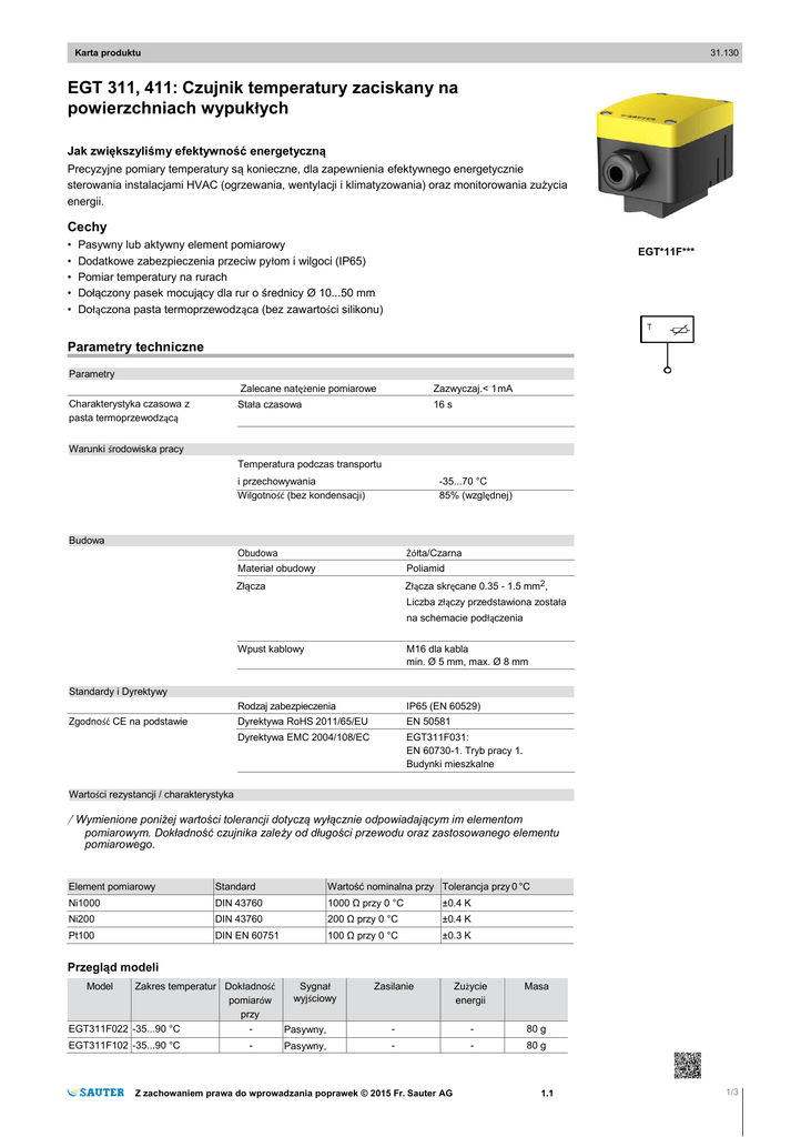 Karta produktu 31.130 EGT 311, 411: Czujnik temperatury zaciskany na powierzchniach wypukłych Jak zwiększyliśmy efektywność energetyczną Precyzyjne pomiary temperatury są konieczne, dla zapewnienia efektywnego energetycznie sterowania instalacjami HVAC (ogrzewania, wentylacji i klimatyzowania) oraz monitorowania zużycia energii. Cechy • • • • • Pasywny lub aktywny element pomiarowy Dodatkowe zabezpieczenia przeciw pyłom i wilgoci (IP65) Pomiar temperatury na rurach Dołączony pasek mocujący dla rur o średnicy Ø 10...50 mm Dołączona pasta termoprzewodząca (bez zawartości silikonu) EGT*11F*** Parametry techniczne Parametry Charakterystyka czasowa z pasta termoprzewodzącą Zalecane natężenie pomiarowe Zazwyczaj.< 1 mA Stała czasowa 16 s Warunki środowiska pracy Temperatura podczas transportu -35...70 °C 85% (względnej) i przechowywania Wilgotność (bez kondensacji) Budowa Obudowa Materiał obudowy Żółta/Czarna Poliamid Złącza Złącza skręcane 0.35 - 1.5 mm2, Liczba złączy przedstawiona została na schemacie podłączenia Wpust kablowy M16 dla kabla min. Ø 5 mm, max. Ø 8 mm Rodzaj zabezpieczenia IP65 (EN 60529) Dyrektywa RoHS 2011/65/EU EN 50581 Dyrektywa EMC 2004/108/EC EGT311F031: EN 60730-1. Tryb pracy 1. Budynki mieszkalne Standardy i Dyrektywy Zgodność CE na podstawie Wartości rezystancji / charakterystyka / Wymienione poniżej wartości tolerancji dotyczą wyłącznie odpowiadającym im elementom pomiarowym. Dokładność czujnika zależy od długości przewodu oraz zastosowanego elementu pomiarowego. Element pomiarowy Standard Ni1000 DIN 43760 Wartość nominalna przy Tolerancja przy 0 °C 0 °C 1000 Ω przy 0 °C ±0.4 K Ni200 DIN 43760 200 Ω przy 0 °C ±0.4 K Pt100 DIN EN 60751 100 Ω przy 0 °C ±0.3 K Przegląd modeli Model Zakres temperatur Dokładność Sygnał wyjściowy pomiarów przy 21 °C EGT311F022 -35...90 °C - 1)2) Pasywny, Ni200 EGT311F102 -35...90 °C Pasywny, Zasilanie Zużycie energii Masa - - 80 g - - 80 g Ni1000 Z zachowaniem prawa do wprowadzania poprawek © 2015 Fr. Sauter AG 1.1 1/3 Karta produktu 31.130 Model Zakres temperatur EGT411F102 -35...90 °C EGT311F031 5 zakresów temperatury (-50...160 °C), wybieranych przy urządzeniu (patrz schemat podłączeń) Dokładność Sygnał wyjściowy pomiarów przy 21 °C - 1)2) Pasywny, Pt1000 Zazwyczaj. ±1% zakresu pomiarowe go 1)2) Aktywny, 0...10 V, min. Impedancja obciążenia 5 kΩ Zasilanie Zużycie energii Masa - - 80 g 15...24 V= (±10%) 24 V~ (±10%) Max. 0.42 W / 0.84 VA 120 g Akcesoria Model Opis 0300360002 Pasek mocujący 900 mm wraz z pasta termoprzewodzącą 0300360004 Pasta termoprzewodząca, wraz z pistoletem z zawartością 2g Opis działania Rezystancja element pomiarowego zmienia się, w zależności od jego temperatury. Współczynnik temperaturowy ma wartość dodatnią, co oznacza, że rezystancja elementu zwiększa się wraz z temperaturą. Czujniki mogą być wymieniane w obrębie określonego zakresu tolerancji. Obszary zastosowań Czujnik temperatury mocowany na powierzchniach wypukłych, wykorzystywany do pomiarów temperatury rur I innych powierzchni. Zaprojektowany został w sposób umożliwiający podłączenie do systemów sterownia i prezentacji pomiarów. Zalecane zastosowanie Opisywany produkt może być stosowany wyłącznie w zakresie, przewidzianym przez producenta, zgodnie z opisem zamieszczonym w rozdziale “Opis działania”. Wszystkie przepisy dotyczące produktu muszą być bezwzględnie przestrzegane. Dokonywanie poprawek lub przeróbek produktu nie jest dozwolone. Informacje inżynieryjne i dotyczące montażu Podłączenie elektryczne Opisywane urządzenia zostały zaprojektowane do pracy z bezpiecznym, ekstra niskim napięciem zasilania (SELV/PELV). Podane parametry techniczne urządzeń są prawidłowe, jeśli zostały one podłączone do takiego właśnie źródła zasilania. Temperatura otoczenia układów elektronicznych przetworników, powinna być utrzymywana na stałym poziomie. ! UWAGA! Możliwość uszkodzenia urządzenia! ► Urządzenia elektryczne mogą być instalowane i integrowane przez wykwalifikowanego elektryka! ! UWAGA! Możliwość uszkodzenia urządzenia! ►Devices Urządzenia wyposażone w przewód zasilający mogą być podłączona wyłącznie, jeśli przewód zasilający został odłączony od sieci. Instrukcje dotyczące montażu Urządzenie montowane jest za pomocą paska mocującego. Maksymalna średnica rury, na której może być zamontowane, nie powinna przekraczać 50 mm, w przeciwnym razie dochodzić może do zjawiska stratyfikacji termicznej. Pastę termoprzewodzącą rozsmarować należy na mosiężnym płaszczu urządzenia, a następnie zamontować czujnik na oczyszczonej powierzchni metalowego przedmiotu, za pomocą paska dociskowego (z mechanizmem szybkiego dociskania). Jeśli jest to możliwe, w celu zapobiegnięcia przenikaniu skraplającej się wody pomiędzy powierzchnie styku, urządzenie montować należy na górnej części rury. Utylizacja Utylizując produkt należy przestrzegać wszystkich, obowiązujących aktualnie przepisów. Szczegółowe informacje dotyczące zastosowanych materiałów znaleźć można w Deklaracji Materiałów i Informacjach Środowiskowych dla danego produktu. 1) Z regulacją kompensacji ±3 K musza pracować zasilane stałym napięciem zasilnia (±0.2 V). Unikać należy wahań natężenie/napięcia prądu podczas włączania i wyłączania zasilania. 2) Przetworniki 2/31.1 Z zachowaniem prawa do wprowadzania poprawek © 2015 Fr. Sauter AG Karta produktu 31.130 Schemat podłączeń EGT311F022, EGT311F102, EGT411F102 1 EGT311F031 2 Wybór zakresu pomiarowego T 1: -50.. +50 °C 2: -10..+120 °C 3: 0.. +50 °C 4: 0..+160 °C 8: -15.. +35 °C T OUT UB GND 0..10 V 15..24 V = 24 V ~ 0,4 Nm Regulacja kompensacji 0K -3 K +3 K Wymiary Fr. Sauter AG Im Surinam 55 CH-4016 Basel Tel. +41 61 - 695 55 55 www.sauter-controls.com Z zachowaniem prawa do wprowadzani