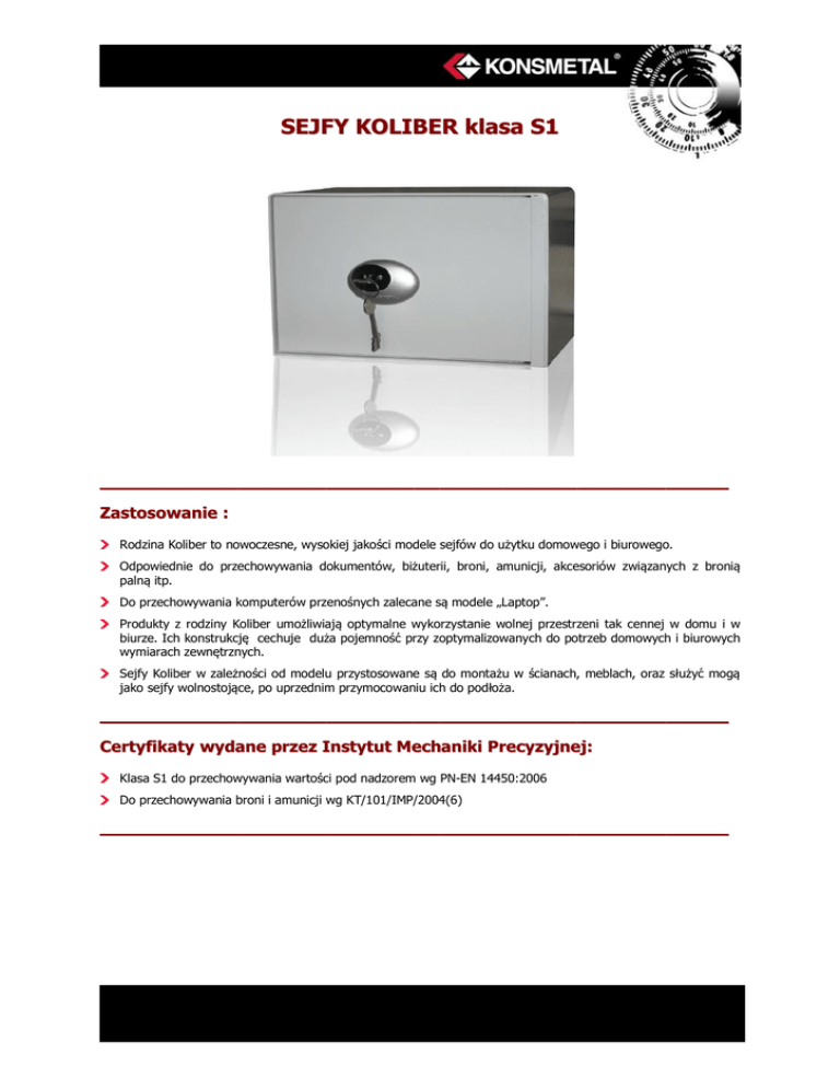 SEJFY KOLIBER klasa S1 ___________ _______ _______ __ ___________ _______ _____ Zastosowanie : Rodzina Koliber to nowoczesne, wysokiej jakości modele sejfów do użytku domowego i biurowego. Odpowiednie do przechowywania dokumentów, biżuterii, broni, amunicji, akcesoriów związanych z bronią palną itp. Do przechowywania komputerów przenośnych zalecane są modele „Laptop”. Produkty z rodziny Koliber umożliwiają optymalne wykorzystanie wolnej przestrzeni tak cennej w domu i w biurze. Ich konstrukcję cechuje duża pojemność przy zoptymalizowanych do potrzeb domowych i biurowych wymiarach zewnętrznych. Sejfy Koliber w zależności od modelu przystosowane są do montażu w ścianach, meblach, oraz służyć mogą jako sejfy wolnostojące, po uprzednim przymocowaniu ich do podłoża. ___________ _______ _______ __ ___________ _______ _____ Certyfikaty wydane przez Instytut Mechaniki Precyzyjnej: Klasa S1 do przechowywania wartości pod nadzorem wg PN-EN 14450:2006 Do przechowywania broni i amunicji wg KT/101/IMP/2004(6) ___________ _______ _______ __ ___________ _______ _____ Opis produktu: Korpus sejfów KOLIBER wykonany jest z wysokiej jakości blachy, o grubości 3 mm i podwyższonej odporności na sforsowanie. Najwyższe standardy bezpieczeństwa gwarantuje również: wzmocniona płyta drzwi o grubości 5 mm z dodatkową osłoną mechanizmu ryglowego i zamka solidne rygle o średnicy 20 mm dodatkowe zabezpieczenie z manganu, chroniące przed przewierceniem rygli wewnętrzna i zewnętrzna blokada drzwi uniemożliwiająca otwarcie zaryglowanego sejfu po wycięciu zawiasów Od strony zawiasów blokowanie drzwi realizowane jest przez zachodzenie płyty drzwi za korpus, dzięki czemu nawet po odcięciu zawiasów niemożliwe jest otwarcie zaryglowanego sejfu. W obrysie drzwi znajdują się progi utrudniające dostęp do rygli, a także chroniące przed wepchnięciem drzwi sejfu do środka podczas próby sforsowania. Sejf K 62 Laptop oraz K 45 Laptop i KSN 45 Ścienny standardowo wyposażone w półkę z płynną regulacją wysokości zawieszenia dostosowaną do potrzeb użytkownika. Modele K 35 wyposażony jest w system mocowania półek z płynną regulacją wysokości zawieszenia. Półka w K35 stanowi wyposażenie dodatkowe. Maksymalne obciążenie półki 50kg Drzwi z zawiasowaniem wewnętrznym, kąt otwarcia 900 Zamek kluczowy kl. A z dwoma, dwupiórowymi kluczami Kotwienie: dwa otwory ø 10 mm w dnie i w ścianie tylnej. Kotwy nie są dołączone do wyrobu i nie stanowią elementu wyposażenia podstawowego. Kotwy dostępne są jako element wyposażenia dodatkowego! Ryglowanie drzwi odbywa się za pomocą rygli ruchomych. Sejfy malowane są trwałymi powłokami z lakierów proszkowych. Gwarancja 24 miesiące ___________ _______ _______ __ ___________ _______ _____ Wyposażenie podstawowe: Otwory montażowe Atestowany zamek kl. A 2 klucze w przypadku zamka kluczowego Instrukcja obsługi i użytkowania wyrobu z kartą gwarancyjną Półka w modelach K 62, K45 i KSN 45 System mocowania półek w K35 ___________ _______ _______ __ ___________ _______ _____ Wyposażenie dodatkowe: Dodatkowe półki (w modelach K 35, K 45 Laptop, K 62 Laptop, KSN 35, KSN 45 Laptop) Kotwy rozporowe Trzeci klucz do zamka kluczowego Skarbczyk w modelu K 62 Laptop ___________ _______ _______ __ ___________ _______ _____ Rodzaje zamków: kluczowy szyfrowy elektroniczny ___________ _______ _______ __ ___________ _______ _____ Standardowe kolory: Szary RAL 7035 (nadawany standardowo, gdy w zamówieniu nie zaznaczono inaczej) Jasnoszary RAL 9002 (należy zaznaczyć w zamówieniu, bez dodatkowej opłaty) Czarny RAL 9005 (należy zaznaczyć w zamówieniu, bez dodatkowej opłaty) * Na indywidualne zamówienie wszystkie kolory z palety RAL (lakier proszkowy) za dodatkową opłatą. ___________ _______ _______ __ ___________ _______ _____ Dane techniczne: K 16 K 20 K 20 Laptop K 35 K 45 Laptop K 62 Laptop W 160 200 200 350 450 620 S 310 310 500 310 500 500 G 180 200 370 280 370 370 W 154 194 194 344 444 614 S 304 304 494 294 484 484 G 130 150 320 230 320 320 Waga [kg] 10,5 12,0 22,4 20,5 37,7 47,7 Pojemność [l] 6,1 8,8 30,6 23,2 68,7 95,0 Model Wymiary zewnętrzne [mm] Wymiary wewnętrzne [mm] Ścienny KSN 16 Ścienny KSN 20 Ścienny KSN 20 Laptop Ścienny KSN 35 Ścienny KSN 45 Laptop W 173 213 213 363 463 S 330 330 520 330 520 G 180 200 370 280 370 W 170 210 210 360 460 S 327 327 517 317 507 G 142 162 332 242 332 Waga [kg] 10,5 12,0 19,0 17,5 31,0 Pojemność [l] 7,9 11,1 36,0 27,6 77,4 Model Wymiary zewnętrzne [mm] Wymiary wewnętrzne [mm] Standardowa ilość półek 0 0 0 0 1 1 0 0 0 0 1 Model K 16 K 20 K 20 Laptop K 35 K 45 Laptop K 62 Laptop KSN 16 KSN 20 KSN 20 Laptop KSN 35 KSN 45 Laptop Model Promień otwarcia drzwi R [mm] Prześwit drzwi [mm] K 16 251 Wys. 126 Szer. 219,5 K 20 251 166 219,5 K 20 Laptop 441 166 409,5 K 35 251 316 219,5 K 45 Laptop 441 416 409,5 K 62 Laptop 441 586 409,5 Ścienny KSN 16 256 142 233,5 Ścienny KSN 20 256 182 233,5 Ścienny KSN 20 Laptop 446 182 423,5 Ścienny KSN 35 256 332 233,5 Ścienny KSN 45 Laptop 446 432 423,5 ___________ _______ _______ __ ___________ _______ _____ Montaż: W związku z normą PN-EN 14450:2006 sejf należy przytwierdzić do podłoża lub ściany przy pomocy dwóch kołków rozporowych, zwanych dalej kotwami. Sejf Koliber wyposażony jest w otwory umożliwiające kotwienie. Lekkie sejfy o małych wymiarach zaleca się montować wewnątrz innych mebli jednak w żadnym wypadku do łatwo demontowanych półek. Uwaga: - Nie zamocowanie sejfu skutkuje utratą posiadanego przez wyrób certyfikatu - Kotwy użyte do mocowania sejfu muszą spełnić wymagani normy PN-EN 14450:2006. - Przykład spełniających normę kotw firmy Fischer: Modele: FBN II 10/20 FBN II 10/30 FBN II 10/50 FBN II 10/70 FBN II 10/140 FBN II 10/160 Aby zamontować sejf do podłoża lub do ściany tylnej należy: Zmierzyć rozstaw otworów w sejfie. Natrasować usytuowanie otwor