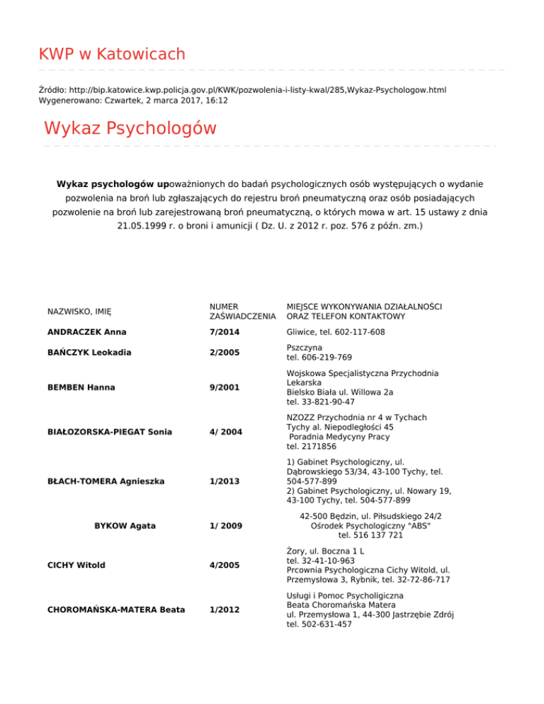 KWP w Katowicach Źródło: http://bip.katowice.kwp.policja.gov.pl/KWK/pozwolenia-i-listy-kwal/285,Wykaz-Psychologow.html Wygenerowano: Czwartek, 2 marca 2017, 16:12 Wykaz Psychologów Wykaz psychologów upoważnionych do badań psychologicznych osób występujących o wydanie pozwolenia na broń lub zgłaszających do rejestru broń pneumatyczną oraz osób posiadających pozwolenie na broń lub zarejestrowaną broń pneumatyczną, o których mowa w art. 15 ustawy z dnia 21.05.1999 r. o broni i amunicji ( Dz. U. z 2012 r. poz. 576 z późn. zm.) NAZWISKO, IMIĘ NUMER ZAŚWIADCZENIA MIEJSCE WYKONYWANIA DZIAŁALNOŚCI ORAZ TELEFON KONTAKTOWY ANDRACZEK Anna 7/2014 Gliwice, tel. 602-117-608 BAŃCZYK Leokadia 2/2005 Pszczyna tel. 606-219-769 9/2001 Wojskowa Specjalistyczna Przychodnia Lekarska Bielsko Biała ul. Willowa 2a tel. 33-821-90-47 4/ 2004 NZOZZ Przychodnia nr 4 w Tychach Tychy al. Niepodległości 45 Poradnia Medycyny Pracy tel. 2171856 1/2013 1) Gabinet Psychologiczny, ul. Dąbrowskiego 53/34, 43-100 Tychy, tel. 504-577-899 2) Gabinet Psychologiczny, ul. Nowary 19, 43-100 Tychy, tel. 504-577-899 1/ 2009 42-500 Będzin, ul. Piłsudskiego 24/2 Ośrodek Psychologiczny "ABS" tel. 516 137 721 4/2005 Żory, ul. Boczna 1 L tel. 32-41-10-963 Prcownia Psychologiczna Cichy Witold, ul. Przemysłowa 3, Rybnik, tel. 32-72-86-717 1/2012 Usługi i Pomoc Psycholigiczna Beata Choromańska Matera ul. Przemysłowa 1, 44-300 Jastrzębie Zdrój tel. 502-631-457 BEMBEN Hanna BIAŁOZORSKA-PIEGAT Sonia BŁACH-TOMERA Agnieszka BYKOW Agata CICHY Witold CHOROMAŃSKA-MATERA Beata DOROSZUK Elżbieta 2/2004 Myszków, ul. Żeromskiego 11 Pracownia Psychologiczna „Elmador” tel. 603 870 608 GASIŃSKA Antonina 5/2002 Bielsko – Biała, ul. 1 Maja 34 Pracownia Usług Psychologicznych tel. 33 822-87-95, 606-250-743 GEMRA Marzena GIERA Jolanta 5/2010 7/2012 HESS Monika JAZŁOWSKI Marek JURCZYGA Magdalena KALARUS-CICHOŃ Zofia KĘDZIERSKA-CHADUŁA Iwona KIEDOS Paweł KIŃCZYK Justyna Ośrodek Usług Psychologicznych i Lekarskich Giera Jolanta, Racibórz, ul. Batorego 7/3, tel. 32 415 49 87, 602 397 260 aders do korespondencji: 47-400 Racibórz, ul. Segeta 4 CKiPK Lider Sp. z o. o., Jaworzno, ul. Grunwaldzka 285, KOS Sp. z o. o. Knurów, ul. Szpitalna 8, odział Lędziny, ul. Lędzińska 24, tel. 601-167-341 GRABOWSKA-SMALCERZ Józefa HAJDA Teresa Przychodnia Lekarska Specjalistyczna MEDIMED ul. 1 Maja 26, 41-200 Sosnowiec tel.: 032 360 30 25, 604555828 3 /2003 3/2015 tel. 608-386-415 Pracownia Psychologiczna Psyche, ul. Filomatów 10, 43-316 Bielsko-Biała, tel. 608-315-680 Pracownia Psychologiczna Psyche, ul. rynek 5, 32-650 Kęty, tel. 884-940-040 NZOZ Medica S.C., ul. Drozdów 8, 43-450 Ustroń 3/2010 1) NZOZ MACIEJÓW, Zabrze, ul. Kondratowicza 1 2) NZOZ MEDEN, Gliwice, ul. Zabrska 6 3) Przychodnia Unii Brackiej "Sośnica" Gliwice, ul. Błonie 3 tel.: 509-272-687, e-mail : [email protected] 1/2015 Śląskie Centrum Usług Wspólnych Sp. z o. o. Pracownia Badań Psychologicznych, Mysłowice, ul. Piastów Śląskich, tel. 32-225-70-94 wew. 25, 696-228-746 Katowice, ul. Karolinki 1, tel. 32 4204446, 693901197 2/2001 Poradnia Psychologiczna Zawiercie, ul. Piłsudskiego 80 tel. 32-67-11-865 6/2014 Centrum Badań Psychologicznych Progres, Będzin, ul. Bema 14. tel. 733-842-424 1/2010 GABINET PSYCHOLOGICZNY Danków 11a, 42-165 Lipie, powiat Kłobucki tel. 509 550 111 16/2001 Gabinet Psychologiczny Bytom ul. Witczaka 28 tel. 605 088 684, e-mail: [email protected] KMIEĆ Wiesława 10/2001 Wojskowa Specjalistyczna Przychodnia Lekarska Bielsko Biała ul.Willowa 2a tel. 33-821-90-47 29/2004 Pracownia Diagnostyki Psychologicznej, "Ultramedic"-Centrum Medyczne Bielsko-Biała, ul. Broniewskiego 48, tel. 601-879-282, 33 816 52 60 KORCHUT Mieczysław Wojciech 2/2007 Psychotronics Grupa Psychologiczno Egzystencjalna 43-109 Tychy ul. Przemysłowa 55 tel. 032 2196973 KOSIŃSKA-SZCZERCZOWSKA Magdalena 2/2016 TESTA Usługi Psychologiczne, 43-300 Bielsko-Biała, ul. Montażowa 3, tel. 797-523-023 KOZŁOWSKA Aneta 1/2011 Zakład Opieki Zdrowotnej MSW im. sierż. Grzegorza Załogi, 40-052 Katowice, ul. Głowackiego 10, tel. 32-782-72-00 BiM. M Pracownia Psychologiczna, 42-200 Zawiercie, ul. Bankowa 4, tel. 880-851713 Pracownia Psychologiczna Kierowców i Innych Zawodów Dąbrowa Górnicza, u. Jana Sobieskiego 59, tel. 32-2624412 KUCHARSKA Stefania 19/2001 Gabinet Psychologiczny Potępa Krupski Młyn ul. Piecucha 6 tel. 603-686-081 KNAP-ZAGÓRA Agnieszka Szpital Miejski nr 4 Gliwice ul. Zygmunta Starego 20 tel. 2318888 wew. 331, 32-231-88-88 KULAGA - TETERA Marta LABY Jerzy LISEK-STELMACH Dorota LISTEK Hanna 3/2001 Pracownia Psychologiczna DIAGNOZA A.C. Banaszkiewicz Sp. z o. o. w Gliwicach, ul. Kłodnicka 16, tel. 2315896 11/2001 Ośrodek Badań i Usług Psychologicznych Jerzy Laby Rybnik ul. Jankowicka 23/25 tel. 32 42 311 31 2/2011 "LISEK-MED" mgr Dorota Lisek - Stelmach 41-800 Zabrze, ul. Majnusza 2 tel. 660-111-969 (32-278-04-37) 4/2012 Lanette Psychotest Pracownia Badań Psychologicznych Gliwice, ul. Chopina 6, pok. 104 tel: 513-999-955 MATUSZCZAK Ewelina 8/2014 506-550-702 MAZELEWSKA-SOKOŁOWSKA Oliwia 4/2015 Gabinet Psychologiczny, Al. Wolności 22a/3, 42-217 Częstochowa, te. 502-291-584 2/2010 PRACOWNIA PSYCHOLOGICZNA "POINT", ul. Dworcowa 5 44-240 Żory tel.: 605-446-662, e-mail: [email protected] METLAK Alicja MICHALAK Paulina 9/2014 507-504-515 2/2003 Gabinet Psychologiczny Agnieszka Miklewska Częstochowa, ul. Kilińskiego 21, tel. 609-771-674 MOSKAL Aleksandra 1/2007 Zakład Opieki Zdrowotnej Przychodnia Specjalistyczna "DIAGNOZA" A.C. Banaszkiewicz Sp. z o.o. Gliwice, ul. Kłodnicka 16/3, tel. 32-231-58-96, 606125140 NOWAK Beata 5/2005 Tarnowskie Góry, ul. Niedziałkowskiego 21 Tel. 502 572 816, (0-32) 285 54 45 OĆWIEJA Hanna 2/2014 Pracownia Psychologczna "Pozyton", Lędziny, ul. Pokoju 17 tel. 508078110 17/2001 1) Centrum Usłuch Psychologicznych Sosnowiec, u. Okólna 23 2) Centrum Usług Psychologicznych, Katowice