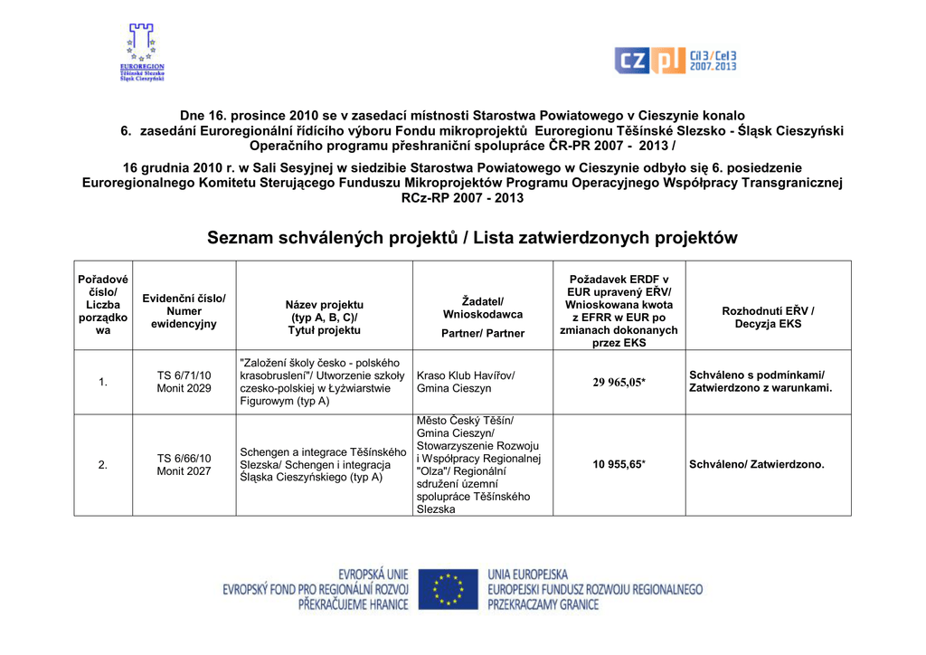 Dne 16. prosince 2010 se v zasedací místnosti Starostwa Powiatowego v Cieszynie konalo 6. zasedání Euroregionální řídícího výboru Fondu mikroprojektů Euroregionu Těšínské Slezsko - Śląsk Cieszyński Operačního programu přeshraniční spolupráce ČR-PR 2007 - 2013 / 16 grudnia 2010 r. w Sali Sesyjnej w siedzibie Starostwa Powiatowego w Cieszynie odbyło się 6. posiedzenie Euroregionalnego Komitetu Sterującego Funduszu Mikroprojektów Programu Operacyjnego Współpracy Transgranicznej RCz-RP 2007 - 2013 Seznam schválených projektů / Lista zatwierdzonych projektów Pořadové číslo/ Liczba porządko wa Evidenční číslo/ Numer ewidencyjny 1. TS 6/71/10 Monit 2029 "Založení školy česko - polského krasobruslení"/ Utworzenie szkoły czesko-polskiej w Łyżwiarstwie Figurowym (typ A) TS 6/66/10 Monit 2027 Město Český Těšín/ Gmina Cieszyn/ Stowarzyszenie Rozwoju Schengen a integrace Těšínského i Współpracy Regionalnej Slezska/ Schengen i integracja "Olza"/ Regionální Śląska Cieszyńskiego (typ A) sdružení územní spolupráce Těšínského Slezska 2. Název projektu (typ A, B, C)/ Tytuł projektu Žadatel/ Wnioskodawca Partner/ Partner Kraso Klub Havířov/ Gmina Cieszyn Požadavek ERDF v EUR upravený EŘV/ Wnioskowana kwota z EFRR w EUR po zmianach dokonanych przez EKS Rozhodnutí EŘV / Decyzja EKS 29 965,05* Schváleno s podmínkami/ Zatwierdzono z warunkami. 10 955,65* Schváleno/ Zatwierdzono. 3. TS 6/68/10 Monit 2018 Poznávejte region trojmezí (typ B) GOTIC, příspěvková organizacje/ Gmina Istebna 10 174,50* Schváleno s podmínkou/ Zatwierdzono z warunkiem. 4. ŚC 6/105/10 Monit 2024 Poznajcie region Trójstyku (typ B) Gmina Istebna/ GOTIC, příspěvková organizacje 16 022,50* Schváleno s podmínkou/ Zatwierdzono z warunkiem. 5. ŚC 6/102/10 Monit 2021 Dwa miasta - jedna tradycja / Dvě města - jedna tradice (typ B) 10 561,28* Schváleno/ Zatwierdzono. 6. ŚC 6/109/10 Monit 2031 Rowerem po Euroregionie. Tworzenie i rozwój prod. turyst. w oparciu o system szlaków rowerowych ERŚC (typ B) 30 000,00* Schváleno s podmínkou/ Zatwierdzono z warunkiem. 7. TS 6/62/10 Monit 2019 Trojmezí - to nás spojuje (typ B) 9 936,00* Schváleno s podmínkami/ Zatwierdzono z warunkami. 8. TS 6/70/10 Monit 2025 Dvě města-jedna tradice (typ B) 30 000,00* Schváleno/ Zatwierdzono. 9. ŚC 6/100/10 Monit 2017 30 000,00* Schváleno/ Zatwierdzono. 10. TS 5/57/10 Monit 1733 15 189,50* Schváleno/ Zatwierdzono. 11. ŚC 6/106/10 Monit 2026 21 139,50* Schváleno s podmínkami/ Zatwierdzono z warunkami. Muzeum Śląska Cieszyńskiego/ Muzeum Těšínska, p.o. Stowarzyszenie Rozwoju i Współpracy Regionalnej 'Olza'/ Regionální sdružení územní spolupráce Těšínského Slezska Sdružení obcí Jablunkovska/ Gminny Ośrodek Kultury - Biblioteka Publiczna w Istebnej Muzeum Těšínska, p.o./ Muzeum Śląska ieszyńskiego Jabłonków-Wisła na turystycznych Gmina Wisła/ Město ścieżkach transgranicznych - etap Jablunkov II (typ B) Regionální sdružení Chceme, abyste o nás věděli! ER územní spolupráce TS-ŚC škola evropské integrace Těšínského Slezska/ a prohlubování vzájemné důvěry. Stowarzyszenie Rozwoju (typ B) i Współpracy Regionalnej 'Olza' Gminny Ośrodek Kultury - Biblioteka Publiczna Trójstyk - to nas łączy (typ B) w Istebnej/ Sdružení obcí Jablunkovska 12. TS 6/63/10 Monit 2010 Jablunkov - Wisła na turistických Město Jablunkov/ Gmina přeshraničních stezkách - II. etapa Wisła (typ B) Gminny Ośrodek Kultury w Jasienicy/ Místní skupina Polského kulturně -osvětového svazu v Třinci - Dolní Lištné/ Místní organizace PZKO v Českém Těšíně - Svibice Muzeum Śląska Cieszyńskiego/ Muzeum Těšínska, p.o. 23 740,00* Schváleno s podmínkou/ Zatwierdzono z warunkiem. 20 565,96* Schváleno s podmínkami/ Zatwierdzono z warunkami. 25 262,74* Schváleno/ Zatwierdzono. 13. ŚC 6/117/10 Monit 2207 Na pograniczu kultur. Polsko -czeskie spotkania artystyczne Leszna Dolna-Jasienica-Sibica (typ B) 14. ŚC 6/101/10 Monit 2020 Muzeum otwarte na świat (typ C) 15. ŚC 6/95/10 Monit 2007 Bogaci tradycją. Obrzędowość na pograniczu polsko-czeskim (II edycja) (typ C) Gminny Ośrodek Kultury w Jasienicy/ Místní skupina PZKO Guty 8 193,47* Schváleno s podmínkou/ Zatwierdzono z warunkiem. 16. TS 6/73/10 Monit 2205 Místní skupina Polského Přes hranice kultur. Česko kulturně -osvětového - polská umělecká setkání - Třinec svazu v Třinci - Dolní - Dolní Lištna (typ B) Lištné/ Gminny Ośrodek Kultury w Jasienicy 30 000,00* Schváleno s podmínkou/ Zatwierdzono z warunkiem. 17. ŚC 6/98/10 Monit 2015 Dzieci i kultura bez granic (typ B) Gmina Strumień/ Obec Dolní Domaslavice 11 476,91* Schváleno s podmínkami/ Zatwierdzono z warunkami. 18. ŚC 6/111/10 Monit 2034 Hokej bez granic (typ C) Jastrzębski Klub Hokejowy GKS Jastrzębie/ Sportovní klub 14 981,00* Schváleno s podmínkou/ Zatwierdzono z warunkiem. 19. ŚC 6/116/10 Monit 2038 Transgranicznie dla Dzieci. Centrum Współpracy Kulturalno – Turystycznej Chybie – Terlicko, etap II (typ C) Gmina Chybie/ Obec Těrlicko 26 072,00* Schváleno/ Zatwierdzono. 20. TS 6/74/10 Monit 2204 21. ŚC 5/92/10 Monit 1736 22. TS 6/75/10 Monit 2213 23. TS 6/59/10 Monit 2005 24. TS 6/65/10 Monit 2012 25. TS 6/69/10 Monit 2022 26. ŚC 6/107/10 Monit 2028 27. ŚC 6/97/10 Monit 2014 Místní organizace PZKO v Přes hranice kultur. Česko Českém Těšíně – Svibice/ - polská umělecká setkání - Český Gminny Ośrodek Kultury Těšín – Svibice (typ B) w Jasienicy Robotniczy Klub Sportowy Po sąsiedzku, na sportowo i bez "Cukrownik" Chybie/ granic (typ C) Fotbalový klub Regionální sdružení územní spolupráce Bezpečná kapacita E 75 (typ C) Těšínského Slezska/ Powiat Cieszyński Základní škola a mateřská škola Stanisława Hadyny s polským jazykem Zimní olympiáda - 40. ZJAZD vyučovacím/ Gminny GWIAŹDZISTY (typ C) Ośr