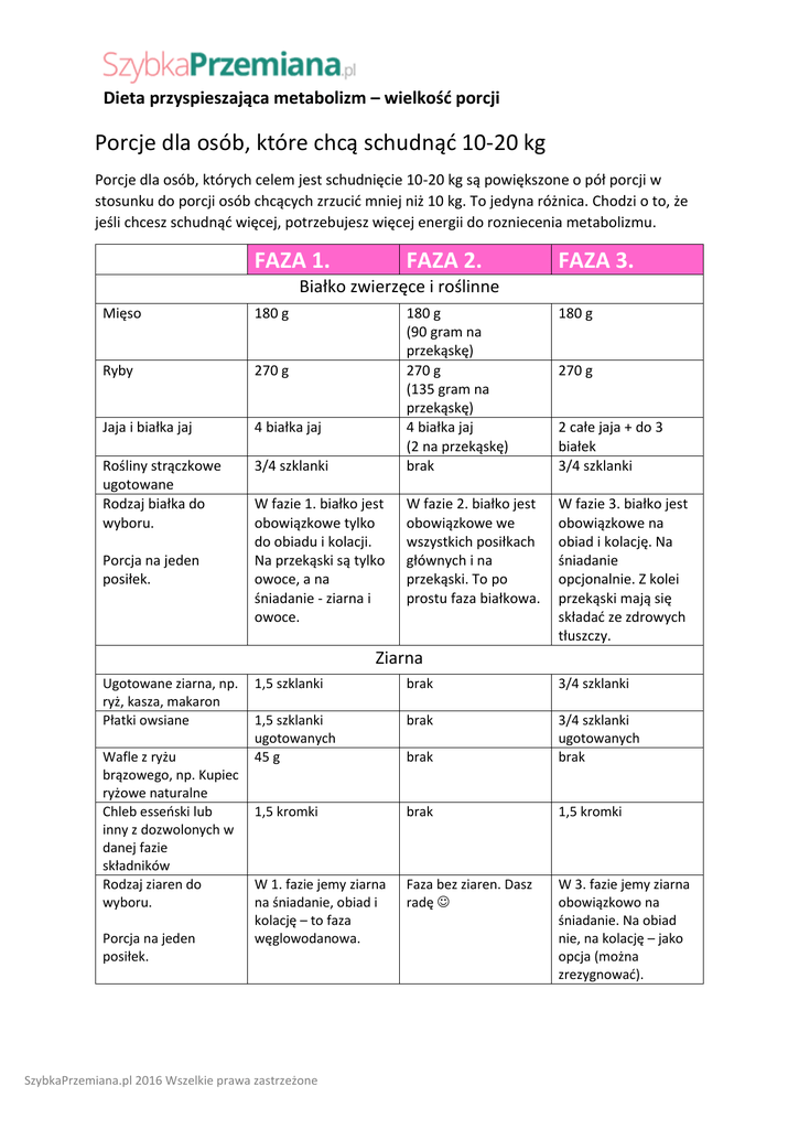 Dieta przyspieszająca metabolizm – wielkość porcji Porcje dla osób, które chcą schudnąć 10-20 kg Porcje dla osób, których celem jest schudnięcie 10-20 kg są powiększone o pół porcji w stosunku do porcji osób chcących zrzucić mniej niż 10 kg. To jedyna różnica. Chodzi o to, że jeśli chcesz schudnąć więcej, potrzebujesz więcej energii do rozniecenia metabolizmu. FAZA 1. FAZA 2. FAZA 3. Białko zwierzęce i roślinne Mięso 180 g Ryby 270 g Jaja i białka jaj 4 białka jaj Rośliny strączkowe ugotowane Rodzaj białka do wyboru. 3/4 szklanki Porcja na jeden posiłek. W fazie 1. białko jest obowiązkowe tylko do obiadu i kolacji. Na przekąski są tylko owoce, a na śniadanie - ziarna i owoce. 180 g (90 gram na przekąskę) 270 g (135 gram na przekąskę) 4 białka jaj (2 na przekąskę) brak 180 g W fazie 2. białko jest obowiązkowe we wszystkich posiłkach głównych i na przekąski. To po prostu faza białkowa. W fazie 3. białko jest obowiązkowe na obiad i kolację. Na śniadanie opcjonalnie. Z kolei przekąski mają się składać ze zdrowych tłuszczy. 270 g 2 całe jaja + do 3 białek 3/4 szklanki Ziarna Ugotowane ziarna, np. ryż, kasza, makaron Płatki owsiane Wafle z ryżu brązowego, np. Kupiec ryżowe naturalne Chleb esseński lub inny z dozwolonych w danej fazie składników Rodzaj ziaren do wyboru. Porcja na jeden posiłek. 1,5 szklanki brak 3/4 szklanki 1,5 szklanki ugotowanych 45 g brak brak 3/4 szklanki ugotowanych brak 1,5 kromki brak 1,5 kromki W 1. fazie jemy ziarna na śniadanie, obiad i kolację – to faza węglowodanowa. Faza bez ziaren. Dasz radę W 3. fazie jemy ziarna obowiązkowo na śniadanie. Na obiad nie, na kolację – jako opcja (można zrezygnować). SzybkaPrzemiana.pl 2016 Wszelkie prawa zastrzeżone Dieta przyspieszająca metabolizm – wielkość porcji FAZA 1. FAZA 2. FAZA 3. Owoce i warzywa Owoce 1,5 szklanki lub 1,5 sztuki Warzywa i zielenina typu natka 3 szklanki do posiłku głównego lub więcej (bez ograniczeń) Owoce w fazie 1. jemy jako przekąski oraz do śniadania i obiadu. brak (oprócz cytryny i limonki, które są dozwolone) 3 szklanki do posiłku głównego, 1,5 szklanki do przekąski lub więcej (bez ograniczeń) Komentarz zbędny ;) 1,5 szklanki lub 1,5 sztuki 3 szklanki do posiłku głównego, 1,5 szklanka do przekąski lub więcej (bez ograniczeń) Owoce w fazie 3. jemy do śniadania i obiadu. Zdrowe tłuszcze Oleje brak brak 4,5 łyżki Humus brak brak 1/2 szklanki Guacamole brak brak 1/2 szklanki Awokado brak brak 3/4 awokado Surowe (czyli brak brak 3/8 szklanki nieprażone) orzechy Masło z surowych brak brak 3 łyżki orzechów Podane porcje dotyczą przekąski, w posiłku głównym można mieszać różne rodzaje tłuszczy (np. awokado i olej), więcej szczegółów we wpisie: Zdrowe tłuszcze w 3. fazie diety – ile można ich zjeść? Przyprawy i inne Zioła świeże Buliony Przyprawy sypkie, np. bazylia, papryka, cynamon itd. Przyprawy płynne, np. ocet balsamiczny, sos tamari, tabasco itd. Bez ograniczeń Bez ograniczeń Bez ograniczeń Bez ograniczeń Bez ograniczeń Bez ograniczeń Bez ograniczeń Bez ograniczeń Bez ograniczeń Bez ograniczeń Bez ograniczeń Bez ograniczeń SzybkaPrzemiana.pl – blog prywatny, prowadzony z sercem, o diecie przyspieszającej metabolizm. Zapraszam także do zapisania się do newslettera na temat diety, polubienia funpage’a na Facebooku, obserwowania profilu na Instagramie oraz zapisania się do zamkniętej grupy facebookowej. SzybkaPrzemiana.pl 2016 Wszelkie prawa zastrzeżone