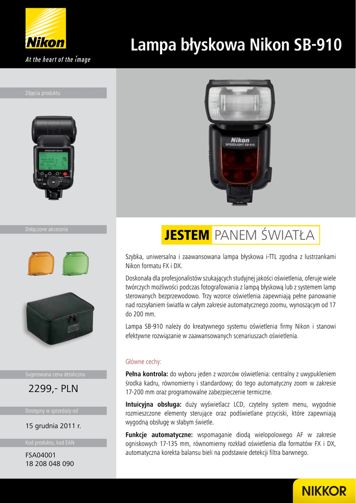 Lampa błyskowa Nikon SB-910 Zdjęcia produktu Dołączone akcesoria JESTEM PANEM ŚWIATŁA Szybka, uniwersalna i zaawansowana lampa błyskowa i‑TTL zgodna z lustrzankami Nikon formatu FX i DX. Doskonała dla profesjonalistów szukających studyjnej jakości oświetlenia, oferuje wiele twórczych możliwości podczas fotografowania z lampą błyskową lub z systemem lamp sterowanych bezprzewodowo. Trzy wzorce oświetlenia zapewniają pełne panowanie nad rozsyłaniem światła w całym zakresie automatycznego zoomu, wynoszącym od 17 do 200 mm. Lampa SB‑910 należy do kreatywnego systemu oświetlenia firmy Nikon i stanowi efektywne rozwiązanie w zaawansowanych scenariuszach oświetlenia. Główne cechy: Sugerowana cena detaliczna 2299,- PLN Dostępny w sprzedaży od 15 grudnia 2011 r. Kod produktu, kod EAN FSA04001 18 208 048 090 Pełna kontrola: do wyboru jeden z wzorców oświetlenia: centralny z uwypukleniem środka kadru, równomierny i standardowy; do tego automatyczny zoom w zakresie 17‑200 mm oraz programowalne zabezpieczenie termiczne. Intuicyjna obsługa: duży wyświetlacz LCD, czytelny system menu, wygodnie rozmieszczone elementy sterujące oraz podświetlane przyciski, które zapewniają wygodną obsługę w słabym świetle. Funkcje automatyczne: wspomaganie diodą wielopolowego AF w zakresie ogniskowych 17‑135 mm, równomierny rozkład oświetlenia dla formatów FX i DX, automatyczna korekta balansu bieli na podstawie detekcji filtra barwnego. Seria S Dane techniczne Konstrukcja elektroniczna Automatyczny tranzystor IGBT (Insulated Gate Bipolar Transistor) i zespół szeregowych obwodów elektrycznych Liczba przewodnia (dla formatu FX, przy pozycji palnika lampy 35 mm, standardowym wzorcu oświetlenia i temperaturze 20°C) Efektywny zasięg błysku (w trybach i-TTL, błysku z automatyczną regulacją przysłony lub automatyki błysku bez TTL) Wzorce oświetlenia 34 (ISO 100, m), 48,5 (ISO 200, m) Dostępne tryby pracy lampy błyskowej Inne dostępne funkcje Kreatywny system oświetlenia firmy Nikon (CLS) Fotografowanie przy użyciu kilku lamp Ustalenie ekspozycji błysku w aparacie Możliwości odbicia światła Przełącznik ON/OFF Zasilanie Wskaźnik gotowości lampy Wskaźnik gotowości lampy (w trybie lampy zdalnej) Czas trwania błysku (w przybliżeniu) Dźwignia blokady stopki mocującej Kompensacja błysku Ustawienia osobiste Pozostałe funkcje 0,6–20 m (w zależności od ustawienia obszaru zdjęcia, wzorca oświetlenia, czułości ISO, pozycji palnika lampy i ustawionej przysłony obiektywu) Standardowy, równomierny i centralny z uwypukleniem środka kadru. Kąt dystrybucji światła jest automatycznie dostosowywany do obszaru zdjęcia w aparatach formatu FX i DX. i-TTL, błysk z automatyką przysłony, automatyka bez błysku TTL, tryb manualny błysku z priorytetem odległości; tryb manualny, błysk stroboskopowy Błysk testowy, przedbłyski monitorujące, wspomaganie diodą wielopolowego AF i oświetlenie modelujące Wiele funkcji lampy błyskowej jest dostępnych w połączeniu ze zgodnymi aparatami fotograficznymi: tryb i-TTL, zaawansowany bezprzewodowy system oświetlenia, blokada mocy błysku, informowanie o temperaturze barwowej błysku, automatyczna synchronizacja z krótkimi czasami migawki i wspomaganie diodą wielopolowego AF Zaawansowany bezprzewodowy system oświetlenia, zdjęcia z wieloma bezprzewodowymi lampami błyskowymi z użyciem sterownika SU-4 Tryby synchronizacji aparatu: synchronizacja z długimi czasami ekspozycji, redukcja efektu czerwonych oczu przy synchronizacji z długimi czasami ekspozycji, synchronizacja na przednią kurtynkę migawki, synchronizacja na tylną kurtynkę migawki, synchronizacja na tylną kurtynkę migawki z długimi czasami ekspozycji. Funkcje fotograficzne: automatyczna synchronizacja z krótkimi czasami migawki, blokada mocy błysku, redukcja efektu czerwonych oczu Główka lampy błyskowej pochylana w dół o -7° i w górę do 90° z blokowaniem w pozycjach -7°, 0°, 45°, 60°, 75°, 90°; obrót w poziomie do 180° w lewo lub w prawo z blokowaniem w pozycjach 0°, 30°, 60°, 75°, 90°, 120°, 150°, 180° Obracając przełącznik ON/OFF, lampę SB-910 można włączyć, wyłączyć, lub ustawić w tryb sterowania bezprzewodowego wieloma lampami, lub w tryb lampy zdalnej. Jest również tryb czuwania. Cztery baterie typu AA tej samej marki i jednego z następujących rodzajów: baterie alkaliczne 1,5 V LR6 (typu AA), baterie litowe 1,5 V FR6 (typu AA), akumulatory niklowo-wodorkowe 1,2 V HR6 (typu AA) Lampa SB-910 w pełni naładowana: wskaźnik świeci; niewystarczająca ilość światła do uzyskania poprawnej ekspozycji (w trybach i-TTL, błysku z automatyką przysłony, błysku automatycznego bez TTL i w trybie manualnym błysku z priorytetem odległości): wskaźnik miga Lampa SB-910 w pełni naładowana: wskaźnik miga; niewystarczająca ilość światła do uzyskania poprawnej ekspozycji (w trybach i-TTL, błysku z automatyką przysłony, błysku automatycznego bez TTL lub w trybie automatyki programowej podczas fotografowania z wieloma lampami bezprzewodowymi typu SU-4): wskaźnik miga szybko 1/880 s przy pełnej mocy 1/1, 1/1100 s przy 1/2 mocy, 1/2550 s przy 1/4 mocy, 1/5000 s przy 1/8 mocy, 1/10000 s przy 1/16 mocy, 1/20000 s przy 1/32 mocy, 1/35700 s przy 1/64 mocy, 1/38500 s przy 1/128 mocy Umożliwia pewne zamocowanie lampy SB-910 w sankach mocujących aparatu przy użyciu mechanizmu blokowania i bolca blokującego, co zapobiega przypadkowemu odłączeniu. Kompensacja mocy błysku od -3,0 EV do +3,0 EV z krokiem 1/3 EV w trybach i-TTL, błysku z automatyką przysłony, automatyki błysku bez TTL i w trybie manualnym błysku z priorytetem odległości 19 pozycji Wymiary (szer. x wys. x głęb.) Ręczne ustawianie czułości ISO, wyświetlanie stopnia niedoświetlenia wynikającego ze zbyt małej mocy błysku w trybie i-TTL, zresetowanie do ustawień domyślnych, blokada przycisków, wy