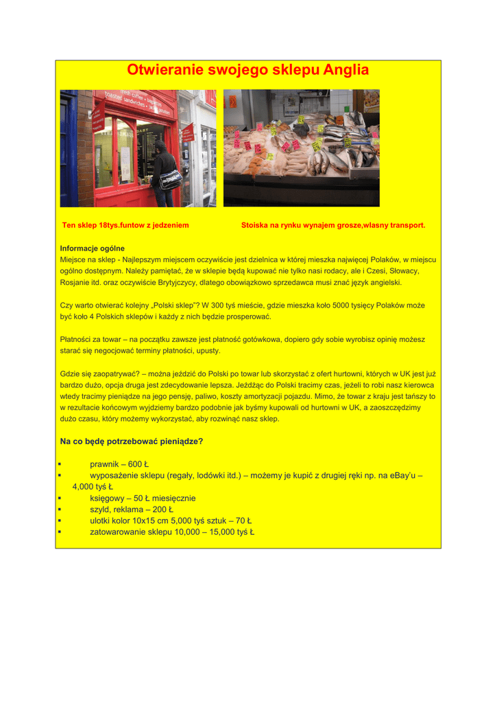 Otwieranie swojego sklepu Anglia Ten sklep 18tys.funtow z jedzeniem Stoiska na rynku wynajem grosze,wlasny transport. Informacje ogólne Miejsce na sklep - Najlepszym miejscem oczywiście jest dzielnica w której mieszka najwięcej Polaków, w miejscu ogólno dostępnym. Należy pamiętać, że w sklepie będą kupować nie tylko nasi rodacy, ale i Czesi, Słowacy, Rosjanie itd. oraz oczywiście Brytyjczycy, dlatego obowiązkowo sprzedawca musi znać język angielski. Czy warto otwierać kolejny „Polski sklep”? W 300 tyś mieście, gdzie mieszka koło 5000 tysięcy Polaków może być koło 4 Polskich sklepów i każdy z nich będzie prosperować. Płatności za towar – na początku zawsze jest płatność gotówkowa, dopiero gdy sobie wyrobisz opinię możesz starać się negocjować terminy płatności, upusty. Gdzie się zaopatrywać? – można jeździć do Polski po towar lub skorzystać z ofert hurtowni, których w UK jest już bardzo dużo, opcja druga jest zdecydowanie lepsza. Jeżdżąc do Polski tracimy czas, jeżeli to robi nasz kierowca wtedy tracimy pieniądze na jego pensję, paliwo, koszty amortyzacji pojazdu. Mimo, że towar z kraju jest tańszy to w rezultacie końcowym wyjdziemy bardzo podobnie jak byśmy kupowali od hurtowni w UK, a zaoszczędzimy dużo czasu, który możemy wykorzystać, aby rozwinąć nasz sklep. Na co będę potrzebować pieniądze? prawnik – 600 Ł wyposażenie sklepu (regały, lodówki itd.) – możemy je kupić z drugiej ręki np. na eBay’u – 4,000 tyś Ł księgowy – 50 Ł miesięcznie szyld, reklama – 200 Ł ulotki kolor 10x15 cm 5,000 tyś sztuk – 70 Ł zatowarowanie sklepu 10,000 – 15,000 tyś Ł Znjomi z Indii w trzech sprzedaja-alkohol Polski sklepik w dzielnicy z rodakami Już mamy sklep i co dalej? Pozwolenia - Nie trzeba żadnych pozwoleń, bo nie ma alkoholu. Zezwolenie jest potrzebne na alkohol i papierosy oraz w przypadku restauracji. Sanepid - Nie ma kontroli po otwarciu sklepu, ani w innym późniejszym terminie, chyba, że w sklepie jest brudno, a produkty spożywcze są po dacie ważności. Reklama - Cena szyldu nad sklep o wielkości 4x0,5 m kosztuje koło 200 Ł. Ulotki o wymiarach 10x15 cm 70 Ł za 5,000 tyś sztuk. Kasa sklepowa - Kasa musi drukować paragony jest to jedyny wymóg, na koniec dnia trzeba zrobić dzienny raport. Sklep musi mieć wykrywacze dymu lub jakieś inne zabezpieczenie przeciwpożarowe. Krok 1 Najważniejsza jest znajomość angielskiego, bez tego szanse na sukces drastycznie spadają, bo niemożna liczyć na „dobrego znajomego” który będzie z nami wszędzie chodził i tłumaczył. Następnie trzeba napisać biznes plan oczywiście po angielsku, jest on potrzebny gdy chcemy starać się o kredyt. Napisanie takiego planu można zlecić firmie która to zrobi za nas, dodatkowo wiele z nich w swojej ofercie ma różnego rodzaju szkolenia. Krok 2 Zadzwonić do urzędu miasta i zapytać się czy w tym miejscu może być taki sklep. Krok 3 Podpisanie umowy wynajmu lokalu (powinien ją dostarczyć właściciel lokalu). Umowa jest zwykle na 5 lub 10 lat. Do tego potrzeba mieć prawnika, który będzie się tym zajmował i przygotuje na umowę do podpisu. Prawnik załatwia za nas wszystkie formalności, płaci za znaczki skarbowe itd. My z kolei będziemy musieli mu za to zapłacić około 600 Ł Krok 4 Prowadzenie rachunkowości. Można to robić na dwa sposoby. Samemu i pod koniec roku dać do sprawdzenia księgowemu co kosztuje około 400 Ł, bądź zlecić całość księgowemu, kosztuje to około 50 Ł miesięcznie, wtedy też trzeba być z nim w stałym kontakcie i dawać mu wszystkie faktury, paragony, dzienne obroty itp. Dla osób, które zaczynają księgowy jest dużo lepszym rozwiązaniem, jego zadaniem nie tylko jest sprawdzanie czy się wszystko zgadza, ale także będzie nas on informować kiedy powinniśmy przejść na VAT, jak robić by mniej podatku zapłacić. VAT czy bez VAT’u? Można od razu zostać płatnikiem podatku VAT, ale nie trzeba. Natomiast po przekroczeniu 60,000 tyś Ł obrotu jest już to obowiązkowe. W sklepie spożywczym, który nie sprzedaje alkoholu i papierosów jedynymi produktami z Vatem są słodycze i napoje, reszta asortymentu jest objęta 0% Vatem Ulgi Po założeniu sklepu będziesz zwolniony z płacenia podatku dochodowego przez rok czasu twojej działalności. Składki na ubezpieczenie zdrowotne wynoszą około 9 Ł miesięcznie. Opracowane na podstawie rozmowy z właścicielem Polskiego sklepu w Cardiff LEICESTER MARKET Bazary tani start w biznesie,trzeba glosno krzyczec zachwalajac towar. Przy dworcu kolejowym w Leicester jest agencja co wyszukuje pomieszczen na biznes.