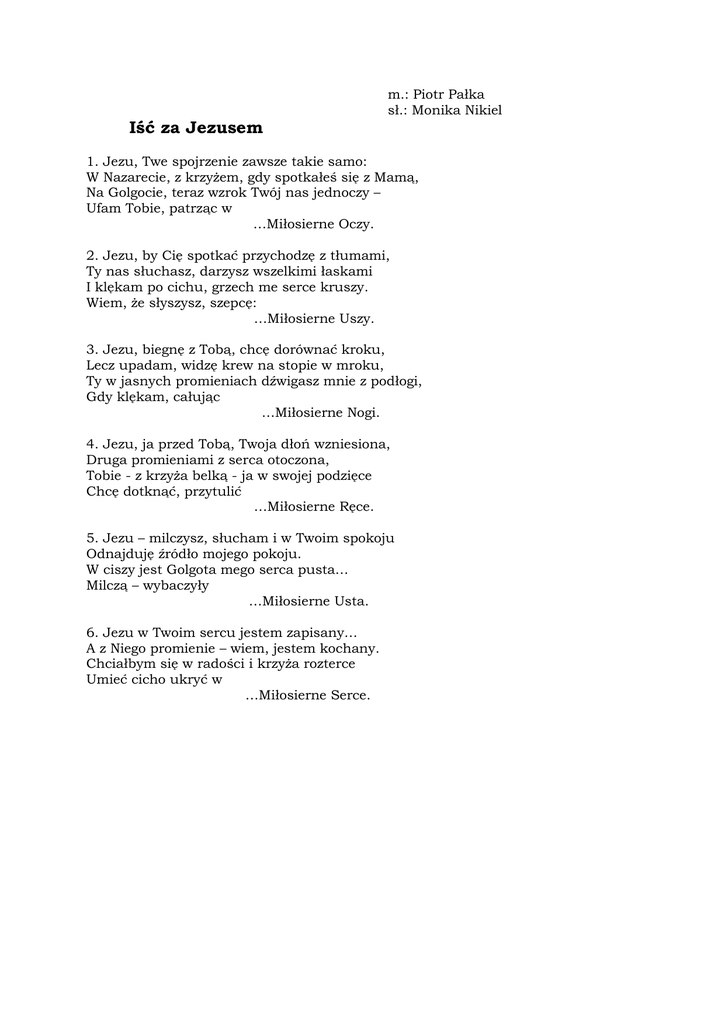 m.: Piotr Pałka sł.: Monika Nikiel Iść za Jezusem 1. Jezu, Twe spojrzenie zawsze takie samo: W Nazarecie, z krzyżem, gdy spotkałeś się z Mamą, Na Golgocie, teraz wzrok Twój nas jednoczy – Ufam Tobie, patrząc w …Miłosierne Oczy. 2. Jezu, by Cię spotkać przychodzę z tłumami, Ty nas słuchasz, darzysz wszelkimi łaskami I klękam po cichu, grzech me serce kruszy. Wiem, że słyszysz, szepcę: …Miłosierne Uszy. 3. Jezu, biegnę z Tobą, chcę dorównać kroku, Lecz upadam, widzę krew na stopie w mroku, Ty w jasnych promieniach dźwigasz mnie z podłogi, Gdy klękam, całując …Miłosierne Nogi. 4. Jezu, ja przed Tobą, Twoja dłoń wzniesiona, Druga promieniami z serca otoczona, Tobie - z krzyża belką - ja w swojej podzięce Chcę dotknąć, przytulić …Miłosierne Ręce. 5. Jezu – milczysz, słucham i w Twoim spokoju Odnajduję źródło mojego pokoju. W ciszy jest Golgota mego serca pusta… Milczą – wybaczyły …Miłosierne Usta. 6. Jezu w Twoim sercu jestem zapisany… A z Niego promienie – wiem, jestem kochany. Chciałbym się w radości i krzyża rozterce Umieć cicho ukryć w …Miłosierne Serce.